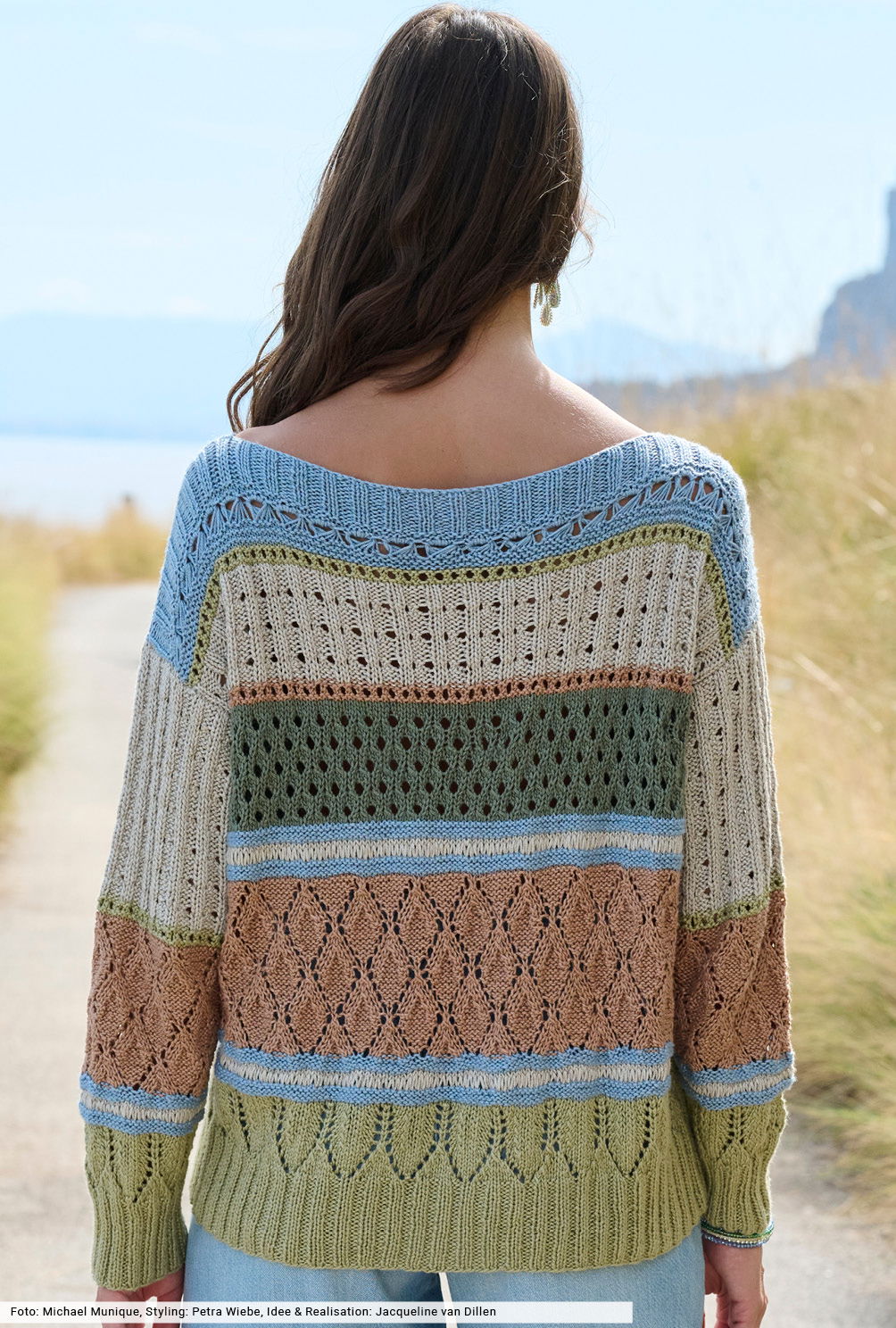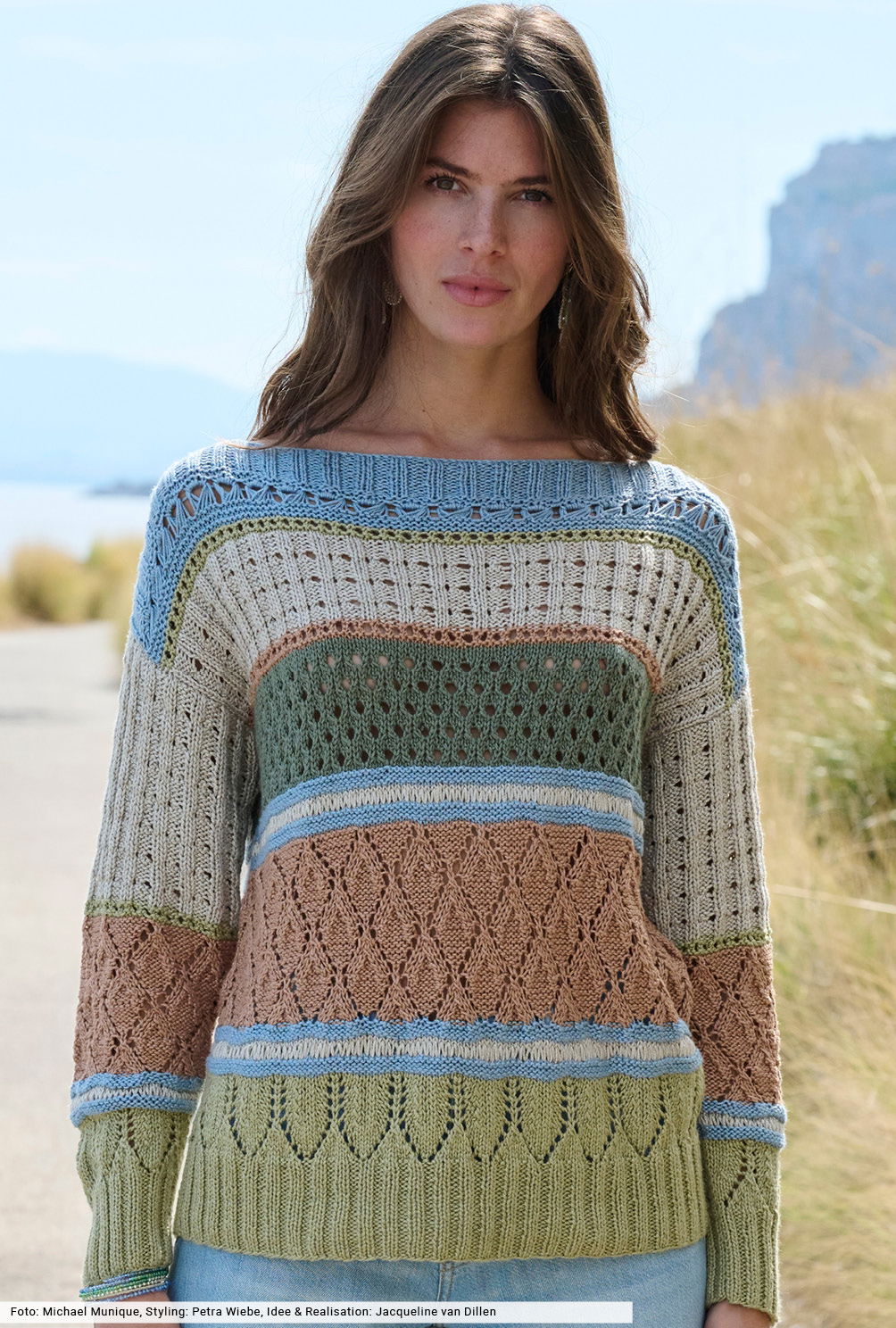 Sanftes Braun, kühles Denim sowie frische Oliv- und Khakinuancen bilden die Basis für diesen aparten Streifenmix mit Turtleneck. Dazu kommen noch jede Menge unterschiedlicher Loch- und Ajourmuster, für die wir teilweise Strickschriften angelegt oder sie in der Anleitung genau erklärt haben. Sie bringen in Kombination mit schmalen Trennlinien Bewegung in die Masche und zeigen, wie unverfälscht und dennoch spannend sich Strick in dieser Saison präsentiert.