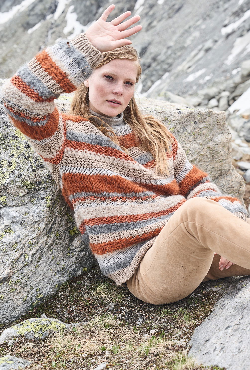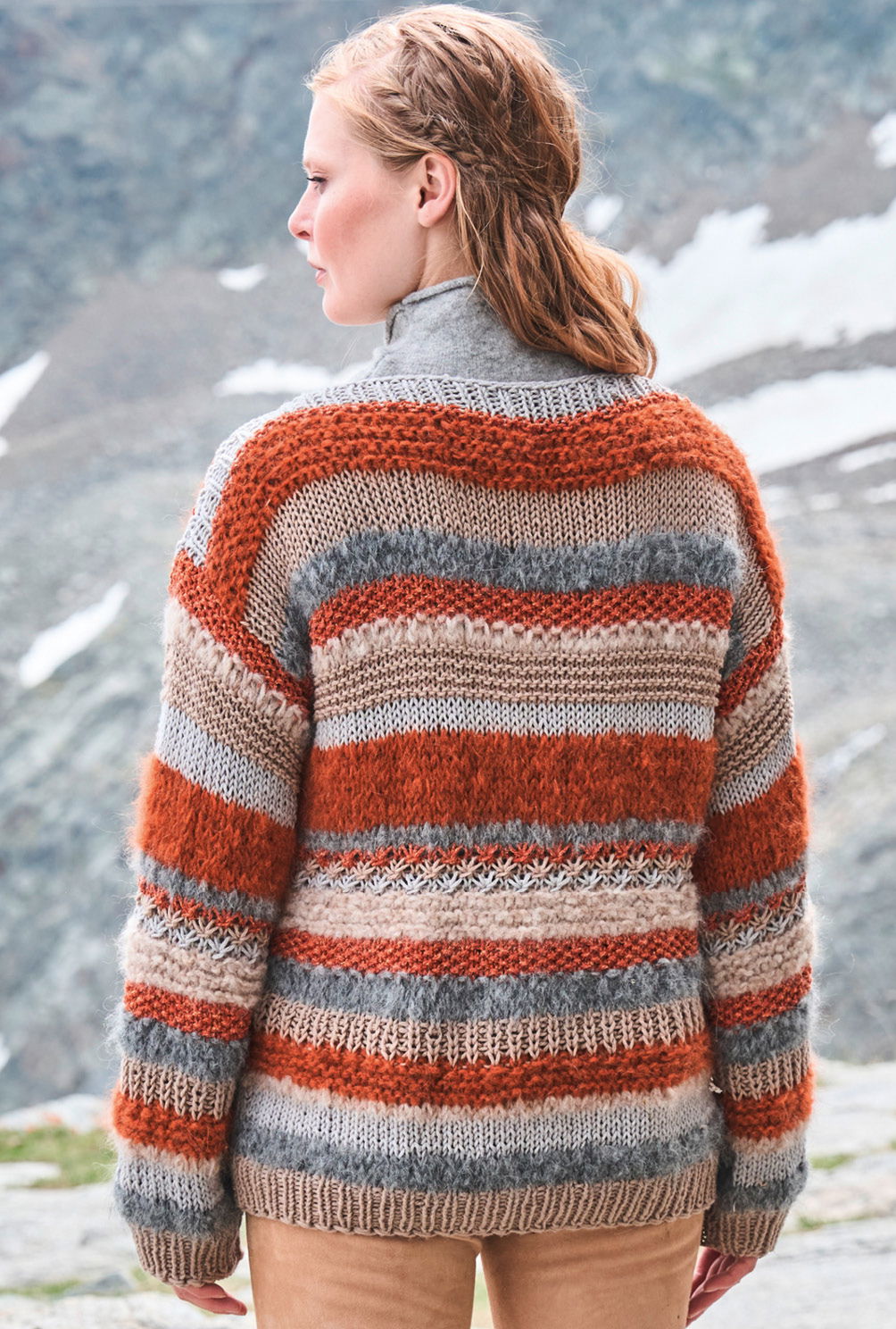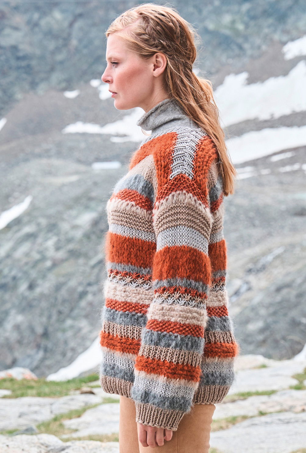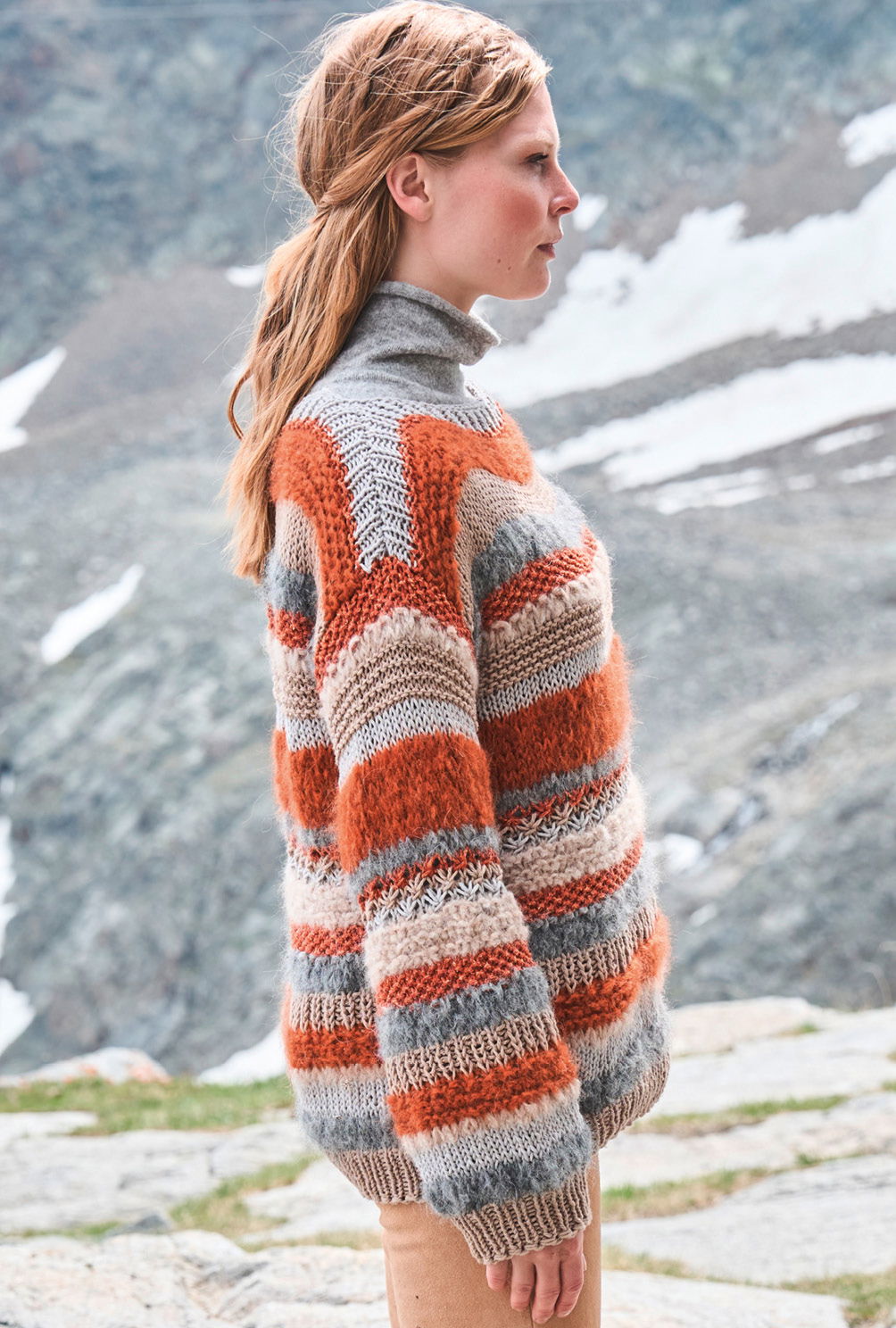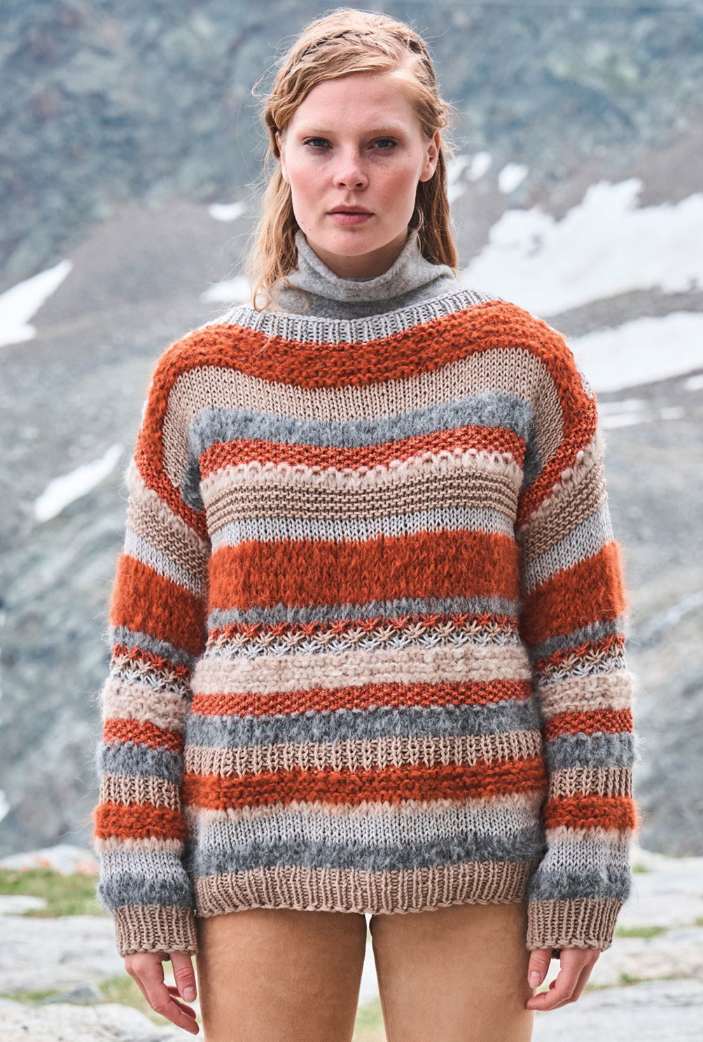Aus zwei verschiedenen Garnen und sechs unterschiedlichen Farbtönen in Camel, Grau und Kupfer setzt sich dieser Pulli mit Turtleneck zusammen. Wir haben bewusst die Schnittform möglichst unauffällig gehalten und auf Zu- und Abnahmen verzichtet. So kannst du dich voll und ganz auf den fantasievollen Musterwechsel aus glatt und kraus rechts sowie aus Perl- und Rippenstrukturen konzentrieren. Und wir versprechen: Bei diesem schönen Modell kommt beim Stricken keine Langeweile auf und das Ergebnis lohnt sich!