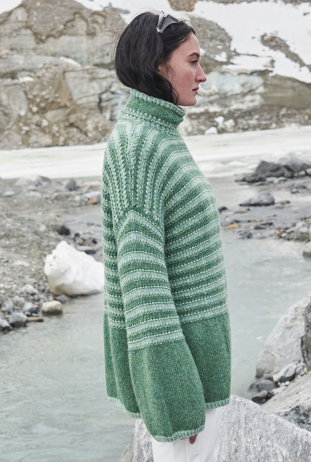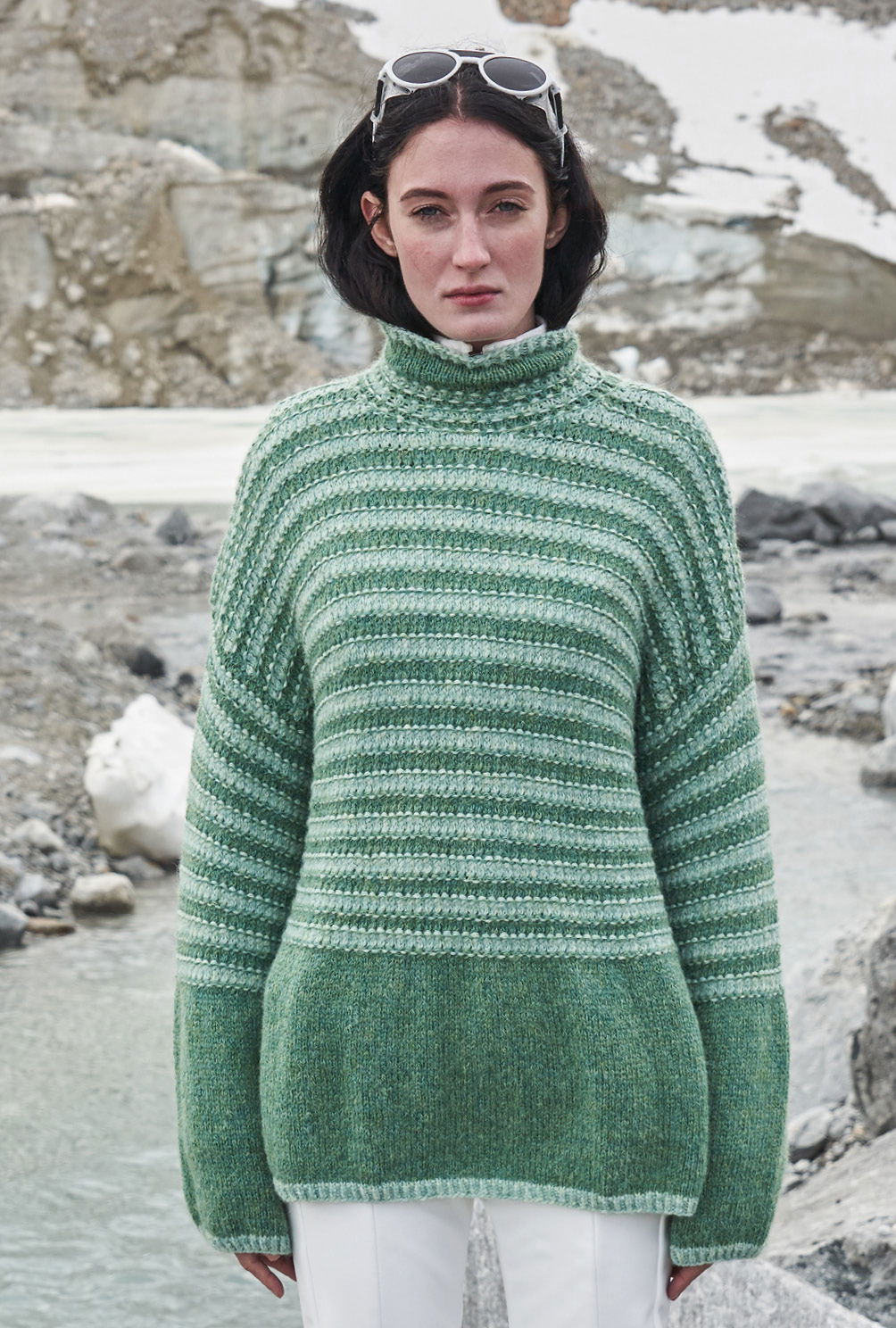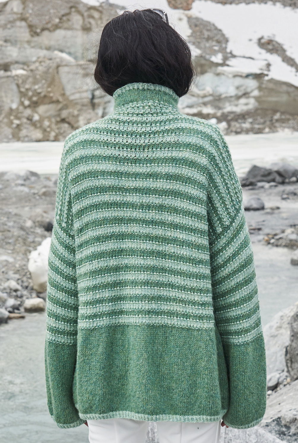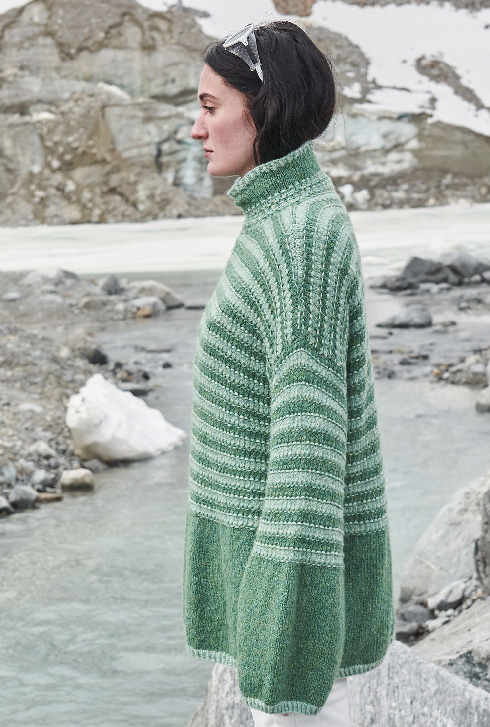 Dieser Pulli hat alles, was ein moderner Pulli benötigt: Eine lässige, weite Form, extra lange Ärmel und trendige Streifen! Dazu kommt ein modernes Garn mit klarer Kettenstruktur, dass sich sehr angenehm verarbeiten lässt und durch den Anteil an feiner Merino und Alpaka Superfine einen edlen Flausch und weiche Wärme mitbringt. Gestrickt wird in vier Teilen. Erst das Rückenteil: Hier wird mit dem ganz schmalen Bündchen begonnen, dann erst einmal uni und glatt rechts gearbeitet, bis es Zeit für die Streifenfolge und das kleine, unkomplizierte Strukturmuster wird. Die Schultern bekommen eine moderate Schrägung. Das Vorderteil wird ebenso gearbeitet – lediglich mit einem etwas tieferem Halsausschnitt. Dann nur noch die Ärmel, dann wird bereits mit der Ausarbeitung begonnen. Die Schulternähte schließen, aus dem Halsausschnitt den Stehkragen herausstricken und im Anschluss die Ärmel einsetzen und die restlichen Nähte schließen.
