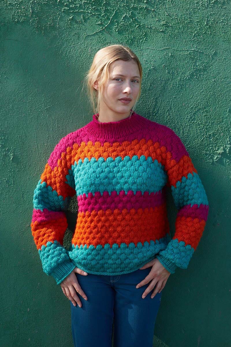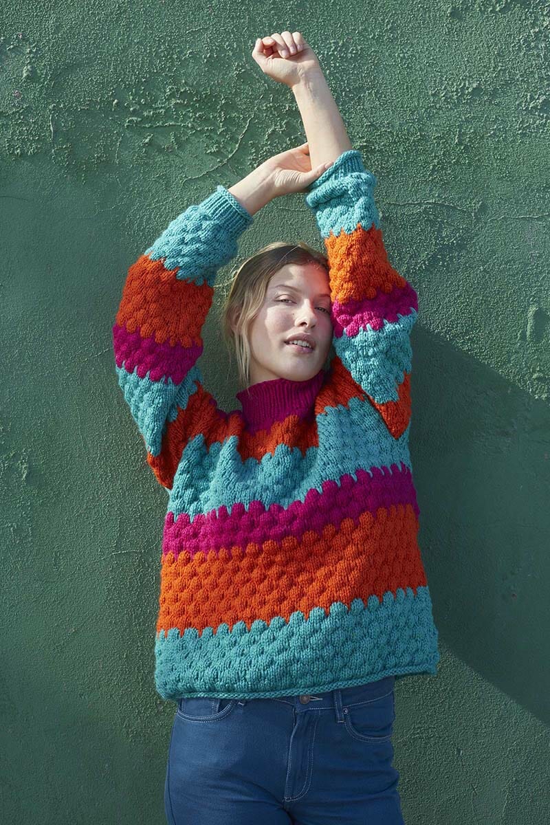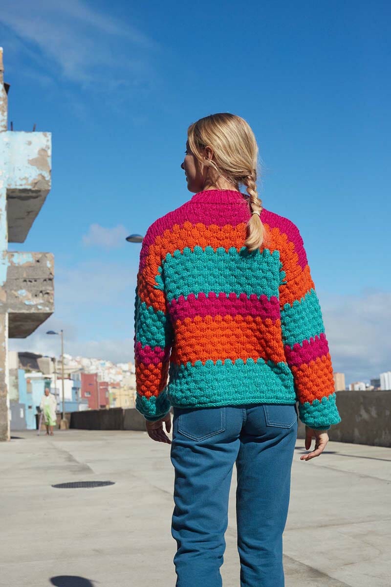 This is the ultimate eye-catcher of our entire WOOLADDICTS collection. The sweater is so colorful that it instantly makes you happy. It elevates your mood. The design might remind you of little popcorn stitches. It gives a fun result.