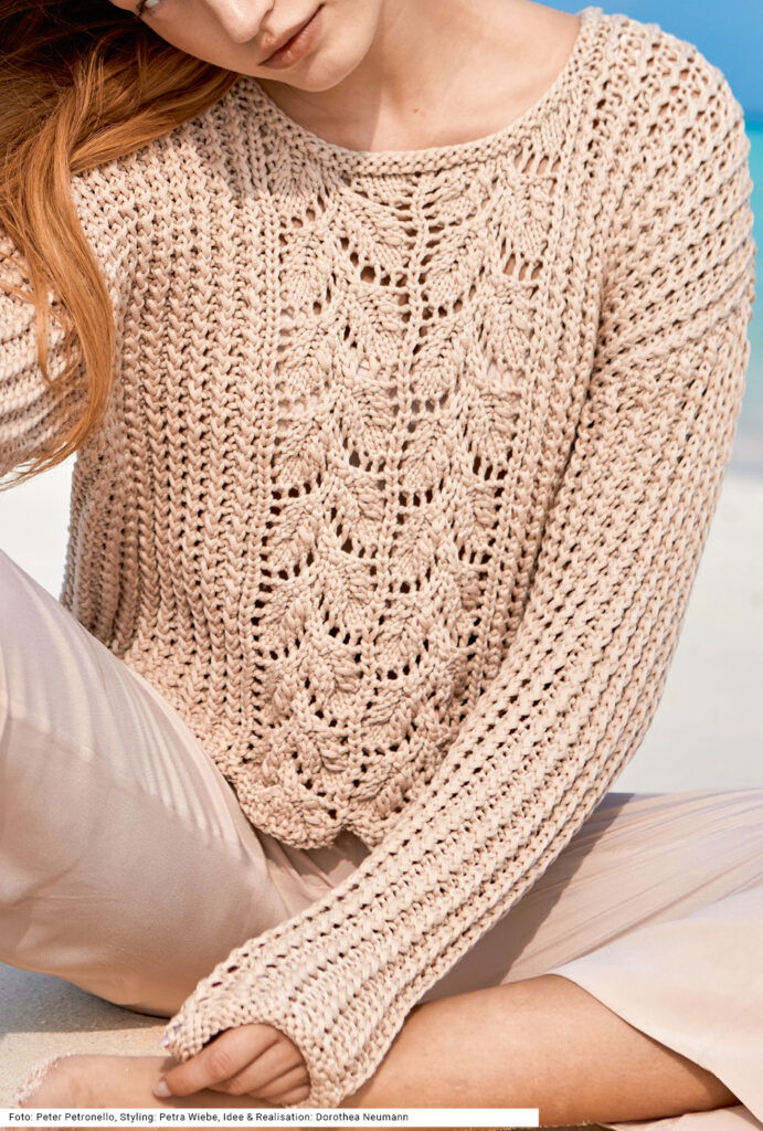 Entdecke den beigefarbenen gestrickten Lochmuster-Pulli, der mit einem Mittelmuster aus filigranen Blattstrukturen auf der Vorderseite verziert ist. Die seitlichen Partien und Ärmel sind mit einfachen Rippenmuster gestaltet, was aus edlem Schlauchgarn einen Pullover der Extraklasse macht. Dieses tolle Sommerstück ist leicht zu tragen und perfekt für einen entspannten Strandtag im Urlaub. Genieße den Komfort und die Eleganz dieses Pullovers, der dich bei warmen Temperaturen stilvoll begleitet.