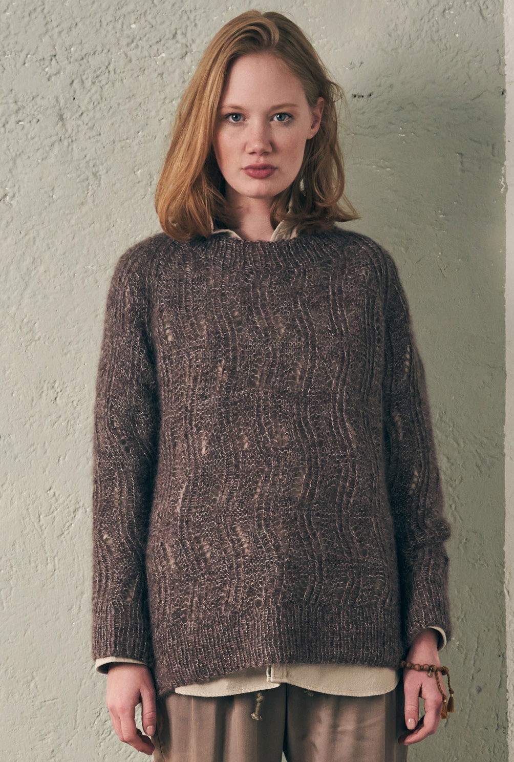 Greige, Silbergrau und Aubergine werden hier zusammen verstrickt – daraus entsteht eine Nuance, die unvergleichlich schön ist. Mit einem wellenförmigen Ajourmuster und dem lässigen Raglanschnitt wird daraus ein echtes Maschen-Highlight für entspannte Stunden. Zugegeben, das Lochmuster benötigt zwar ein wenig Aufmerksamkeit, aber die klare Strickschrift in der Anleitung hilft dabei, stets den Überblick zu behalten. Dreifädig mit Nadelstärke 4,5 gestrickt, geht es auch recht zügig voran. Gestrickt wird in einzelnen Teilen von unten nach oben. Sind alle vier Teile fertig gestrickt, werden noch alle Nähte geschlossen und aus dem Halsausschnitt die schmale Blende im Rippenmuster herausgestrickt. Am besten nimmt der fertige Pulli jetzt noch ein kleines Bad und wird im Liegen getrocknet. Dabei schön in Form bringen und glattstreichen – so öffnet sich das Lacemuster und entfaltet seine ganze Pracht.
