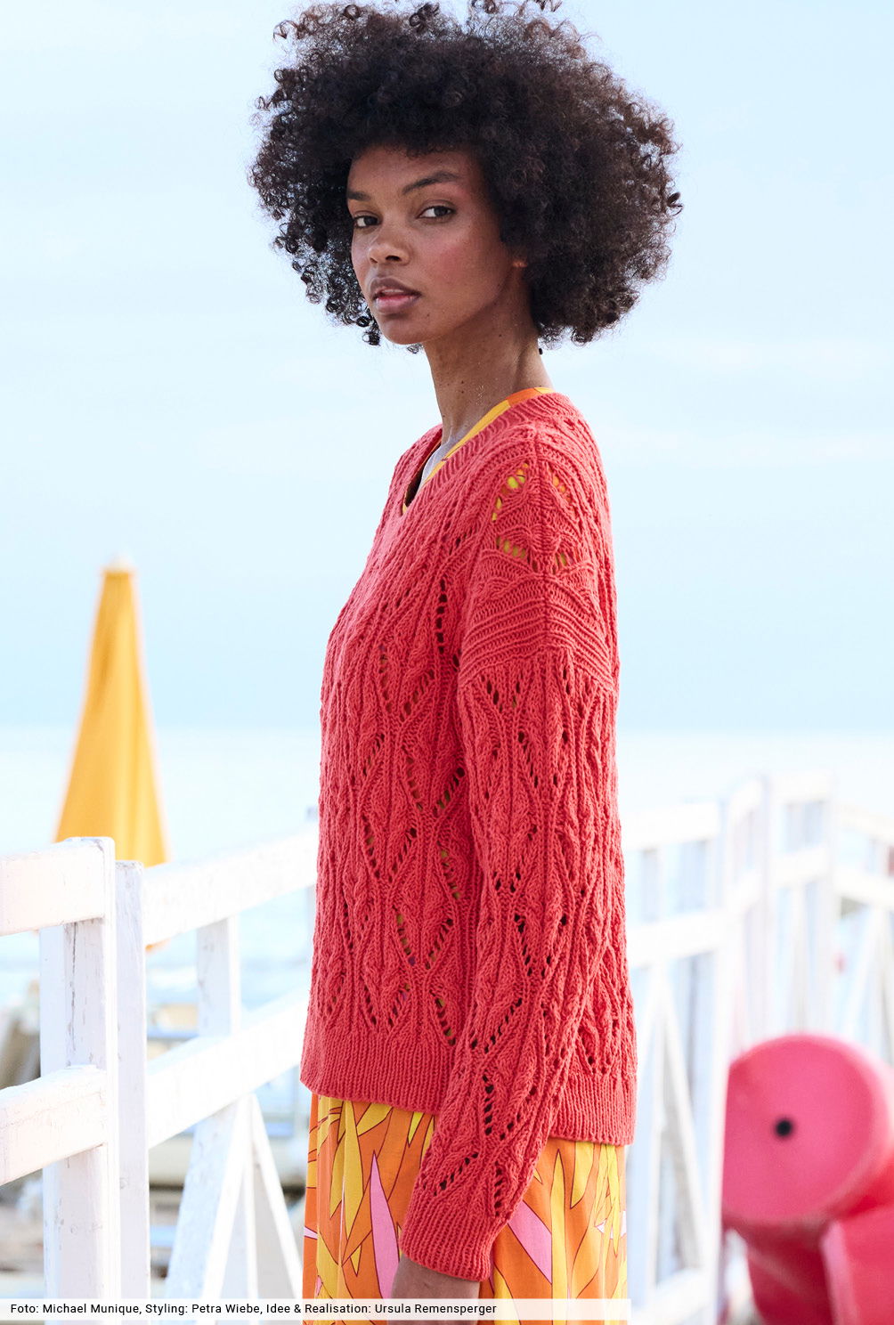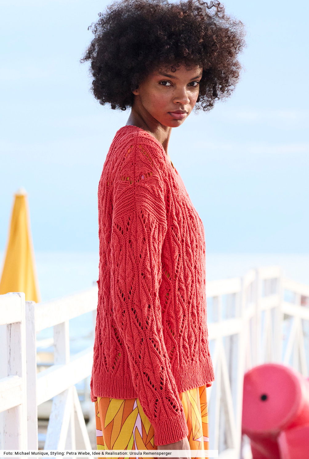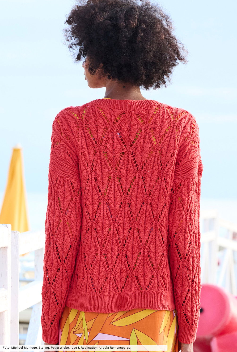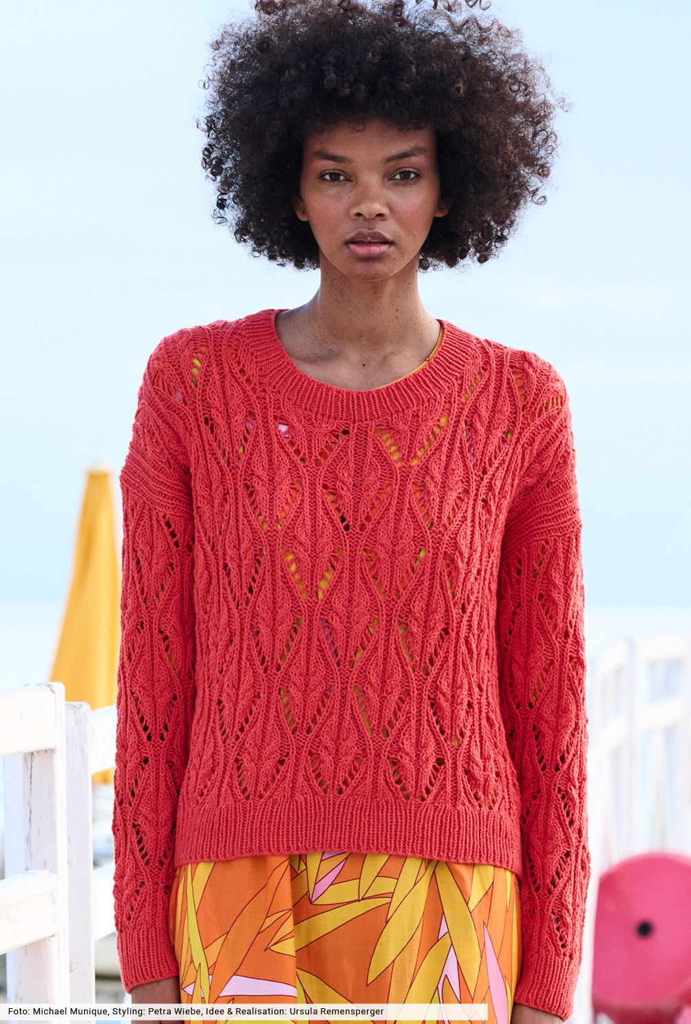 Dieser Pulli in leuchtendem Tomatenrot bringt nicht nur durch de Farbe gute Laune in jeden Look. Besonders apart ist das Muster: Hier werden Lochrauten mit verkreuzten Maschen kombiniert – ein toller Mix, für den wir eine übersichtliche Strickschrift erstellt haben, mit der du Reihe für Reihe zum Ziel kommst. Zum Schluss wird das Ganze durch Bündchen und Blenden in klassischer Rippenoptik eingerahmt.