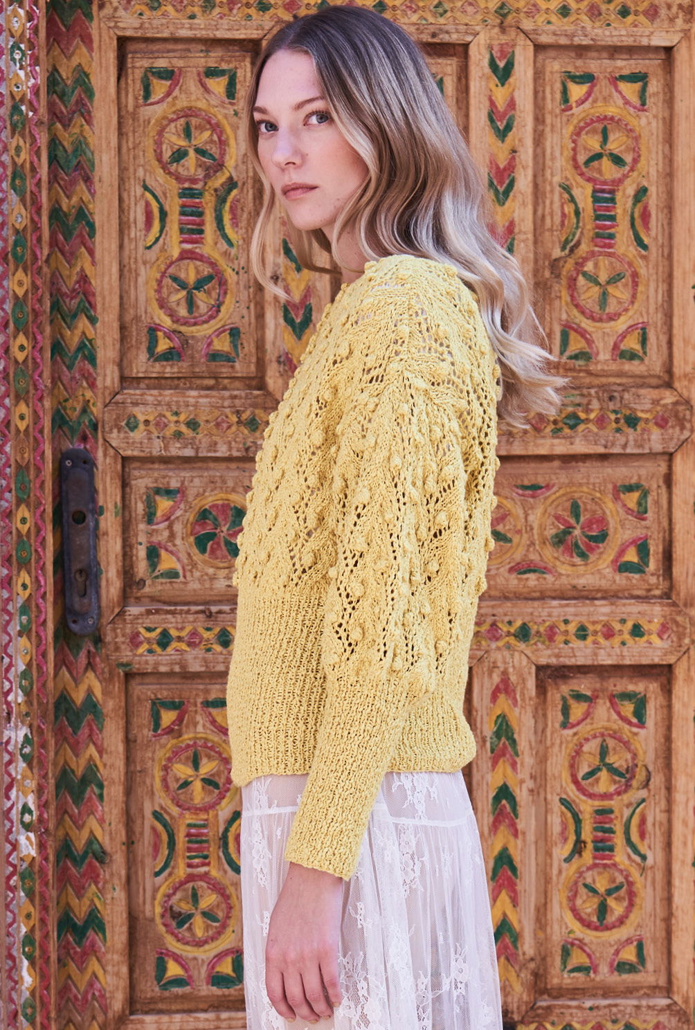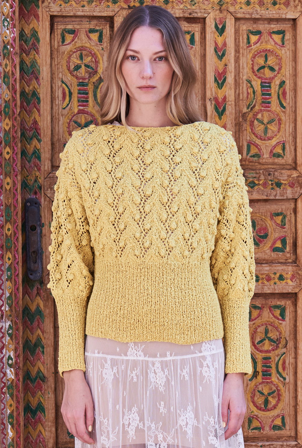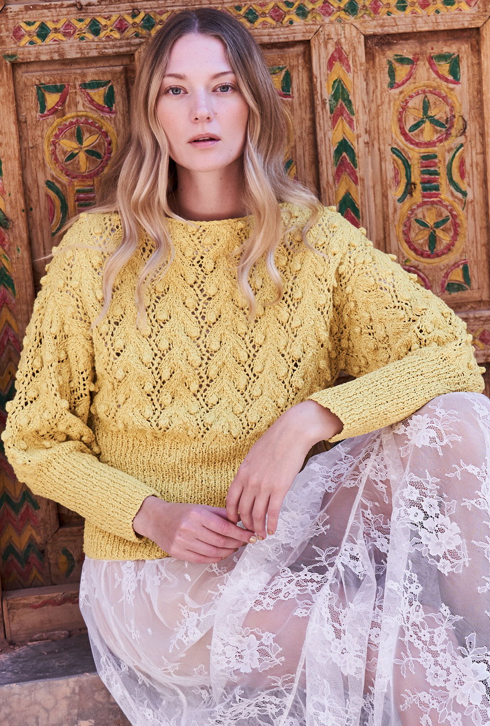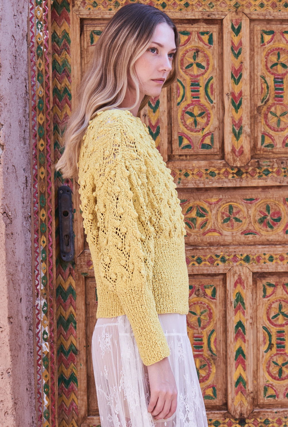 Eine gelungene Kombination: Das extra hohe Rippenbündchen bringt den Pulli über der Hüfte und der Taille auf Form, während das Ajour-Noppenmuster die lässige Weite des oberen Parts unterstreicht. Gestrickt wird der Sommerpulli in Einzelteilen von unten nach oben. Begonnen werden alle Teile mit dem hohen Rippenbündchen, dann wird das Lochmuster mit seinen aparten Noppen all over gestrickt. Ein wenig Aufmerksamkeit verlang das Ajourmuster durchaus, aber die übersichtliche Strickschrift hilft dabei, stets den Überblick zu behalten. Die Noppen werden übrigens nicht gestrickt, sondern gehäkelt. Dadurch sehen sie ganz besonders gleichmäßig aus und lassen sich zudem ohne das lästige Wenden der Arbeit herstellen, welches bei gestrickten Noppen unumgänglich ist. Sind alle Teile fertig gestrickt, werden noch alle Nähte geschlossen und der Halsausschnitt wird noch mit einer Runde stabilisierender, dekorativer Krebsmaschen umhäkelt.