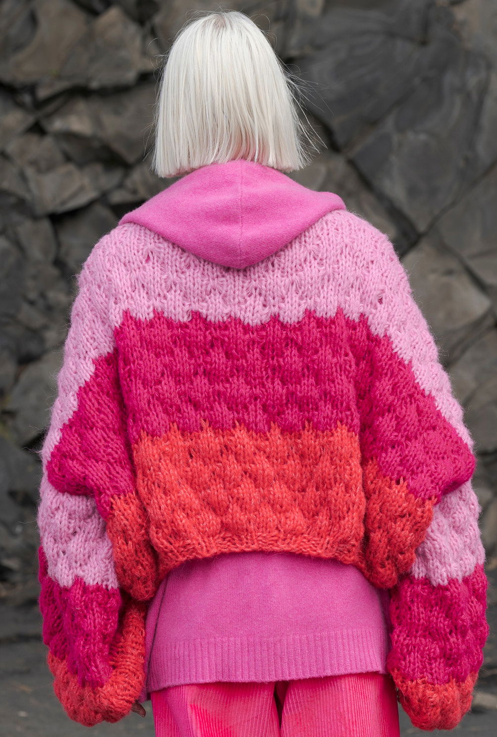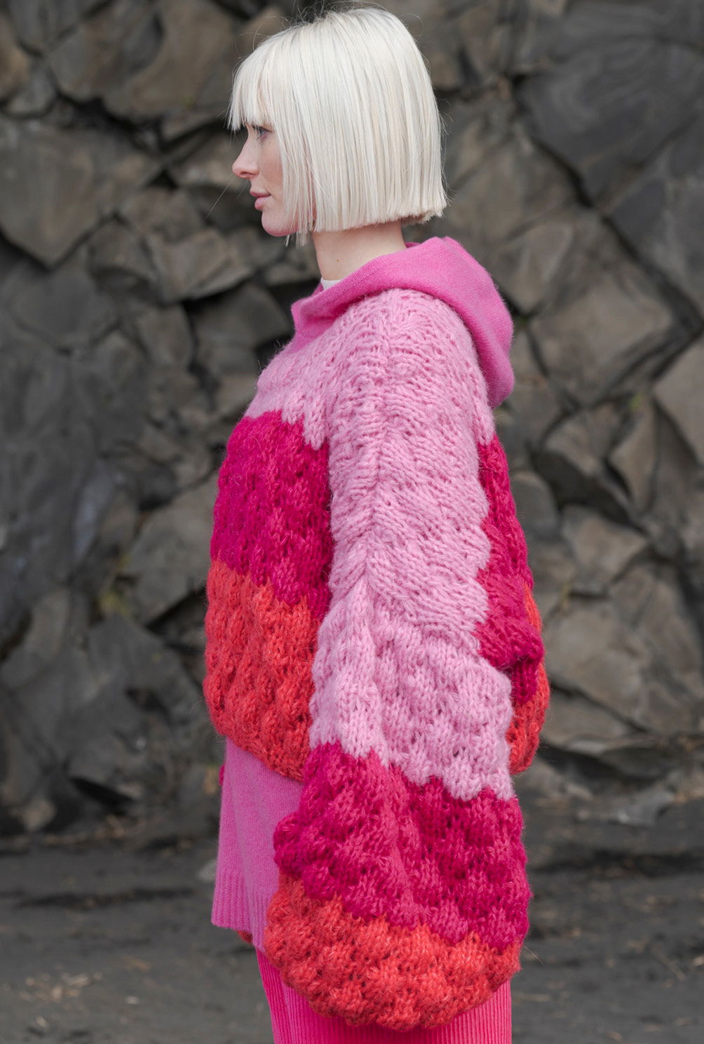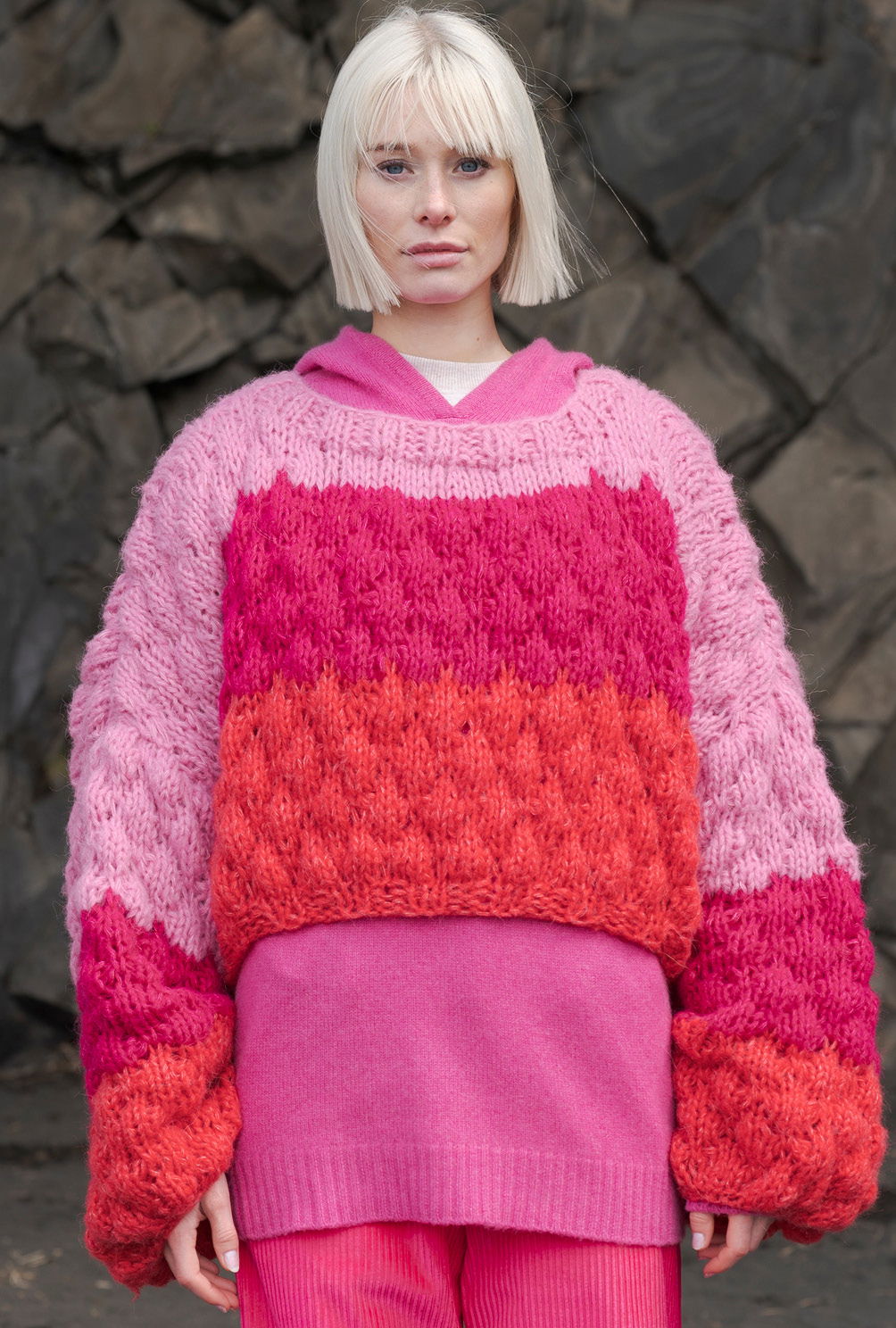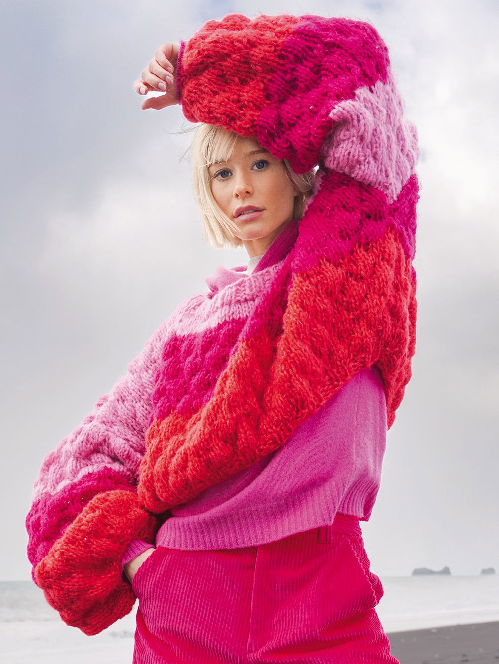 Die Basis für diesen trendigen Kurzpulli bildet ein feines Mohairgarn, das wir fünffädig verstrickt haben. Er wiegt trotzdem nicht viel, obwohl auch das voluminöse Ballonmuster und die modischen Keulenärmel einiges an Material verbrauchen. Die taillenkurze Form bietet viel Raum für farbige Accessoires darunter und das dreifarbige Streifendesign macht ihn zum Stimmungsbooster an grauen Tagen. Eine schmale Rippenblende bildet den Abschluss für dieses tolle Strick-Highlight.