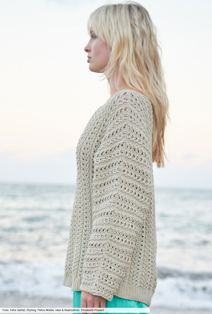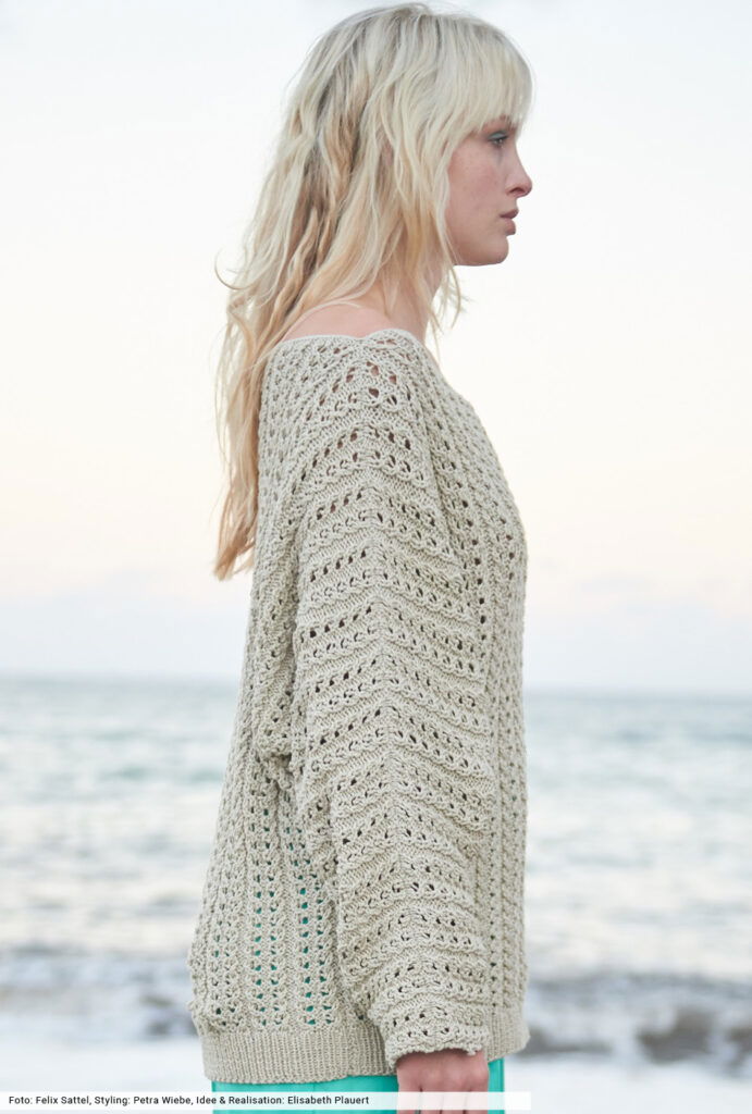 Mit leichten Styles läutet Strick den Frühling ein. Hier sind es schmale Ajourstreifen, die den Pulli aus griffigem Baumwoll-Bändchen allover überziehen. Die lässige Ausstrahlung erzielt er durch die Fledermausärmel, die gleich mit angestrickt werden. Dann nur noch zusamennähen und die Halsausschnitt mit einer Runde Kettmaschen umhäkeln – fertig ist ein Stück fürs Leben! Und ein Stück, an das sich auch weniger versierte Strickerinnen wagen können.