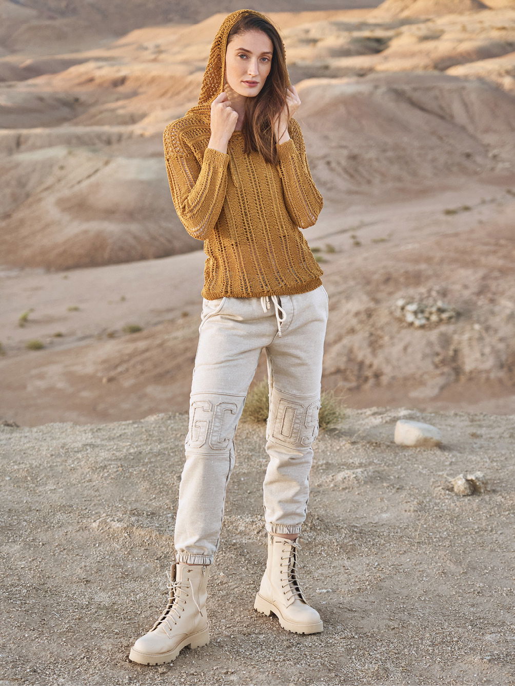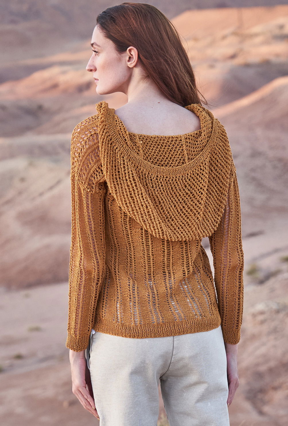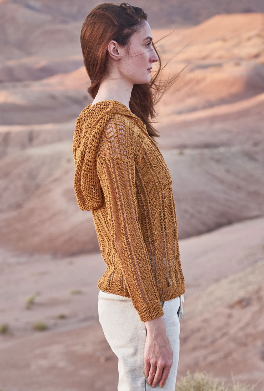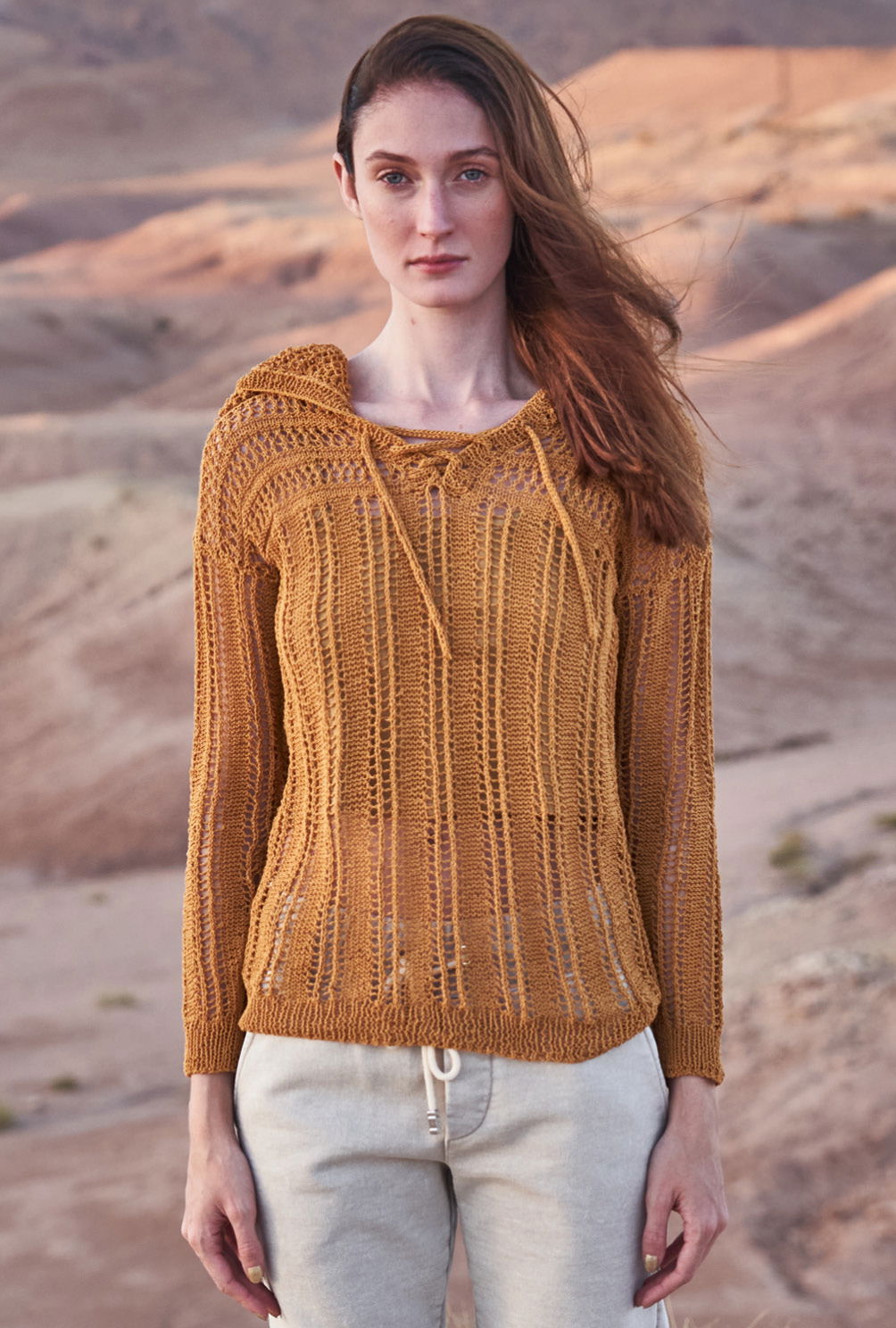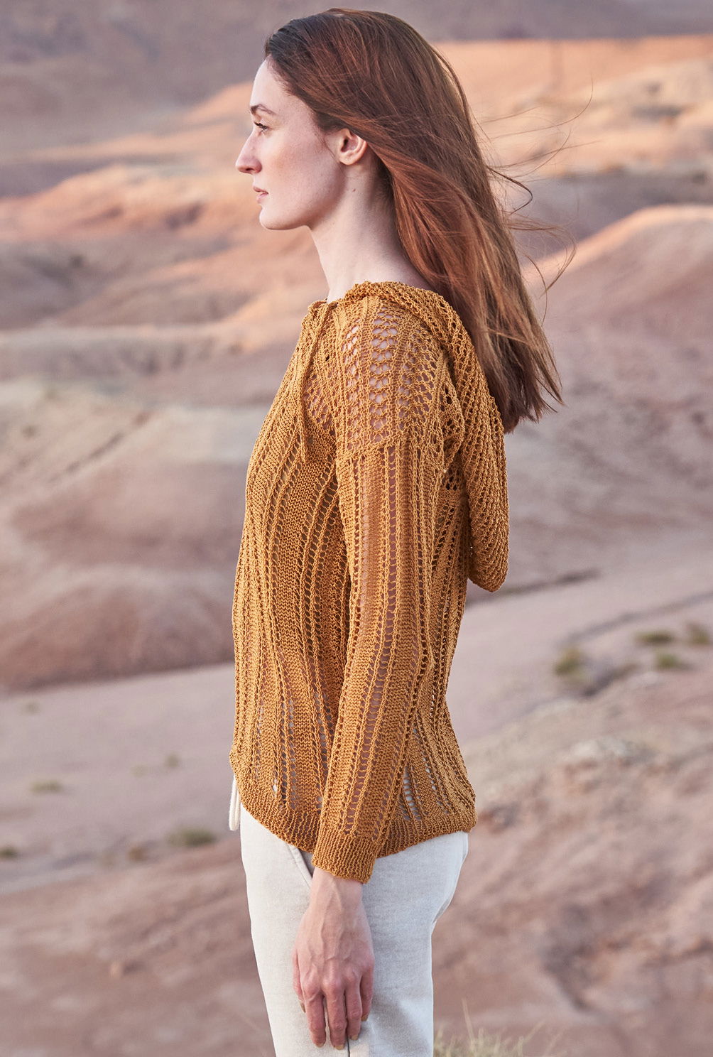 Mal längs, mal quer bringen bei diesem Hoody die transparenten Lochstreifen nicht nur Luft an die Haut, sondern gestalten auch ein Maschenbild, das sich durch glänzendes Bändchengarn besonders wirkungsvoll in Szene setzt. Durch den hohen Baumwollanteil trägt sich das Garn zudem herrlich weich und angenehm. Rückenteil, Vorderteil und Ärmel beginnen alle mit einem Rippenmuster, dass das folgende Lochmuster optisch umrahmt und für die nötige Form sorgt. Das Lochrippenmuster ist nicht kompliziert zu stricken und wird in der Anleitung eingehend erklärt. Im Anschluss daran folgt dann das Querrippenmuster, hier sollte bei Abnahmen und Zunahmen darauf geachtet werden, dass sich Umschläge und zusammengestrickte Maschen ausgleichen. Hierauf sollte auch bei den komplett im Lochrippenmuster gestrickten Ärmeln aufgepasst werden. Auch die Kapuze wird im Lochmuster gestrickt. Ganz zum Schluss noch eine Kordel stricken, dann geht es an die Fertigstellung: Die Nähte schließen, die Kapuze einnähen und sowohl die Blende des Halsausschnitts, als auch die der Kapuze im Rippenmuster anstricken. Am besten bekommt der Pullover vor den ersten tragen noch ein kleines Bad und wird liegend schön ausgestrichen getrocknet. Dadurch legt sich das schöne Lochmuster richtig und entfaltet seine ganze Schönheit.
