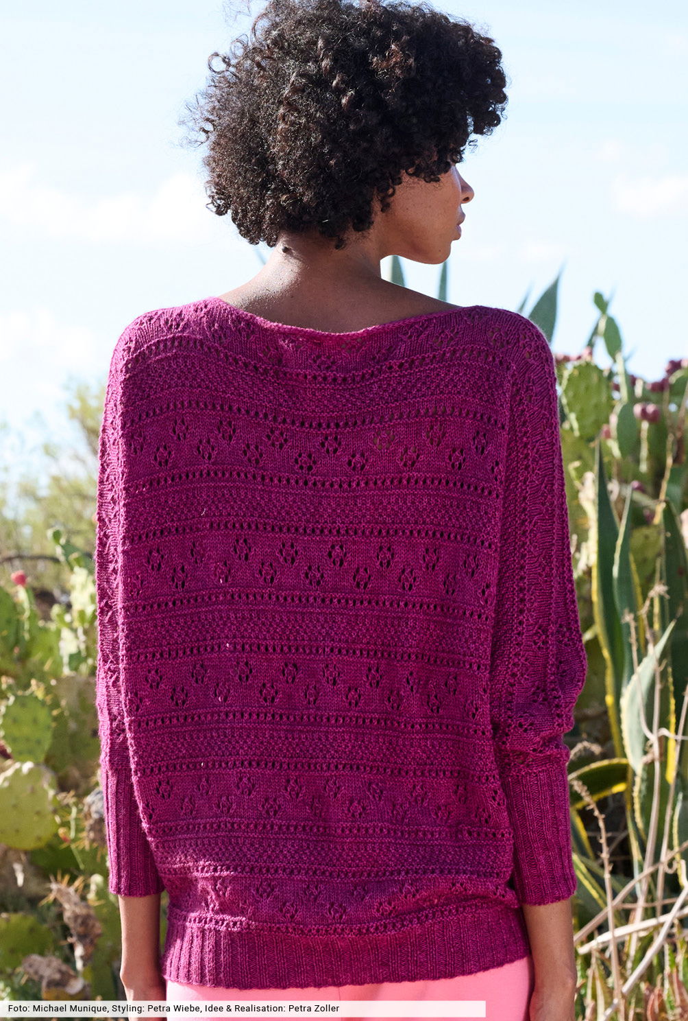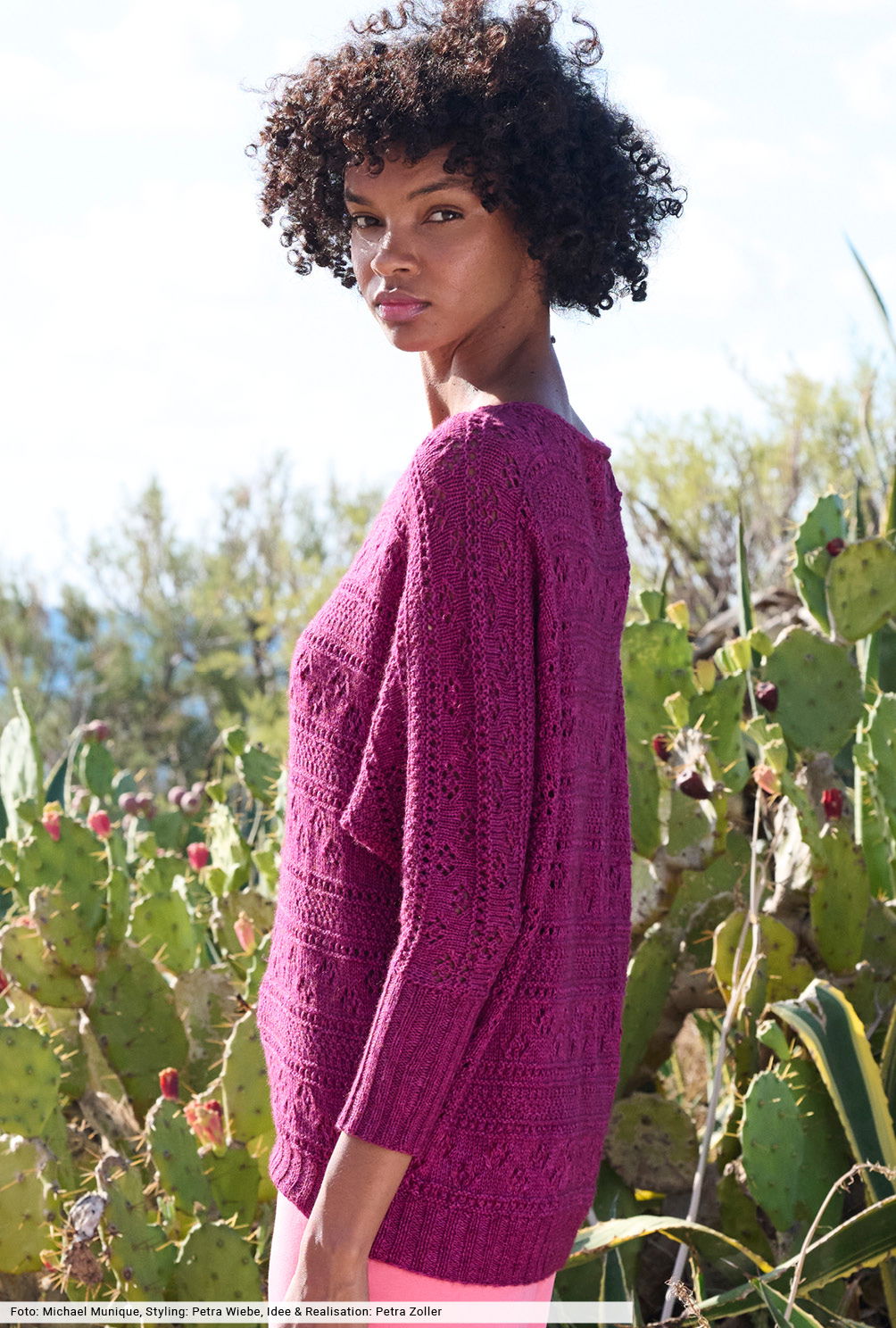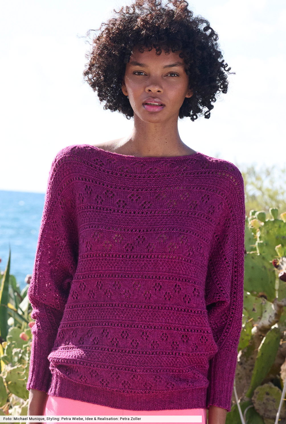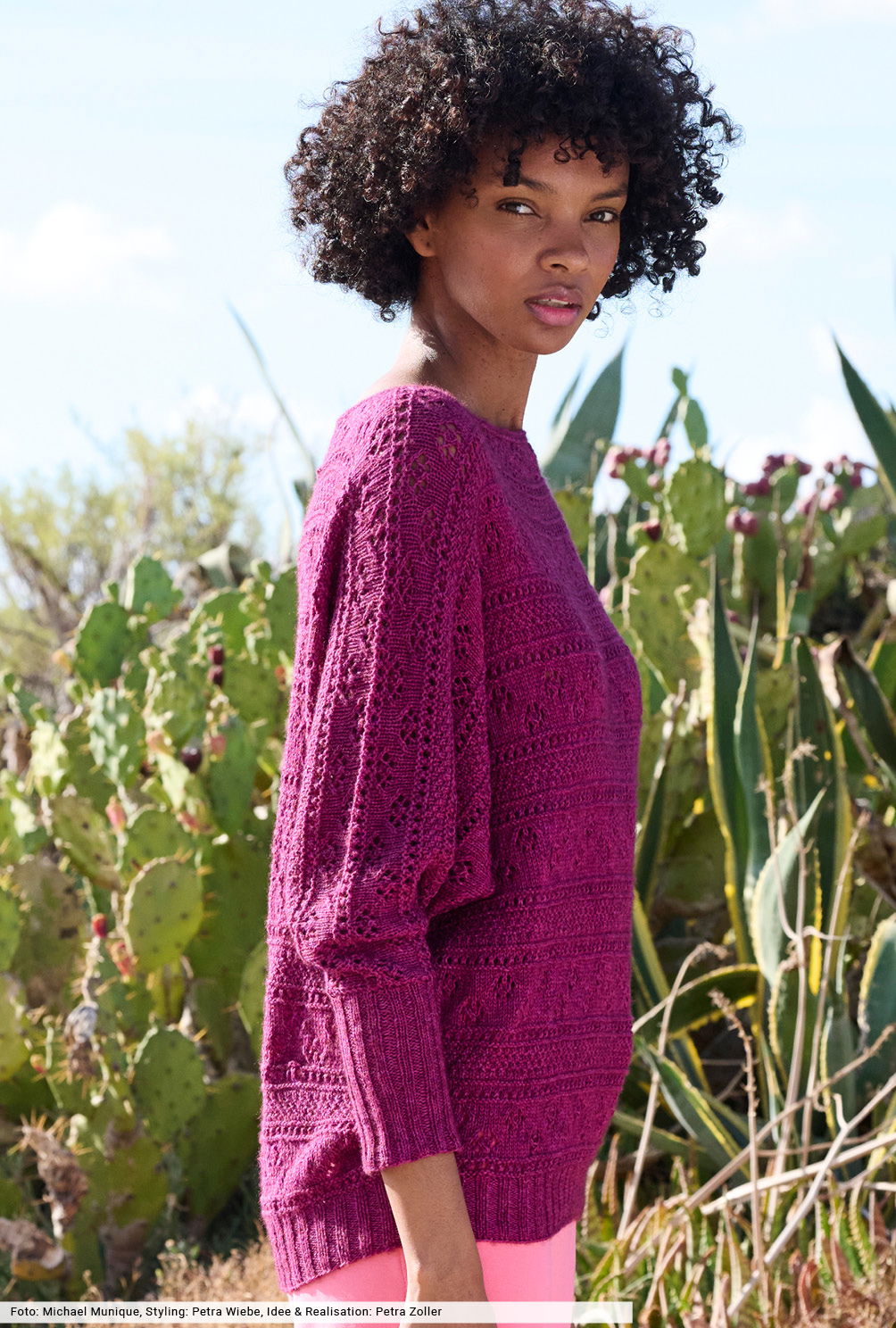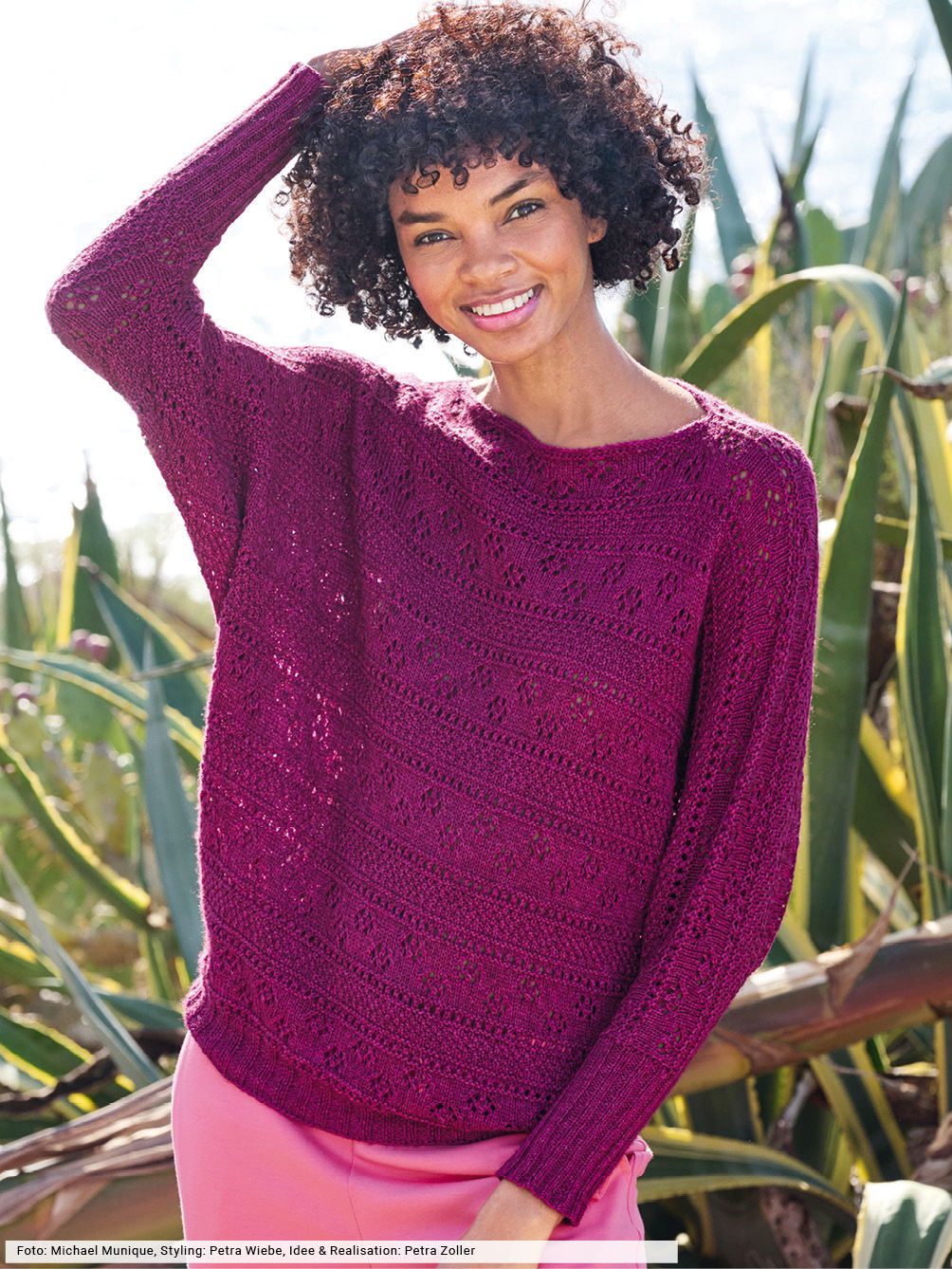 Strahlend schön: Zarte Ajour- und Lochmusterstreifen brechen hier den kräftigen Zyklamton raffiniert auf. Daraus entsteht ein lässig-weiter Sommerpulli, dessen Kimonoform durch seitliche Zunahmen entsteht und dessen fließende Konturen den Körper sanft umschmeicheln. Hinzu kommt ein wunderschönes Garn, bei dem sich zur Baumwolle auch Yak- und Schurwollfasern gesellen. Zum Schluss die Ärmelkanten mit hohen Rippenbündchen ausstatten und den Halsausschnitt mit Kettmaschen umhäkeln – fertig ist ein weiteres Lieblingsstück in deiner Garderobe,