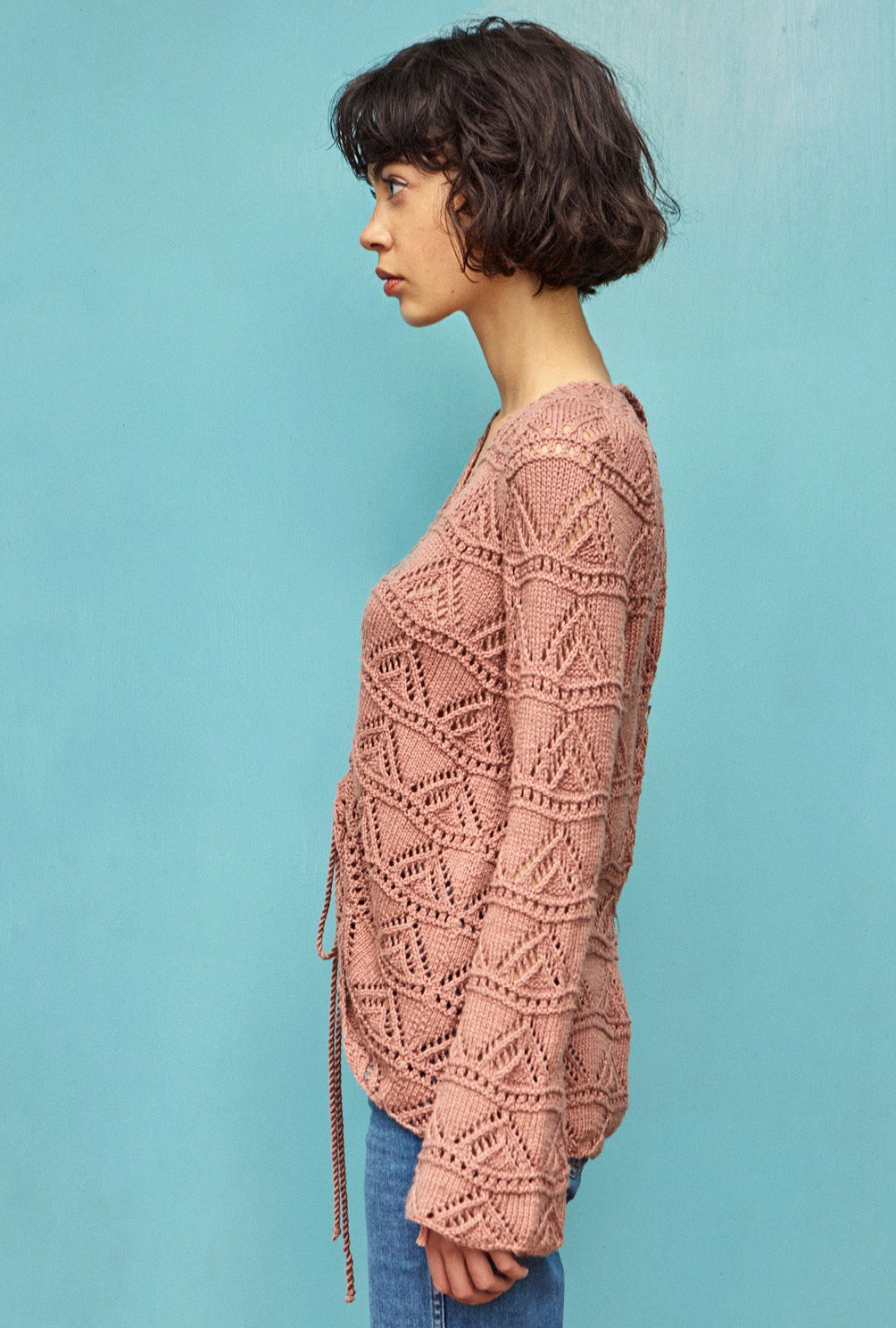Dieser Pulli begeistert nicht nur durch seine charmante Ajourmuster- Optik, sondern auch durch das geraffte Vorderteil und die Trompetenärmel. Das Zusammenspiel dieser Komponenten macht den Sommerpulli so leicht, beschwingt und feminin! Gestrickt wird in Einzelteilen von unten nach oben. Gleich nach dem Anschlag geht es auch schon los mit der Musterfolge aus dem Ajourmuster, kraus rechts Reihen, Lochmuster und glatt rechts gestrickten Reihen. Die Muster sind nicht sonderlich schwierig zu stricken und die übersichtliche Strickschrift hilft bei dem Ajourmuster zusätzlich dabei, den Überblick zu behalten. Sind das Vorderteil, das Rückenteil und die Ärmel fertig, wird noch die Kordelzugblende gestrickt. Diese wird dann mittig auf die Rückseite des Vorderteils genäht und die Kordel aus sechs Einzelfäden eingezogen. Dann werden die Nähte geschlossen und der Ausschnitt noch mit einer Runde Krebsmaschen umhäkelt.