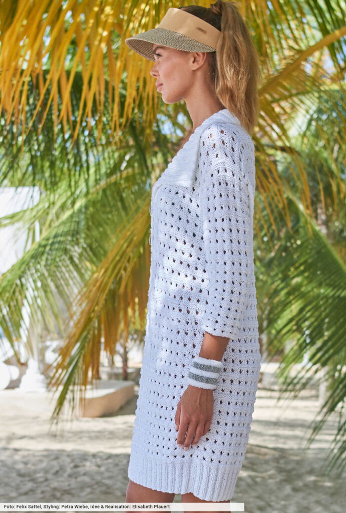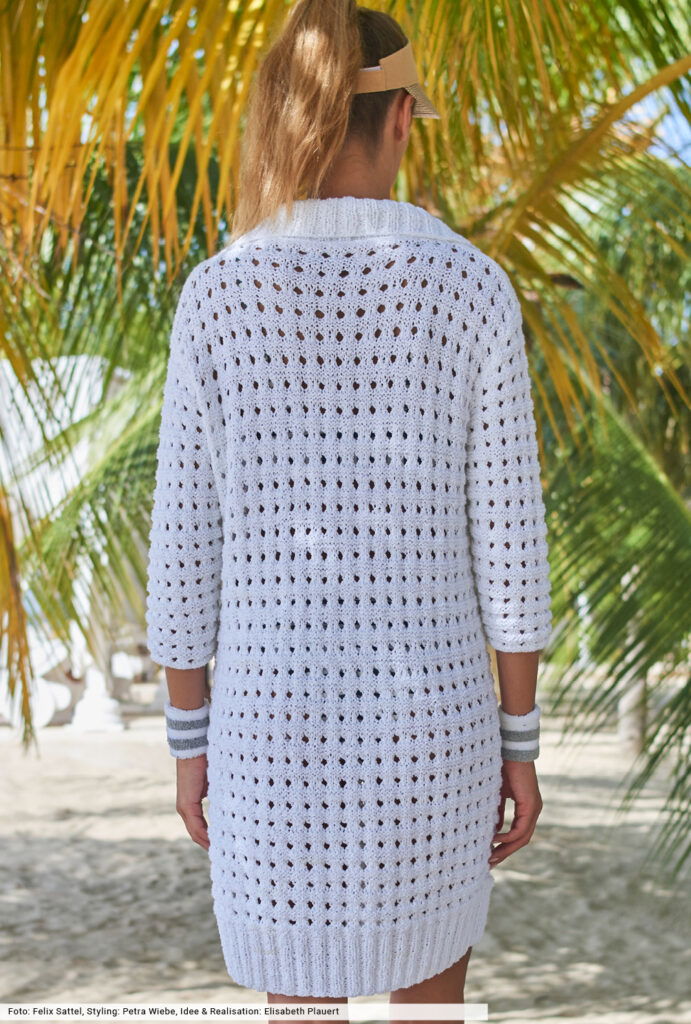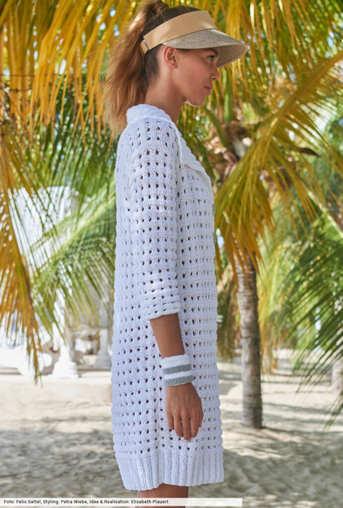 Eins zu null für dieses Polokleid, dessen Frotteegarn sommerliche Leichtigkeit verspricht. Aber auch das luftige Lochmuster, für das es in der Anleitung eine genaue Beschreibung gibt, ist ein Wohlfühlgarant an heißen Tagen und lässt viel Luft an die Haut. Die schmalen Dreiviertel-Ärmel und der modische Polokragen vermitteln lässige Sportivität, zwei Knöpfe zieren die Rippenblende.