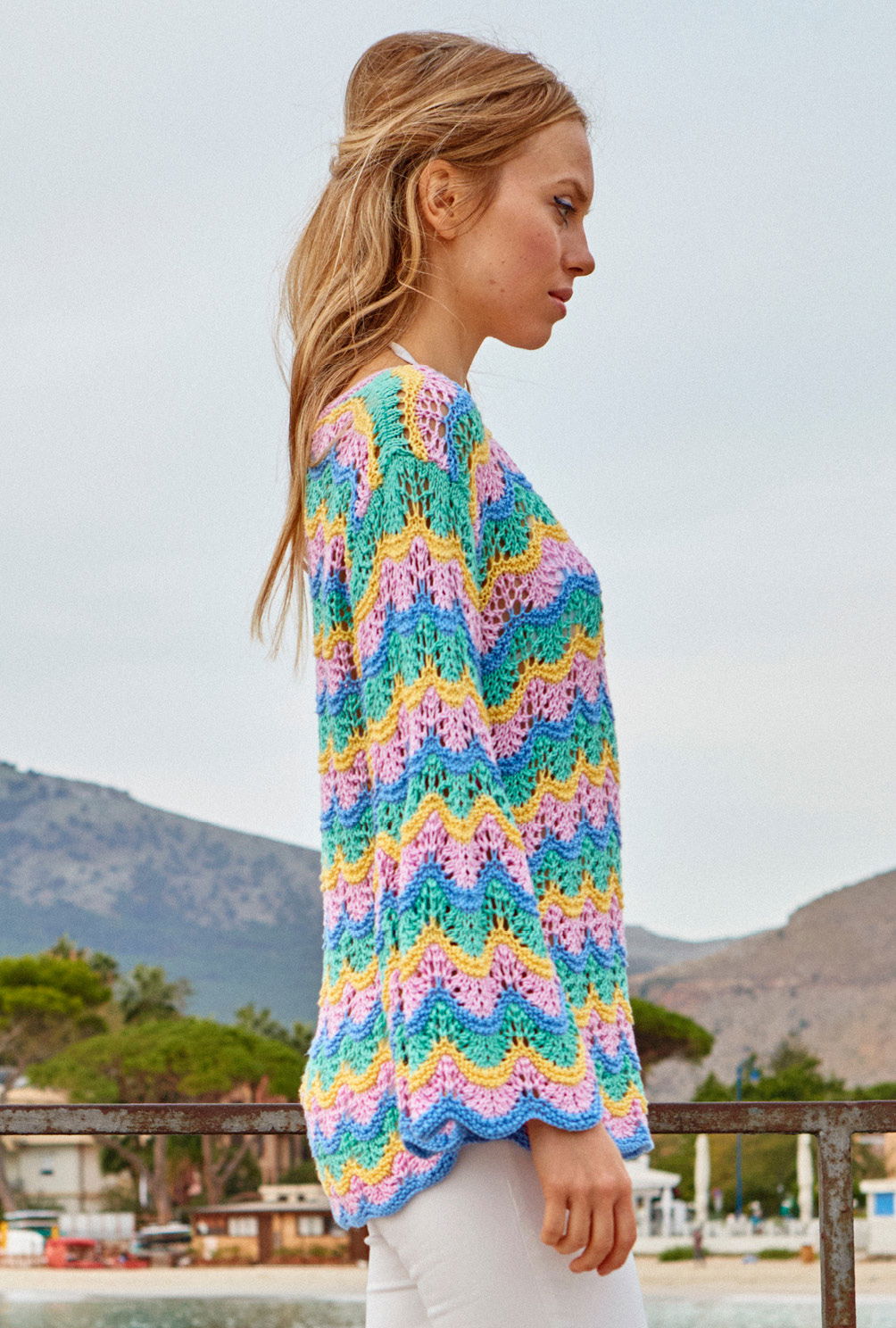 Bei diesem Pulli im Wellen- oder Pfauenmuster wechseln sich Streifen in Magnolie, Mint und Gelb harmonisch ab und betonen dabei noch den weichen Verlauf der Wellen. Als schönes Detail kommen noch die femininen Trompetenärmel hinzu – aus angenehmer Viskose gestrickt fallen sie ganz besonders weich und fließend! Das Muster ist nicht sonderlich kompliziert und wird ausführlich Reihe für Reihe in der Anleitung erklärt – ebenso die Streifenfolgen. Gestrickt wird in Einzelteilen, wobei es direkt nach dem Anschlag auch schon mit dem Farb- und Musterspaß beginnt. Bei den Abnahmen und Zunahmen sollte darauf geachtet werden, dass sich Umschläge und zusammengestrickte Maschen im Muster stets ausgleichen. Sind alle Teile fertig gestrickt, werden noch die Nähte geschlossen und der Halsausschnitt erhält noch seine kleine, kraus rechts gestrickte Blende. Am besten nimmt der fertige Sommerpulli jetzt noch ein kleines Bad und wird im Liegen getrocknet. Dabei schön in Form bringen und glattstreichen – so öffnet sich das Lacemuster und entfaltet seine ganze Pracht. Tipp: Dieser Pulli eignet sich auch ganz prima zur Resteverwertung, so lassen sich die Streifen ohne Problem schmaler oder breiter arbeiten – je nach vorhandenem Garnvorrat kann man auch mit den Streifen einen Farbverlauf kreieren.