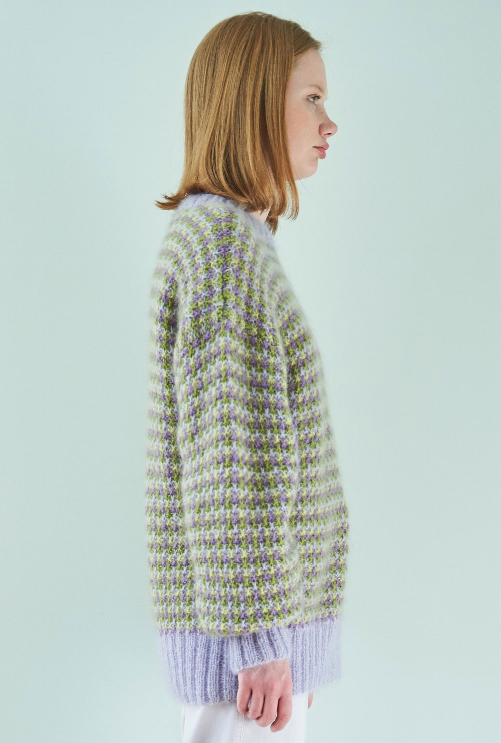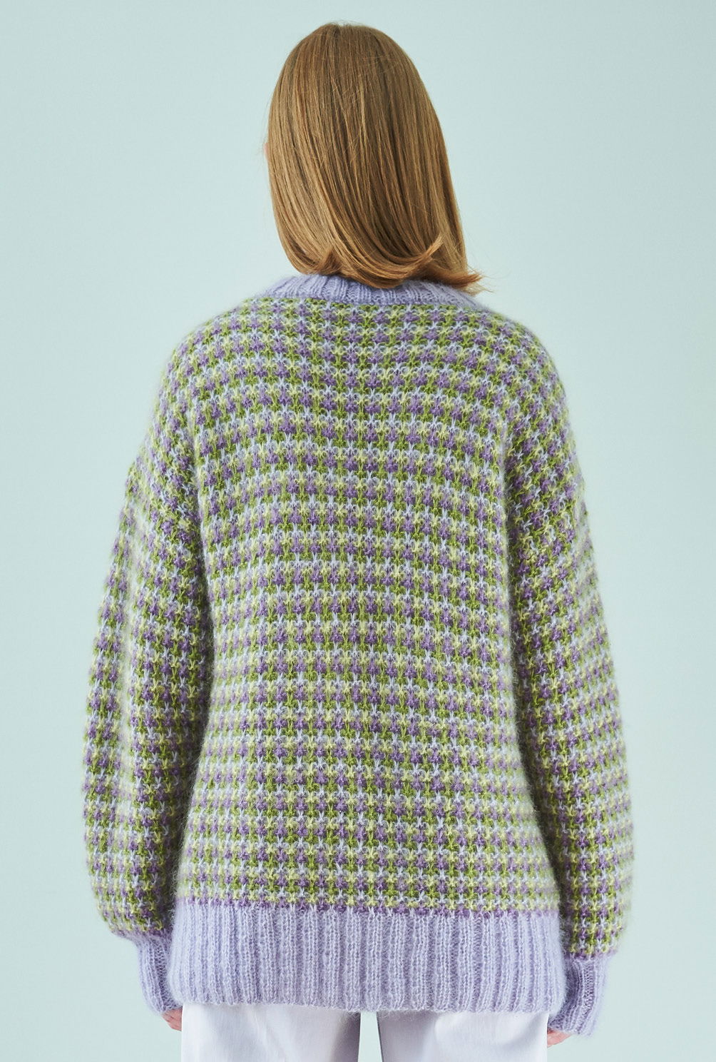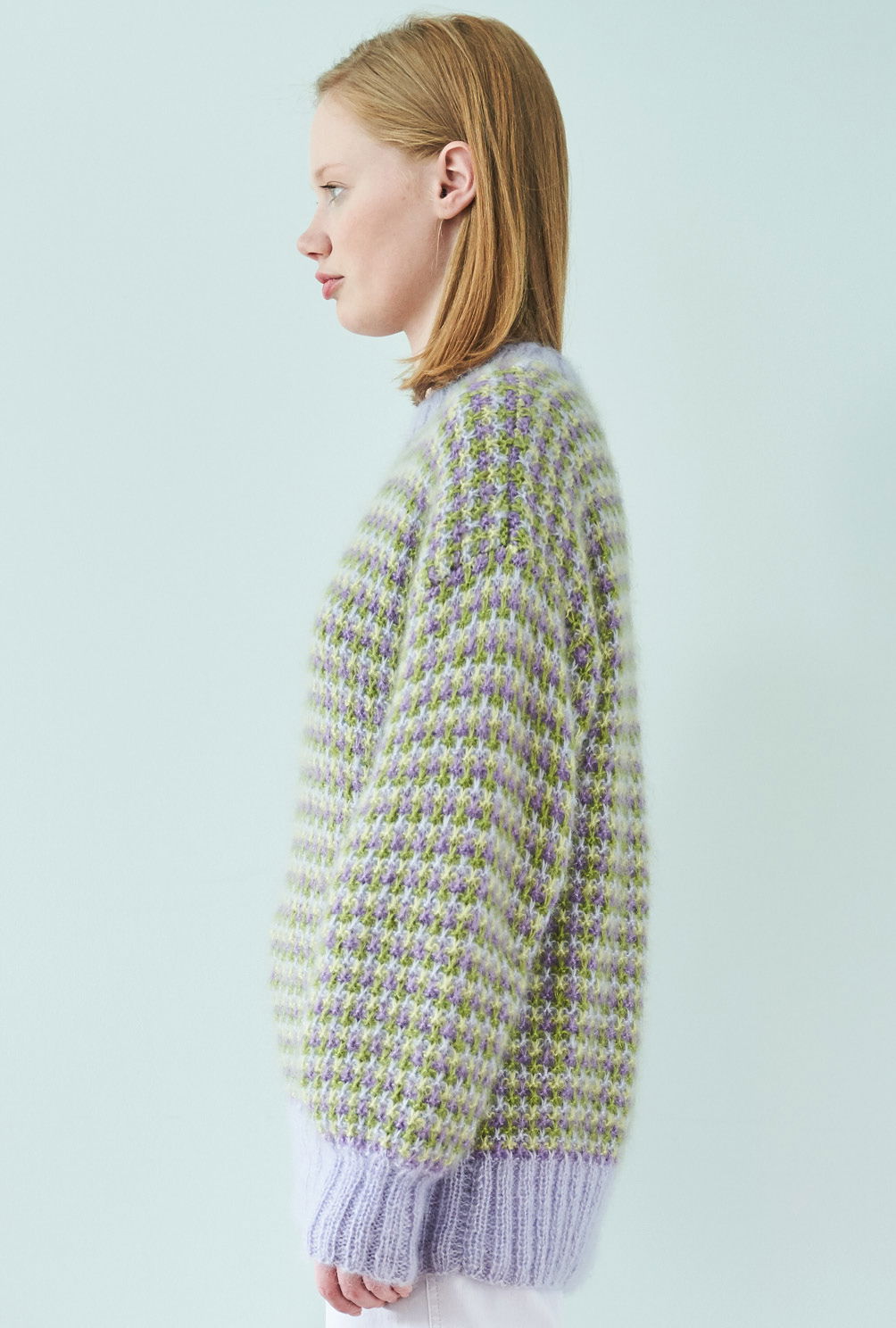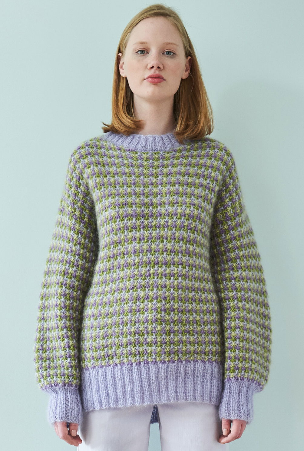 Das feine Mohairgarn dieses Pullis wird dreifach verstrickt – das geht schnell, sieht toll aus und gibt dem Gestrick aus Hebemaschen den nötigen Stand. Und das beste: Was hier so komplex und ungemein wirkungsvoll scheint, ist gar nicht so kompliziert zu stricken. Es wird immer nur mit einer Farbe pro Reihe gestrickt, so bleibt es immer schön übersichtlich. Das Muster ist in der Anleitung ausführlich Reihe für Reihe beschrieben und auch die Streifenfolge hat sich schnell eingeprägt. Gestrickt wird in einzelnen Teilen von unten nach oben. Sind alle vier Teile fertig gestrickt, werden noch alle Nähte geschlossen und aus dem Halsausschnitt die schmale Blende im Rippenmuster herausgestrickt. Am besten nimmt der fertige Pullover jetzt noch ein kleines Bad und wird im Liegen getrocknet. Dabei schön in Form bringen und glattstreichen – so entfaltet das Garn seine ganze flauschige Schönheit.
