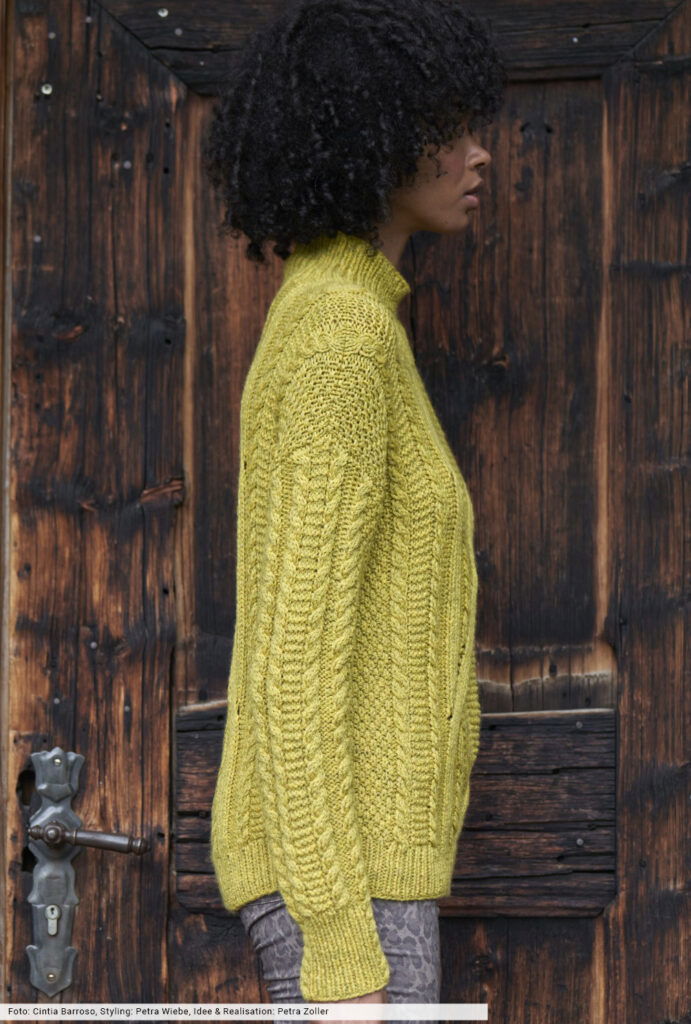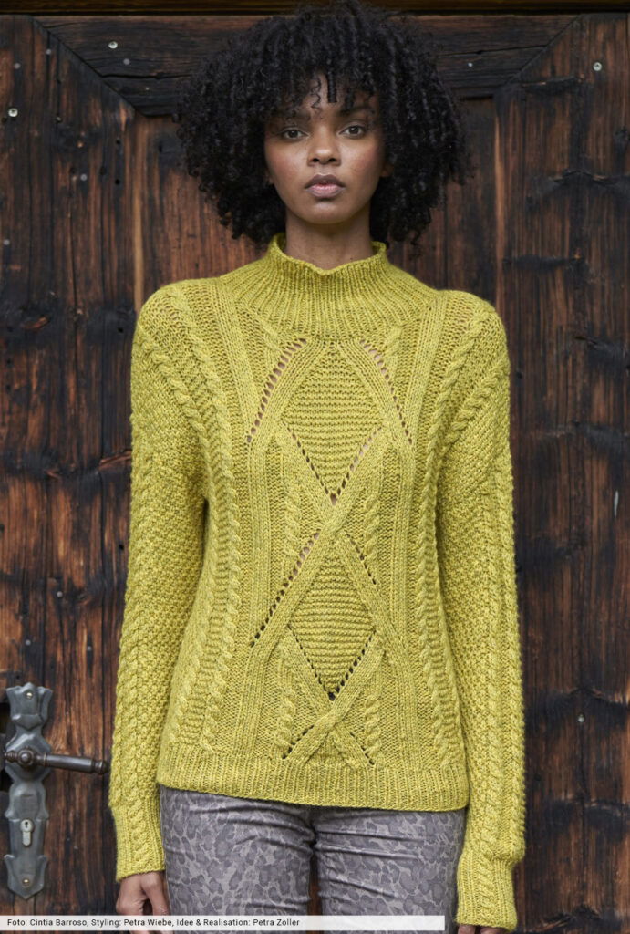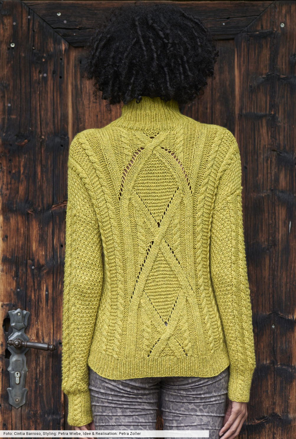 Das extravagante Design dieses senfgelben Pullovers spricht vorallem Strickprofis an. Denn für die großzügigen Rautenstrukturen braucht es etwas Geduld und Erfahrung. Wir haben dafür eine übersichtliche Strickschrift erstellt, die du in unserer Anleitung findest. Zu beiden Seiten und an den Ärmeln setzt sich ein Mix aus Zopfstreifen und Perlmusterflächen in Szene, der durch das griffige Merinogarn besonders plastisch zur Geltung kommt.