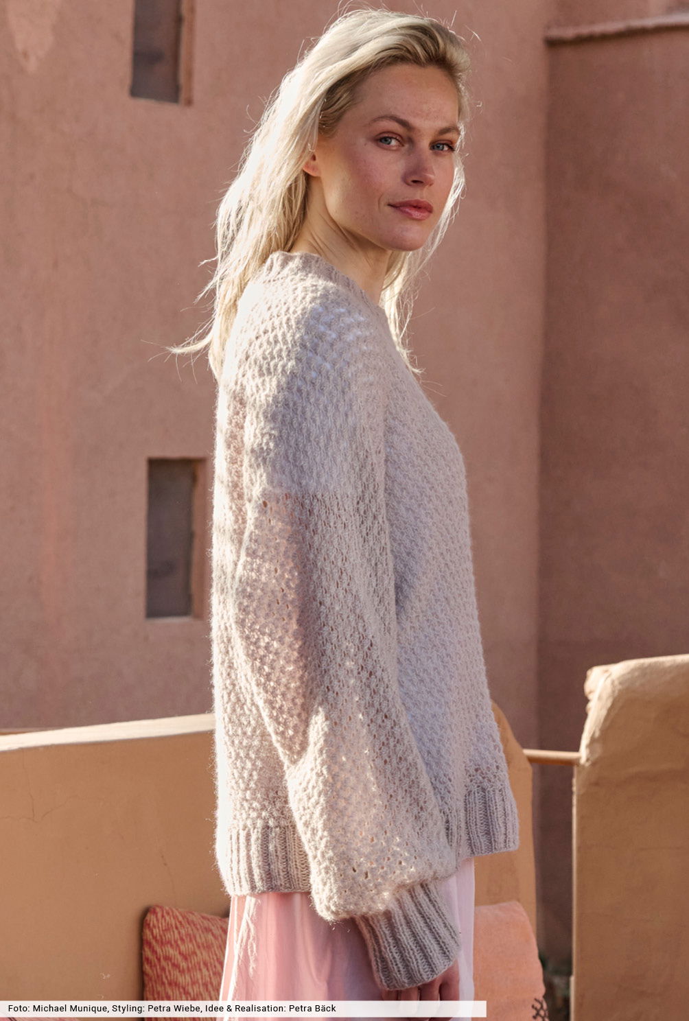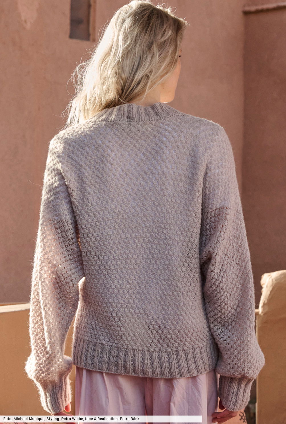 Ein Hauch Cashmere reicht! Kombiniert mit Wolle und Baumwolle entsteht ein hauchfeines Flauschgarn, das sich angenehm auf der Haut tragen lässt und trotzdem erschwinglich bleibt. Wir haben daraus einen locker fallenden Cosy-Pulli gestrickt, bei dem allover das traditionelle Dornröschenmuster zum Einsatz kommt. Elastische Bündchen bilden den klassischen Rahmen und bieten Formstabilität. Ein tolles Modell, das an einem Stück von Ärmel zu Ärmel gestrickt wird.