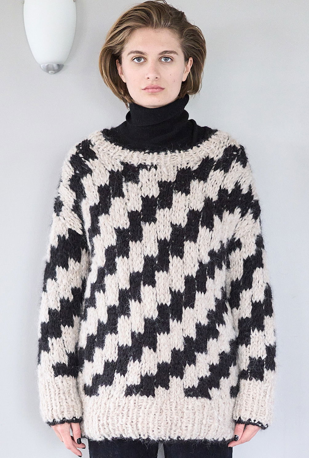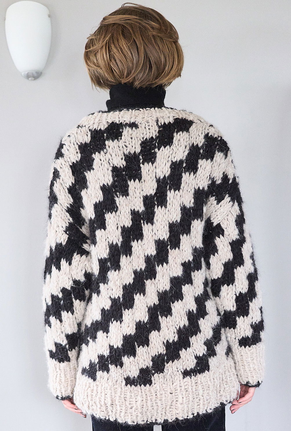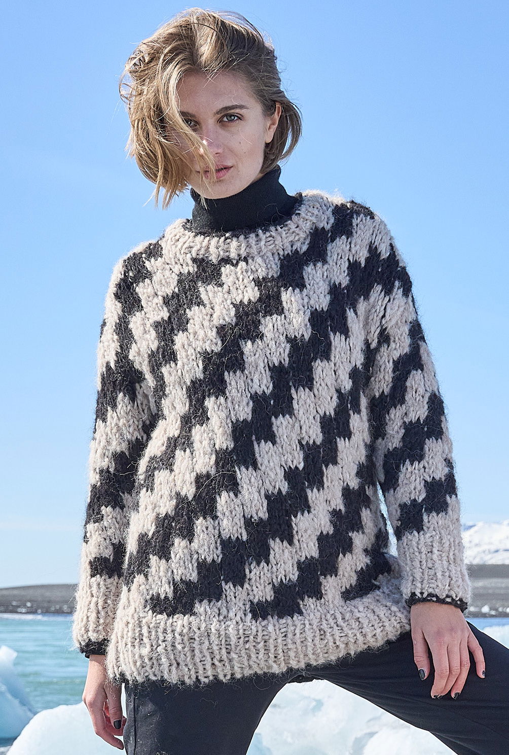 Material: 350 (400) g Natur (Fb 1601) und 250 (300) g Schwarz (Fb 1604) "Delizia" (88% Alpaka, 12% Polyamid, LL = 60 m/50 g) von GEDIFRA. 1 Paar Stricknadel Nr 10 sowie 1 Rundstricknadel Nr 10.