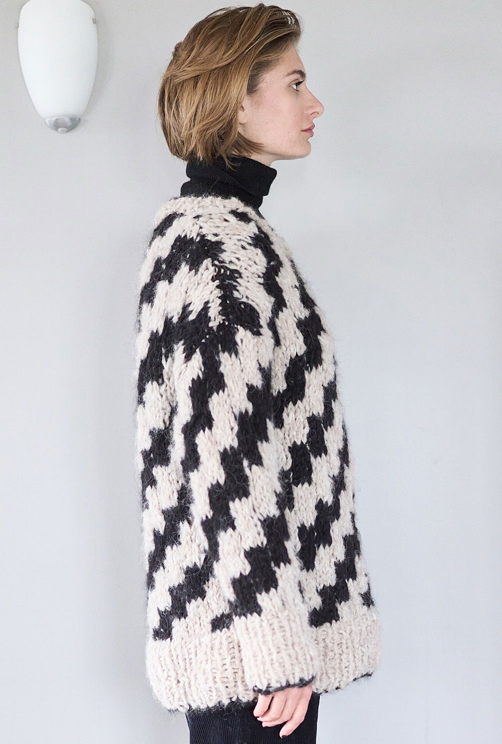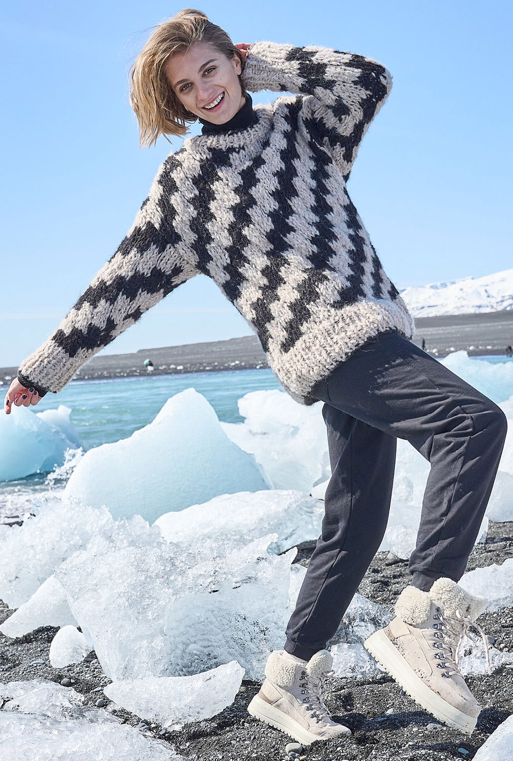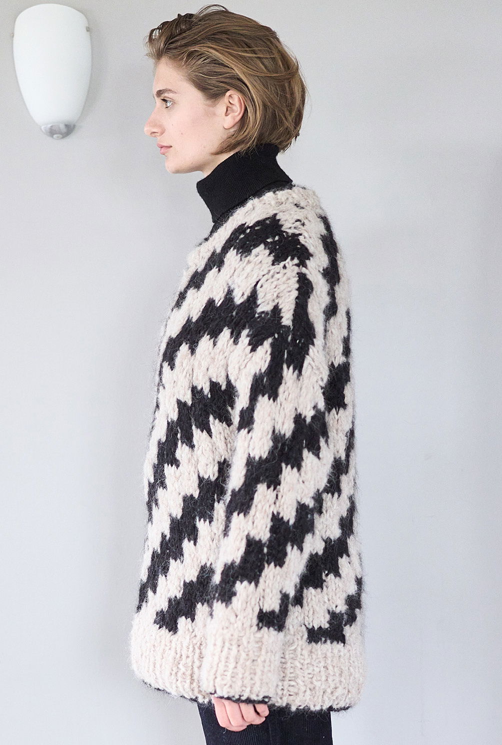 Material: 350 (400) g Natur (Fb 1601) und 250 (300) g Schwarz (Fb 1604) "Delizia" (88% Alpaka, 12% Polyamid, LL = 60 m/50 g) von GEDIFRA. 1 Paar Stricknadel Nr 10 sowie 1 Rundstricknadel Nr 10.