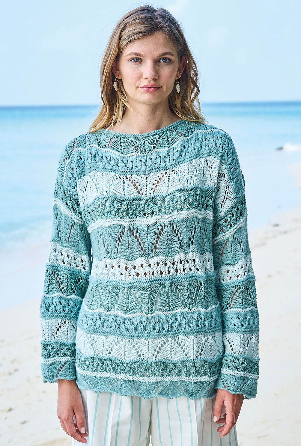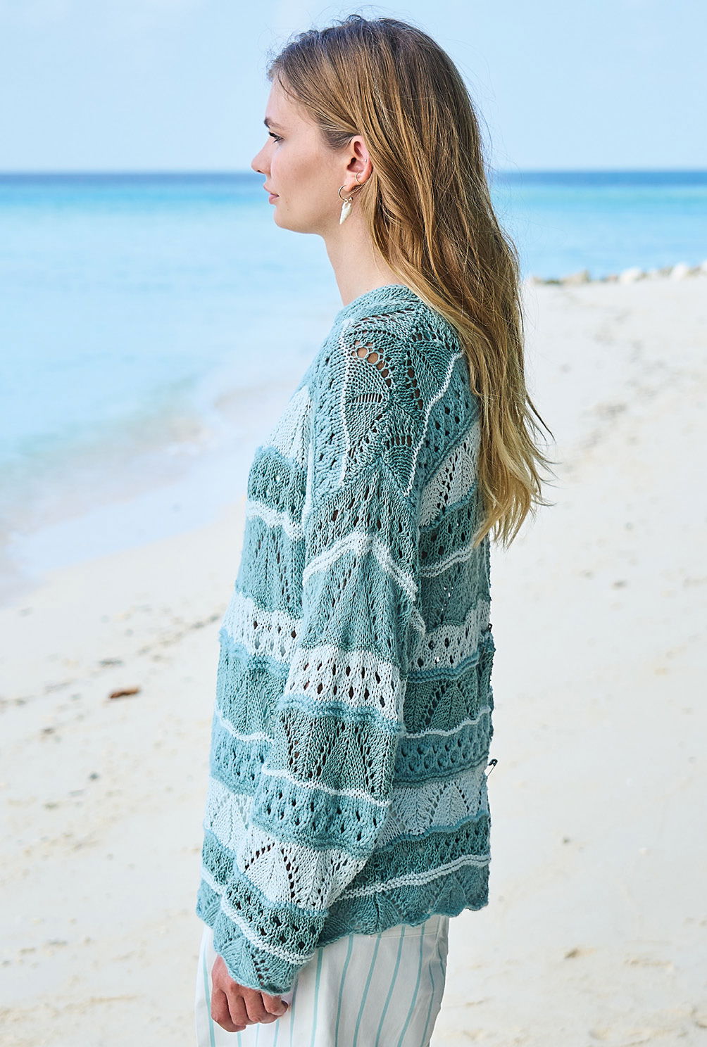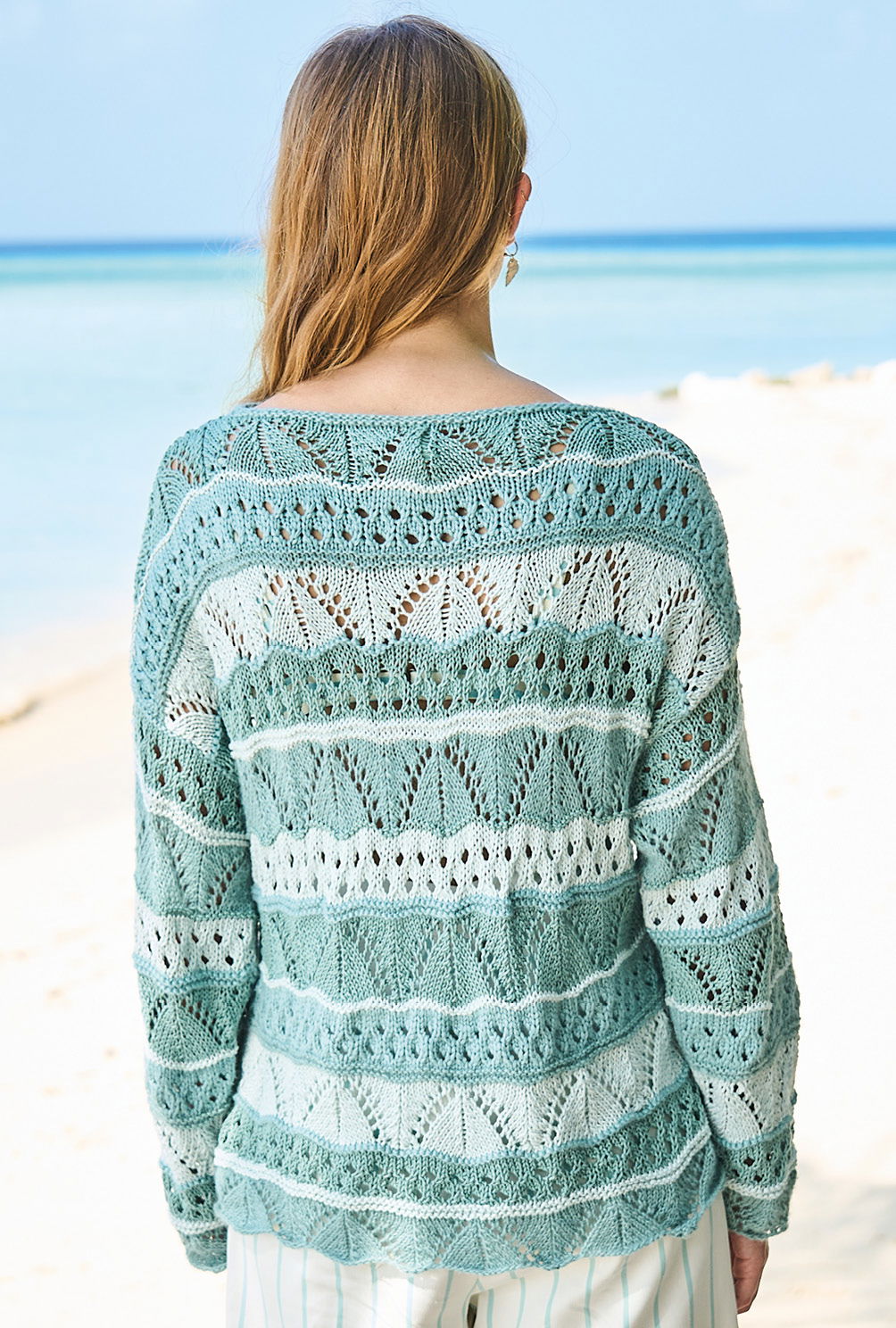 Der Mix aus fantasievoller Kreativität und entspannter Tragbarkeit macht diesen aparten Streifenpulli aus vier verschiedenen Garnen zum sommerlichen Hingucker. Die verwendeten Muster sind nicht schwierig zu stricken und ausführlich in der Anleitung beschrieben. So bietet der Sommerpulli kurzweiliges und unterhaltsames Strickvergnügen. Das Vorder- und das Rückenteil lassen sich ganz entspannt im Muster und Streifenwechsel gerade hoch stricken. Lediglich bei den Zunahmen der Ärmel muss bei den Mustern darauf geachtet werden, dass sich die Umschläge und zusammengestrickten Maschen immer ausgleichen. Sind alle Teile fertig, wird aus den Maschen des Halsausschnitts noch die Blende kraus rechts herausgestrickt und alle Nähte geschlossen.