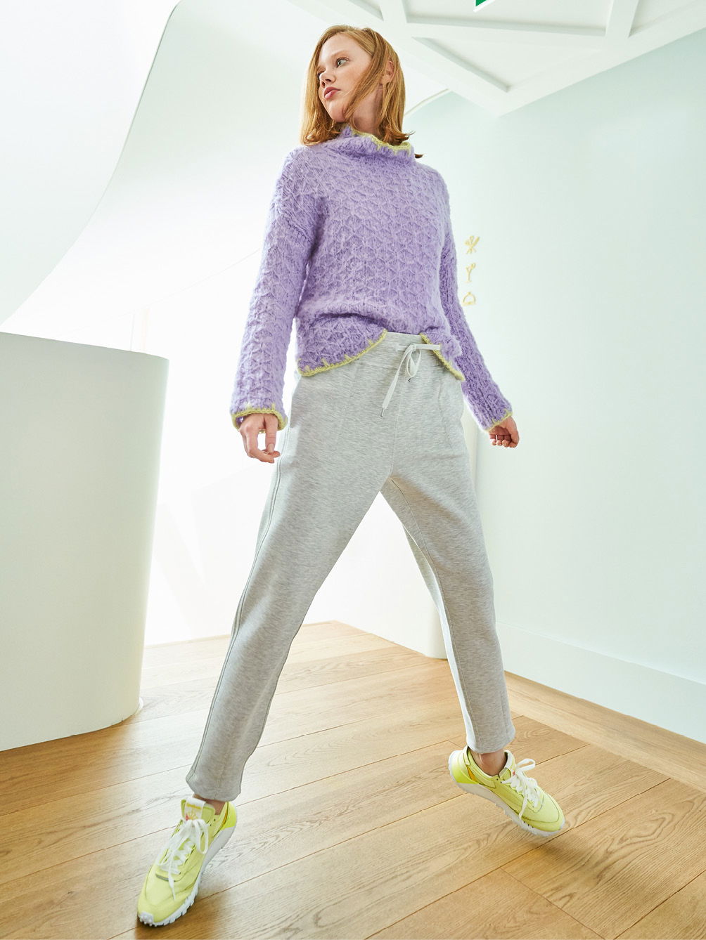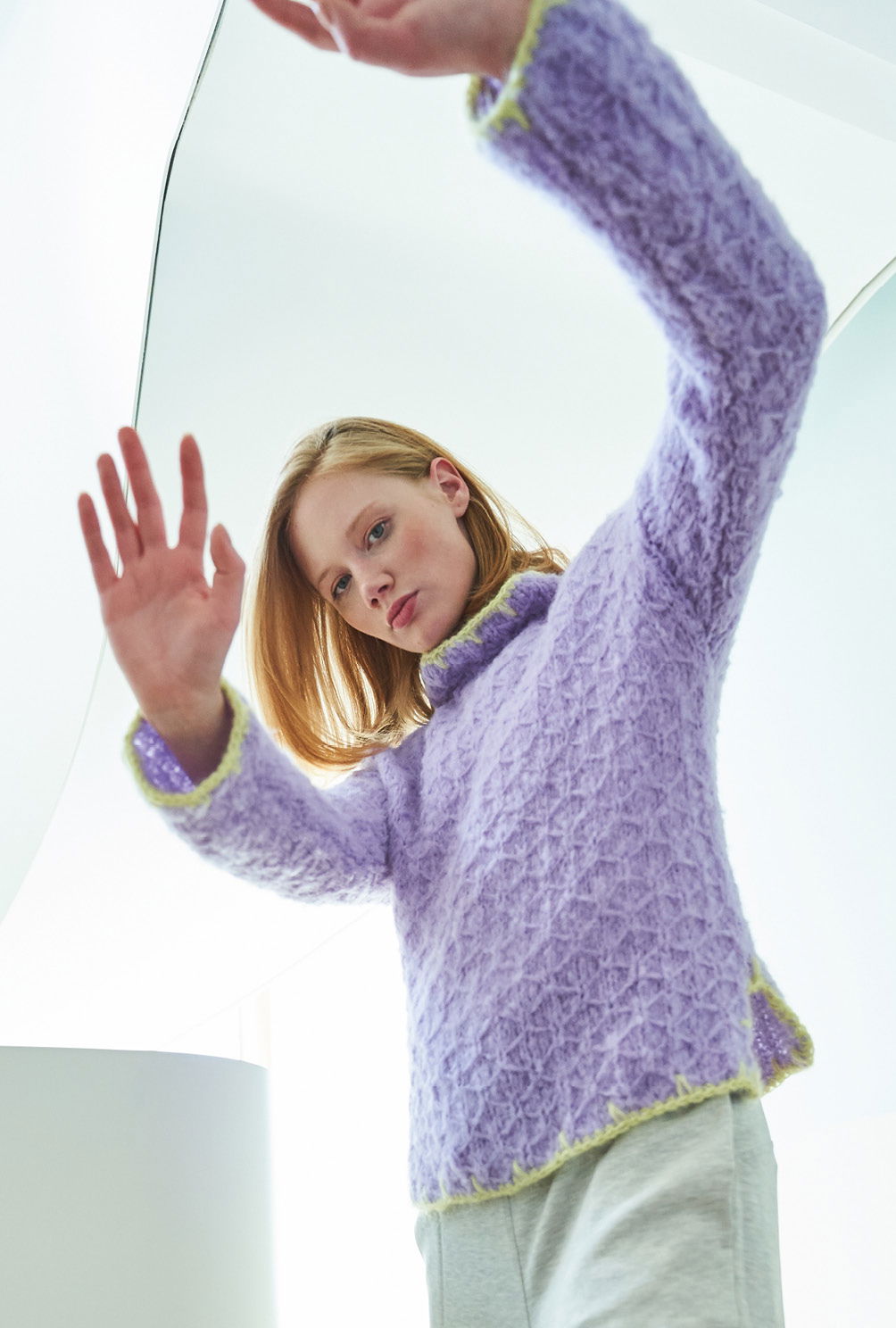 Lila gibt bei diesem Pulli im raffinierten Rautenmuster den Ton an. Das modische Finish bilden schmale Häkelblenden, die in Gelb alle Ränder effektvoll akzentuieren. Mit Nadelstärke 8 und dem anschmiegsamen, weichen Garn geht es schnell voran. Gestrickt wird in einzelnen Teilen von unten nach oben. Das Rauten-Struktur-Muster ist nicht sonderlich kompliziert und Reihe für Reihe in der Anleitung ausführlich beschrieben. Sind alle Teile fertig gestrickt, werden die Nähte geschlossen und aus dem Halsausschnitt der Kragen herausgestrickt. Nun noch alle Ränder inklusive der Seitenschlitze in Pastellgelb mit einer Runde fester Maschen umhäkeln – fertig ist der Kuschelpulli für erste kühle Tage!