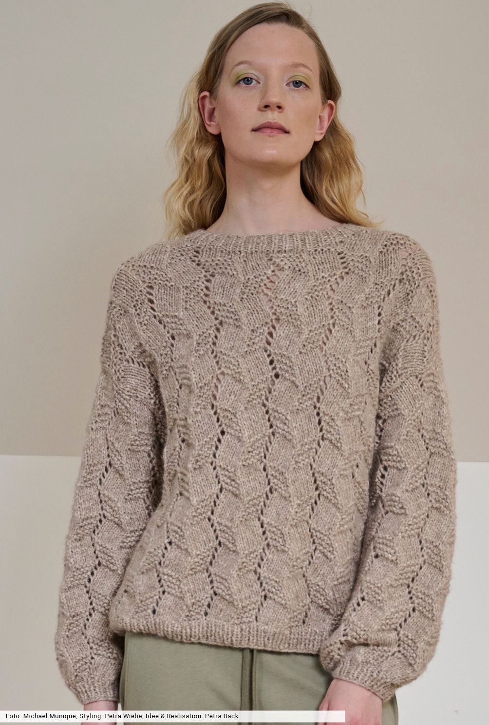Hier wird etwas dicker aufgetragen, denn das voluminöse Alpaka-Baumwollgarn strickst du mit Nadel Nummer 5. Easy going! Und auch das Allover-Muster spielt da mit, denn es entsteht aus Lochzacken und Kraus-rechts-Partien, deren Einteilung in der Anleitung genau beschrieben ist. Die lässige Note entsteht durch den gemütlchen Oversizeschnitt und die weiten Keulenärmel. Das klassische Finish bilden schmale Blenden aus elastischen Rippen.