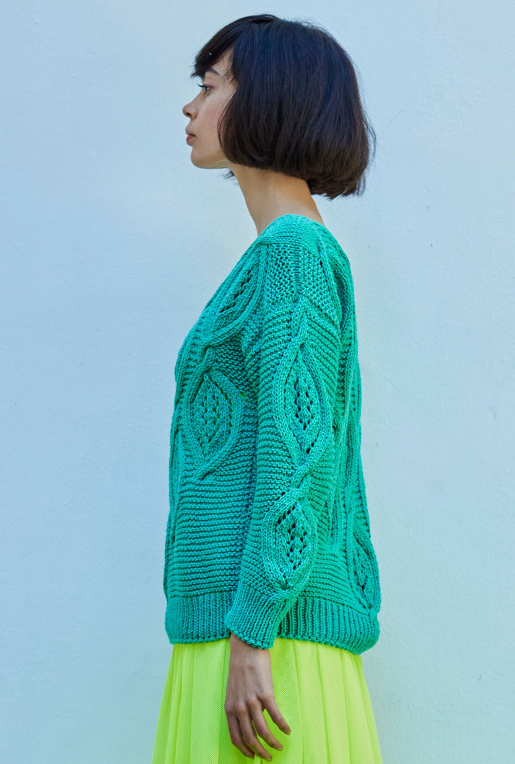 Damit das Rautenmuster dieses Pullis so besonders ausdrucksvoll wirkt, wurde es um die V- Ausschnitte des Vorderteils und auch des Rückenteils herum angeordnet. Zugegeben – solch ein Design ist nicht ganz so einfach zu stricken, aber die große, übersichtliche Strickschrift lässt dich das Muster sehr gut nachvollziehen und bietet dir stets einen Überblick. Alle Teile beginnen erst einmal mit dem Rippenbündchen und einem kleinen Abschnitt kraus rechts gestrickter Maschen. Nach und nach erwachsen dann von der Mitte ausgehend die Rauten. Auch die Ärmel erhalten mittig einen Rautenstreifen, so wird es besonders harmonisch. Danach wird noch ein I-Cord als Steg für den rückwärtigen Ausschnitt gearbeitet und beidseitig des Ausschnitts angenäht. Dann noch die Ärmel einsetzen, die restlichen Nähte schließen – und einfach nur stolz sein auf das handgestrickte Prachtstück!