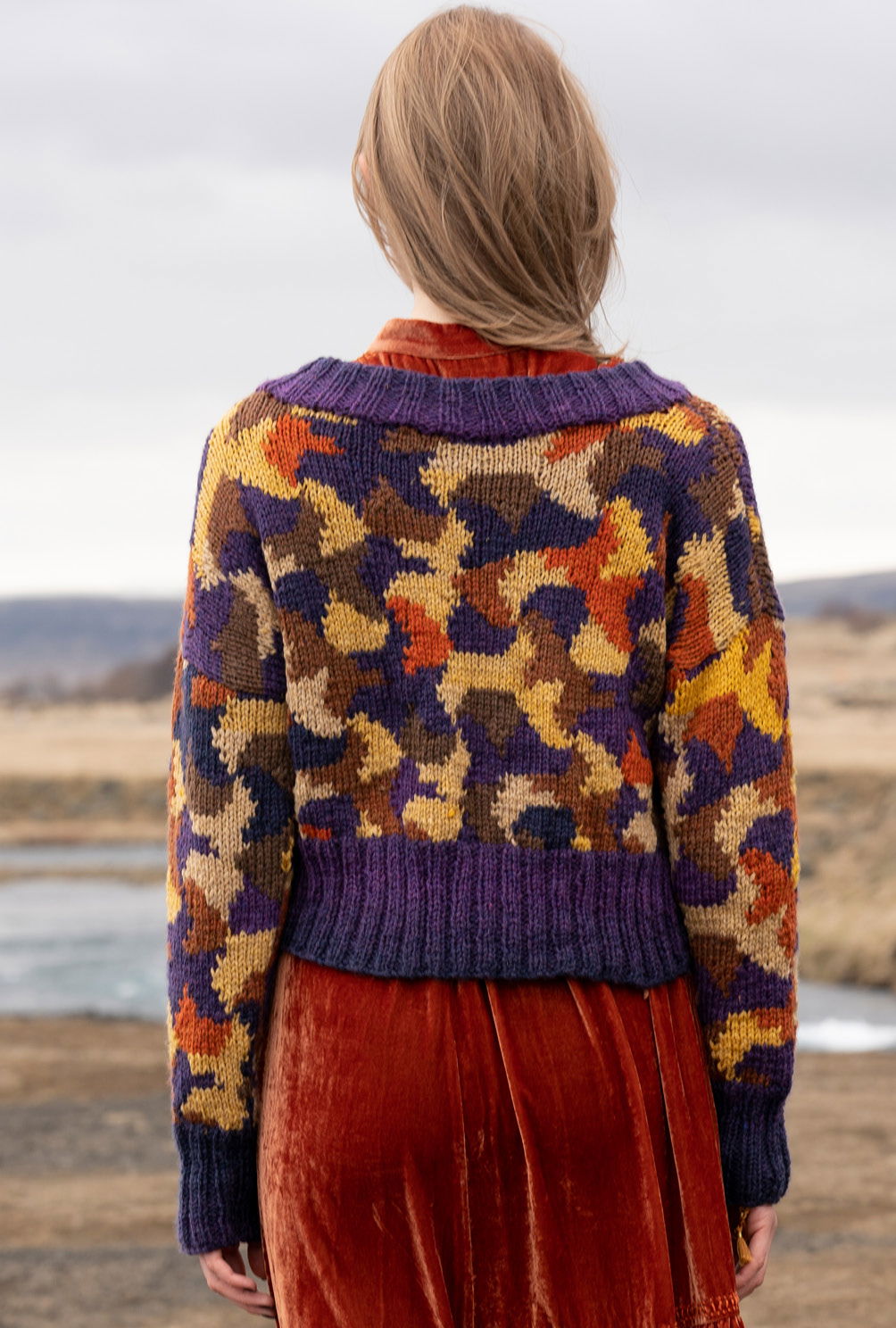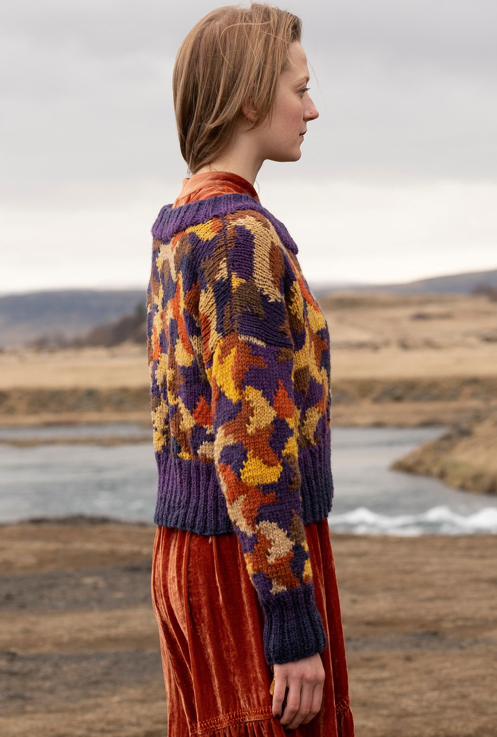 Mit Farben spielen – dieses Motto erzielt der Pulli mit fantasievollen Farbflächen, deren Intensität zusätzlich durch das Verlaufsgarn erzielt wird, das sich aus warmen Orange-, Braun-, Gelb- und Aubergine-Nuancen präsentiert. Gestrickt wird nach einem Zählmuster glatt rechts in Intarsientechnik, das heißt für jede Fläche kommt ein extra Knäuel zu Einsatz. Dafür brauchst du ein bisschen Übung, deshalb raten wir zu einer Maschenprobe. Das Finish bilden elasistische Rippenbündchen, die Halsblende wird nach innen gesäumt.