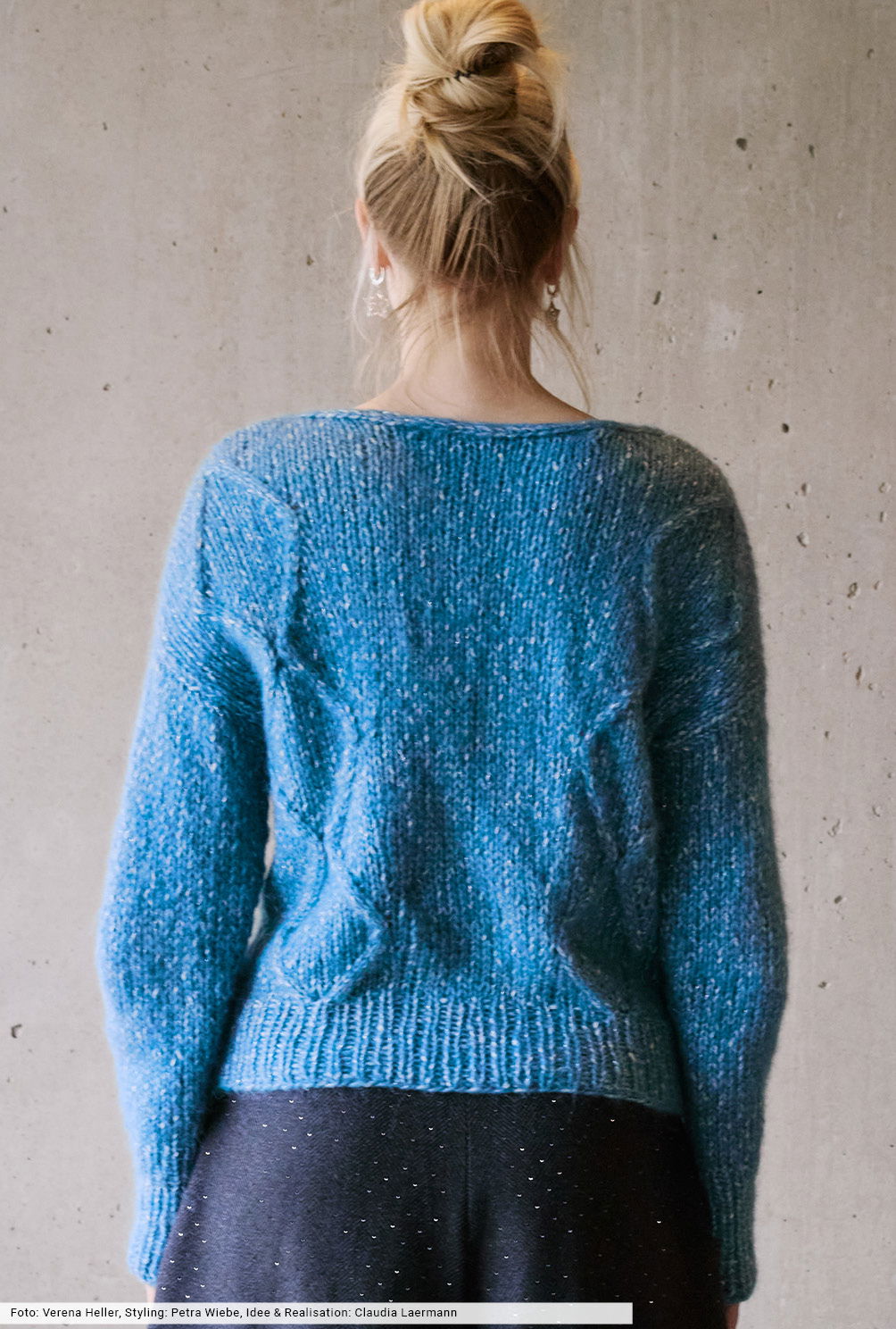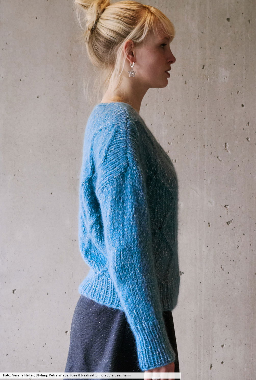 Irisierend wie Metall und Asphalt, dabei weich und anschmiegsam: Dieses leicht flauschige Mixgarn hat alles in sich vereint und du kannst sofort mit dem Stricken loslegen. Erst mit den Bündchen, dann mit dem eher schlichten Muster, das sich aus glatt rechts und großen Rauten zusammensetzt. Sanfte Seiten- und Schulterschrägungen und der perfekt ausgearbeitete V-Ausschnitt bilden das Finish, die elastische Halsblende sorgt für Stabilität.