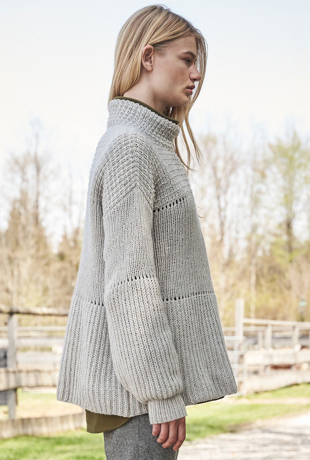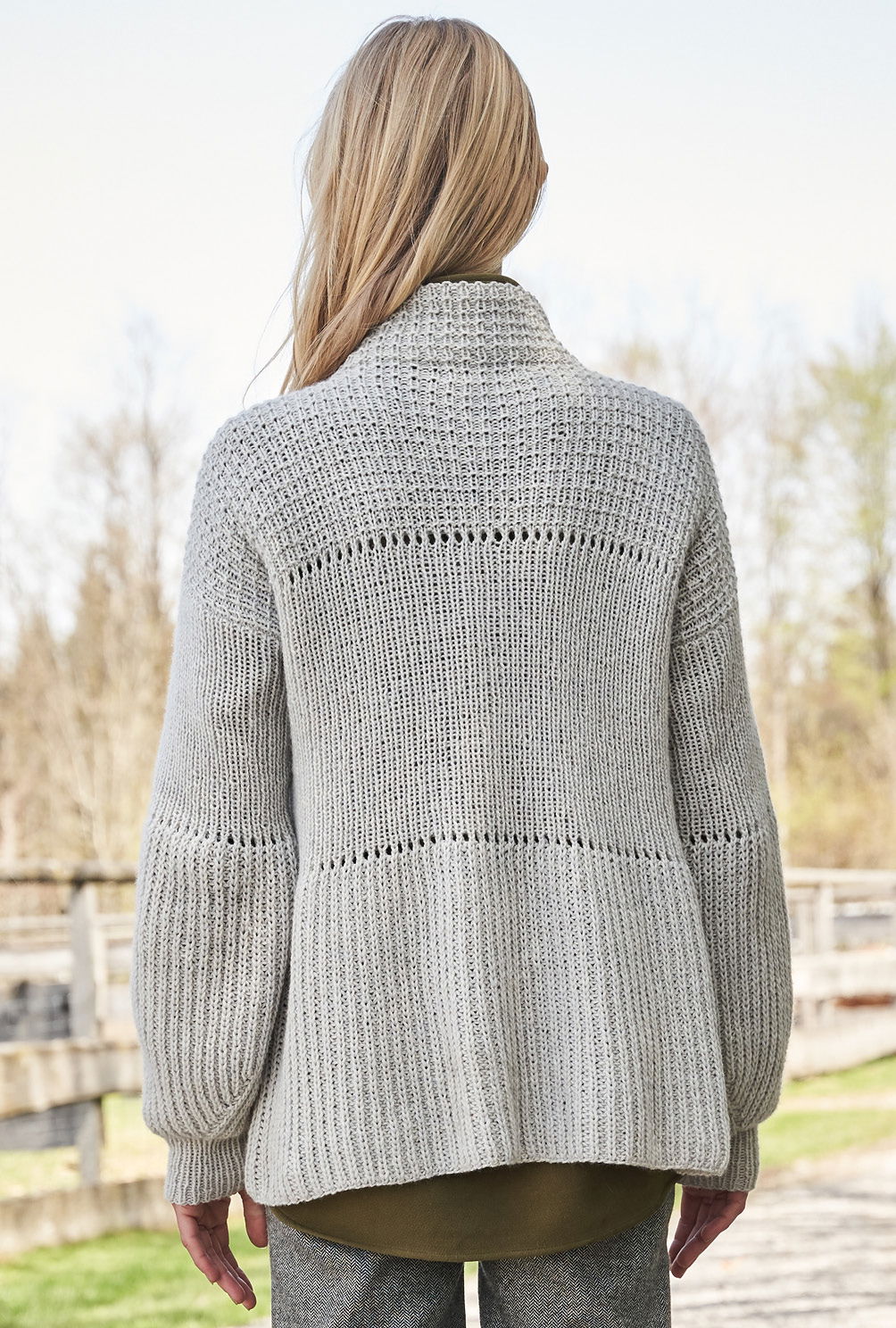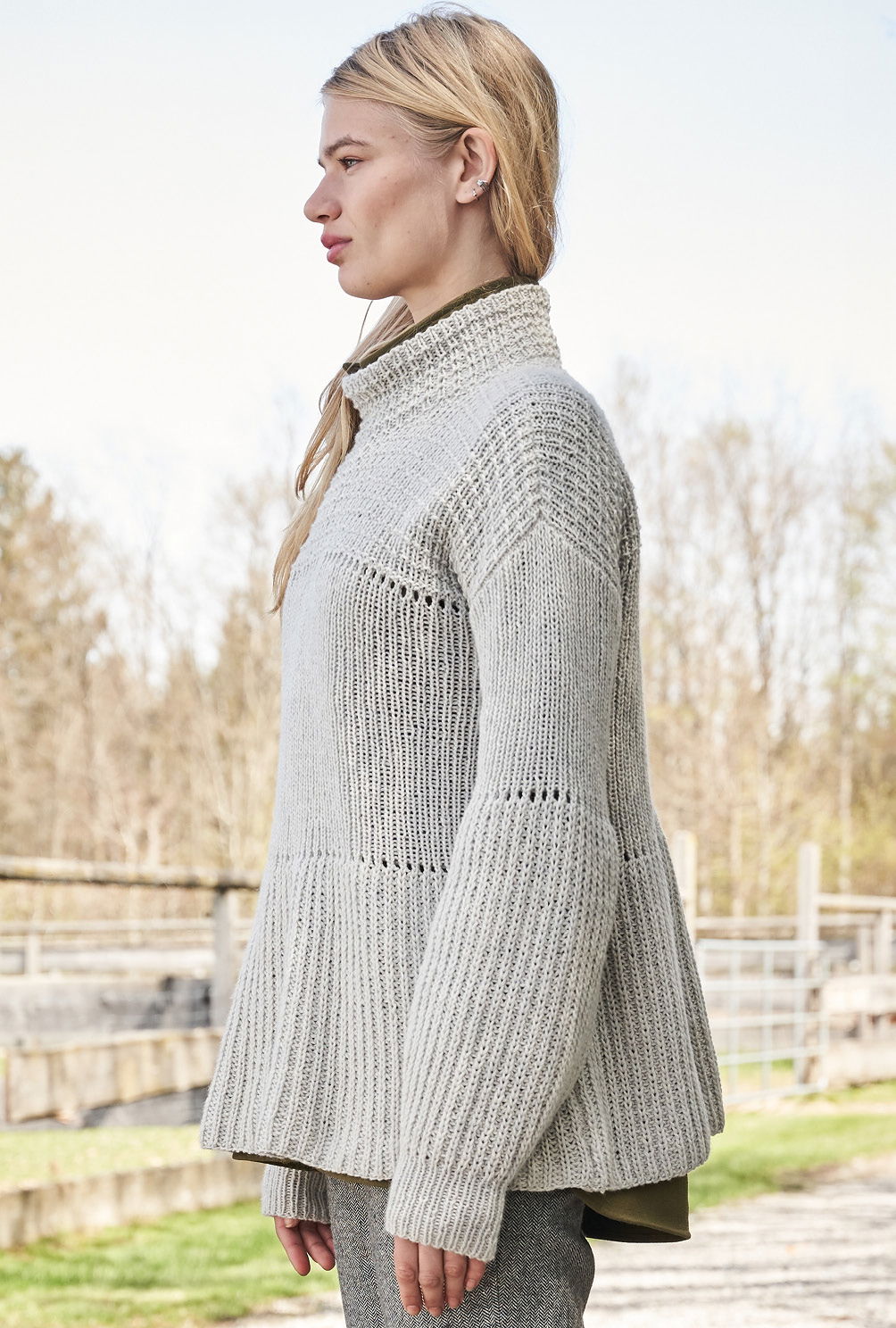 Muster auf Streife: Bei diesem Pulli kommen drei verschiedene Rippenstrukturen zum Einsatz, die sich durch schmale Lochstreifen voneinander absetzen. Schößchen und Keulenärmel machen ihn zum modischen Beststeller. Halbpatent, Streifen-Strukturmuster und Lochmuster bieten jede Menge Abwechslung und sind zudem auch nicht schwierig zu stricken. Die Muster sind in der Anleitung detailliert Reihe für Reihe beschrieben – so bleibt es stets schön übersichtlich. Besonders praktisch: Die Schößchenform entsteht allein durch die unterschiedlichen Maschenproben der einzelnen Muster. Sind alle vier Teile fertig gestrickt, werden noch alle Nähte geschlossen und aus dem Halsausschnitt die umgeschlagene Blende herausgestrickt.