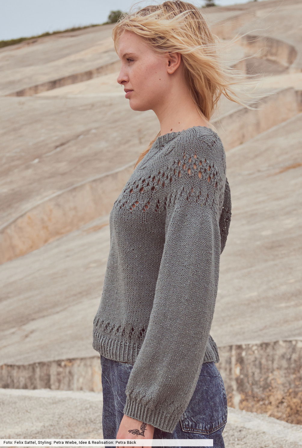 Komplett in Runden gestrickt und ein Statement für Nachhaltigkeit: Re-Jeans heißt das Garn, aus dem dieser zwanglose Top-to-down-Pulli entsteht. Das heißt, alte Jeans werden wieder aufgearbeitet und zu einem Baumwollgarn versponnen, das sich nicht nur angenehm tragen lässt, sondern mit dem auch Muster und Strukturen toll zur Geltung kommen. Raffinierter Dreh: Du fängst oben an der Halsblende an, strickst in Runden das Passenmuster und stellst die Ärmel sowie Vorder- und Rückenteil glatt rechts fertig.