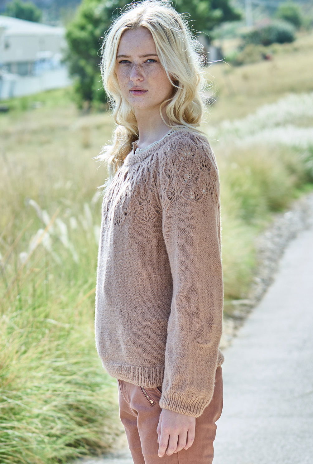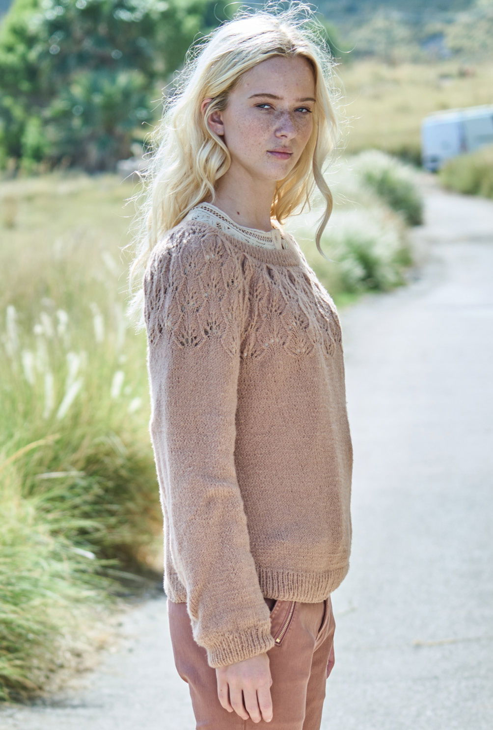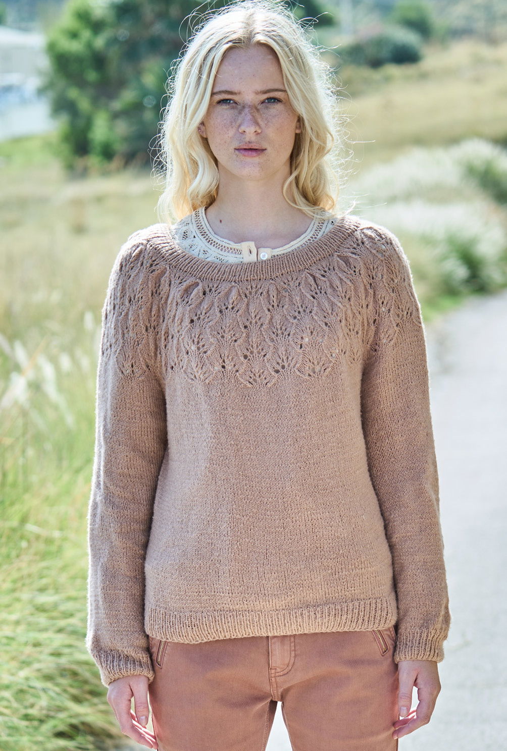 Der Einstieg bei diesem attraktiven Pulli ist ganz einfach: du beginnst mit eine elastischen Rippenbündchen und strickst danach glatt rechts bis zu den Armausschnitten. Wenn du die unteren Partien von Rücken-, Vorderteil und Ärmeln fertiggestellt hast, heißt es aufgepasst, denn jetzt geht’s an die Rundpasse. Dafür legst du alle Maschen nacheinander auf eine lange Rundstricknadel und konzentrierst dich auf das zauberhafte Blattmuster, das wir mit einer übersichtlichen Strickschrift dargestellt haben. Tipp: Falls du vorher zur Übung eine Maschenprobe anfertigen möchtest, stricke sie in Reihen. Und nicht vergessen: Die geraden Runden-Angaben bezeichnen dann die Rückreihen, das heißt, du musst alle Maschen und Umschläge sowie die zusammengestrickten Maschen links abstricken.