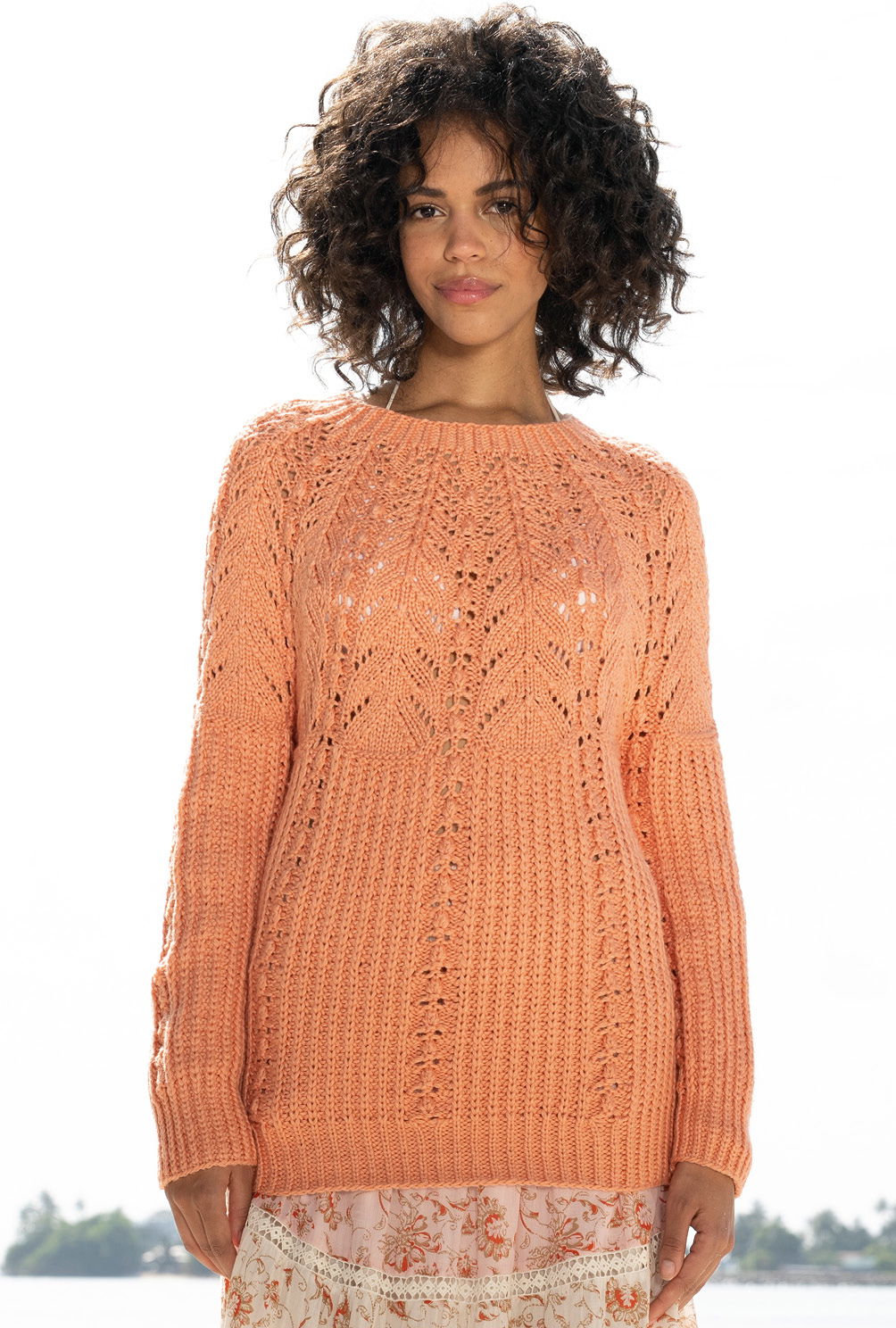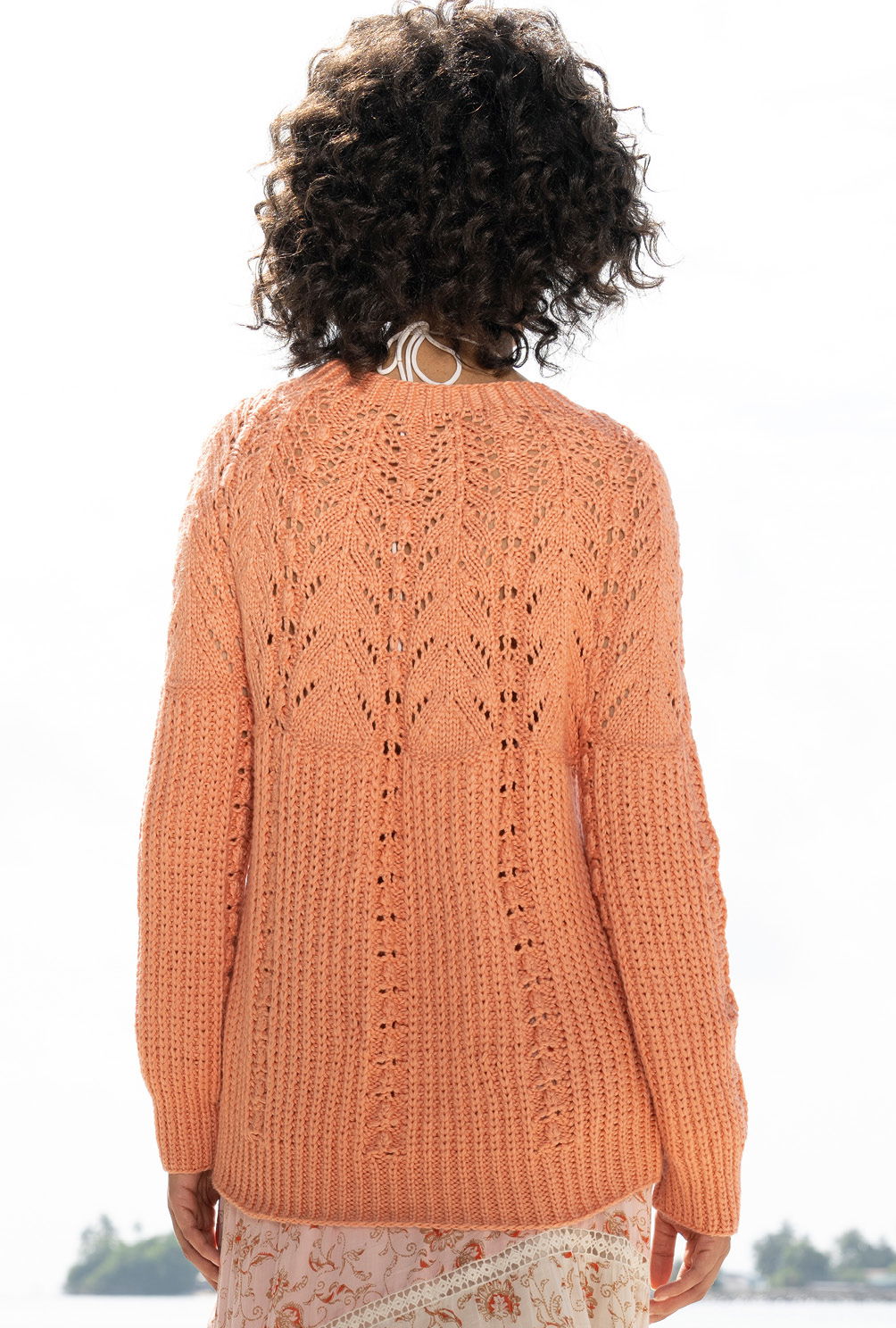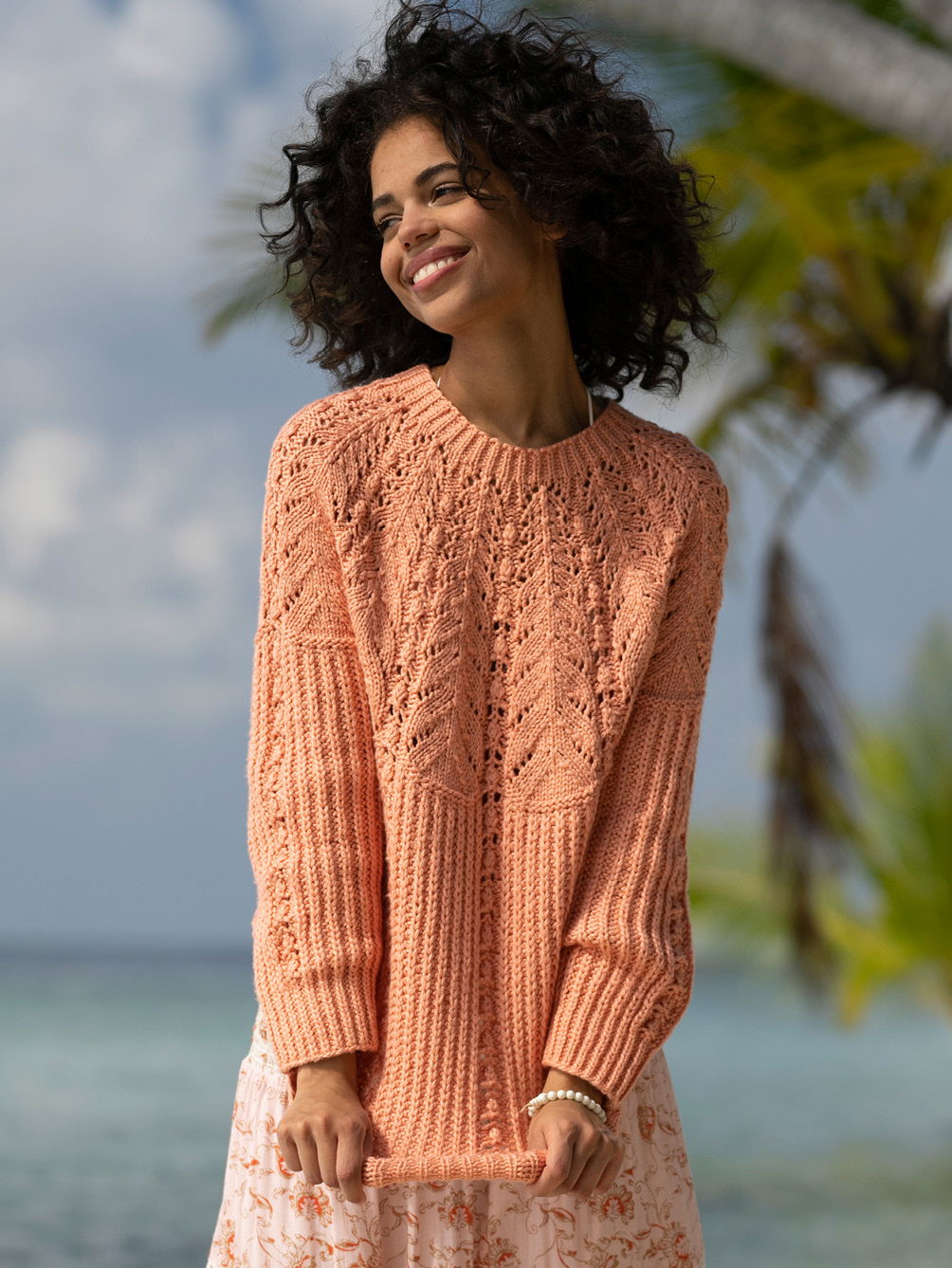 Schmale Noppenstreifen, dazu mal Halbpatent-Rippen, mal filigrane Ajourmotive – es ist der fantasievolle Musterverlauf, der bei diesem Pulli ins Auge fällt. Und natürlich die Rundpasse, für die es in unserer Anleitung eine passgenaue Beschreibung gibt. Und wir versprechen Dir: Dieses gute Stück macht nicht nur beim Tragen Spaß, sondern schon beim Stricken. Das liegt am Material: Butterweiche und sehr griffige Baumwolle, die sich leicht aufgeraut präsentiert, lässt die Maschen ganz leicht von den Nadeln gehen.
