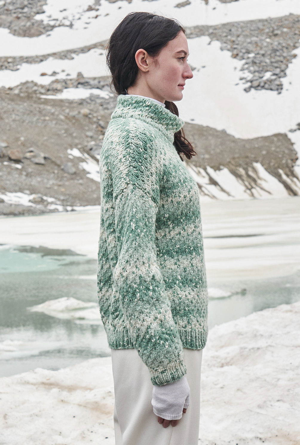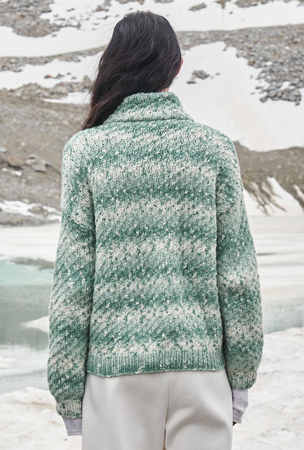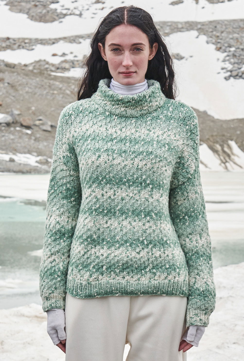 Nomen est omen: «Snowflake» heißt das Garn dieses wunderbar weichen Pullis, bei dem man tatsächlich meinen könnte, dass er von Schneeflocken bedeckt ist. Aber der Degradé-Effekt kommt direkt aus dem Garn – easy going! Das kleine, unkomplizierte Zopfmuster verstärkt diesen Effekt noch gekonnt. Gestrickt wird der Pulli in vier Teilen: Vorderteil, Rückenteil und die Ärmel. Mit Nadelstärke 6 geht es schnell vorwärts und zu sehen, wie sich die Farben immer weiter entwickeln, spornt uns immer weiter an. Das macht Farbverlaufsgarne nicht umsonst so ungemein beliebt – denn sie sind optisch ebenso wirkungsvoll, wie sie zudem größten Strickspaß bieten. Sind alle Teile fertig gestrickt, werden die Schulternähte geschlossen und aus dem Halsausschnitt die Maschen für den doppelten Kragen herausgearbeitet. Dann werden die Ärmel eingesetzt und die restlichen Nähte geschlossen