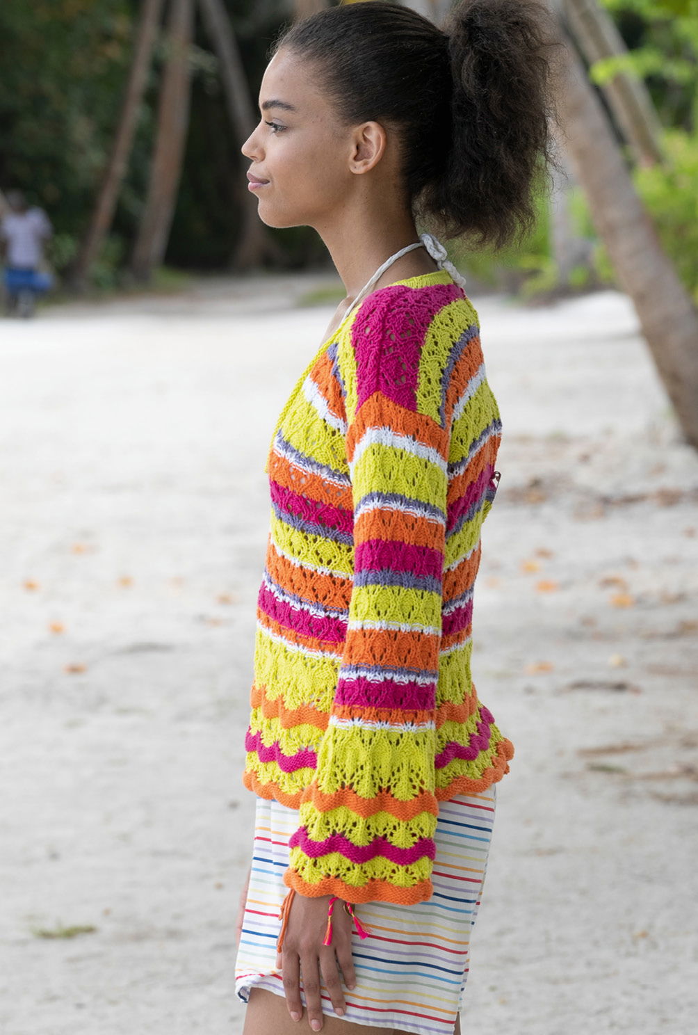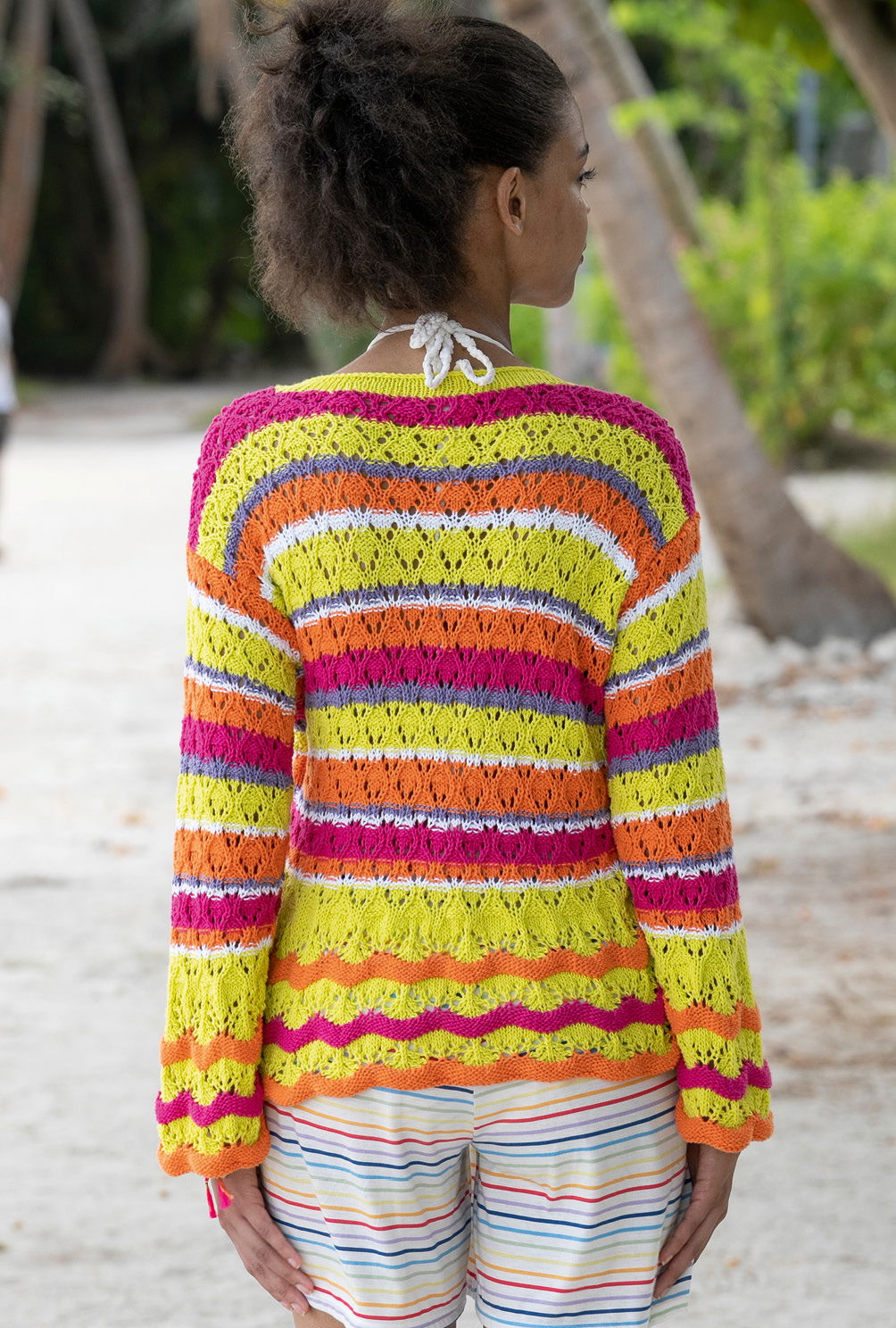 Ein Feuerwerk an Farben, dabei insgesamt sehr harmonisch und ansprechend – so präsentiert sich dieser aparte Pulli mit dreiviertel langen Ärmeln. Und auch die Mustervielfalt kann sich sehen lassen: Wellenstrukturen, Lochmusterrauten und Kraus-links-Streifen machen gemeinsame Sache und sorgen für Kurzweil beim Stricken. Wenn alle vier Teile fertiggestellt sind, müssen sie nur noch zusammengenäht werden. Zum Schluss bekommt der tiefe V-Ausschnitt noch eine Rollblende, die alles schön in Form hält.