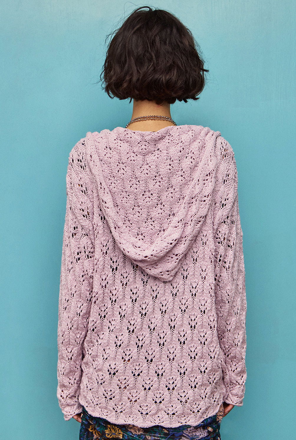 Das semitransparente Ajourmuster gibt diesem Pulli die romantische Note. Den modischen Lifestyle erhält er nicht nur durch die lässige Weite, sondern auch durch den Wickeleffekt am Vorderteil und durch die Kapuze. Gestrickt wird der Sommerpulli in Einzelteilen von unten nach oben. Direkt nach dem Anschlag geht es auch schon los mit dem Ajourmuster – das Muster an sich ist nicht besonders schwierig und die übersichtliche Strickschrift sorgt dafür, stets den Überblick im Muster zu behalten. Bei den Zu- und Abnahmen sollte unbedingt darauf geachtet werden, dass sich im Muster die Umschläge und zusammengestrickten Maschen weiterhin ausgleichen. Sind beide Vorderteile, das Rückenteil und die Ärmel fertig gestrickt, werden erst einmal die Schulternähte geschlossen, damit die Kapuze direkt aus dem Ausschnitt heraus angestrickt werden kann. Danach erhalten die Verschlussränder und der Gesichtsrand der Kapuze noch eine Reihe Kettmaschen mit der Häkelnadel und die restlichen Nähte werden geschlossen. Am besten nimmt der fertige Pullover jetzt noch ein kleines Bad und wird im Liegen getrocknet. Dabei schön in Form bringen und glattstreichen – so öffnet sich das Lacemuster und entfaltet seine ganze Pracht.