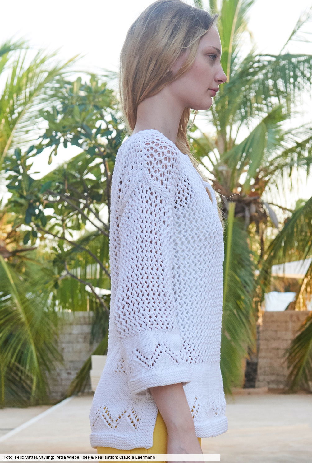 Weiße Pullis schaffen es immer wieder in unsere Sommergarderobe. Kein Wunder, denn sie lassen sich zu allen Farben problemlos kombinieren und bleiben länger als eine Saison aktuell. Hier ein Modell, das durch seine breite Zackenbordüre und durch transparente Netzstrukturen Blicke auf sich zieht. Dazu hohe Seitenschlitze und die Schnürung am Vorderteil, fertig ist ein weiteres Highlight für Job und Freizeit.
