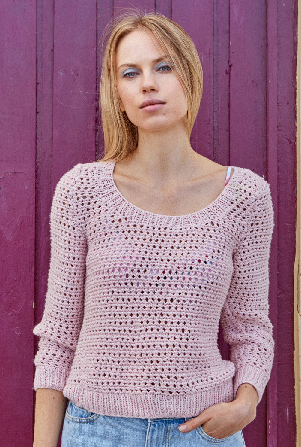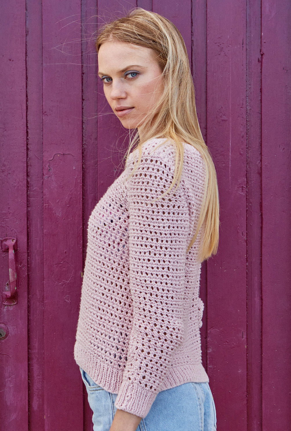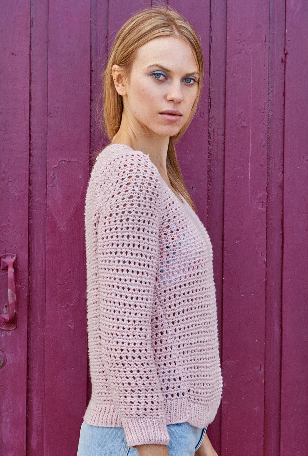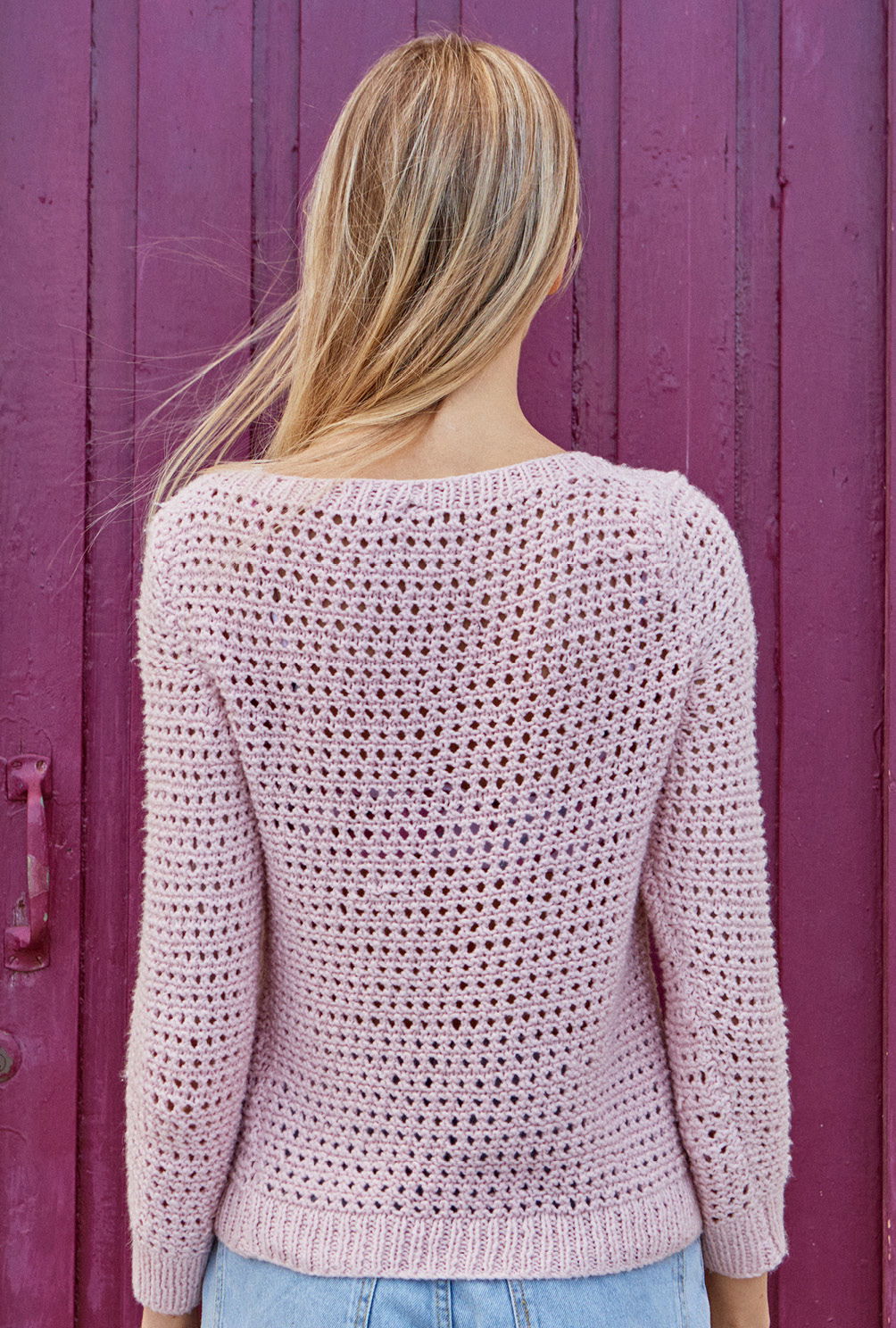 Völlig zeitlos und wunderbar anpassungsfähig zeigt sich der rosafarbene Pulli in einem schlichten Lochmuster, das durch Rippenblenden eingefasst wird – auch für Strickneulinge kein Hexenwerk. Begonnen wird jedes Teil mit dem Rippenbündchen, gefolgt vom Lochmuster. Das Muster ist nicht schwierig zu stricken und in der Anleitung zudem ganz genau Reihe für Reihe beschrieben. Mit Nadelstärke 4,5 und dem weichen Baumwollgarn geht es auch zügig voran. Lediglich bei den Ab- und Zunahmen muss darauf geachtet werden, dass sich die Umschläge und zusammengestrickten Maschen immer ausgleichen. Sind alle Teile fertig gestrickt, werden noch die Nähte geschlossen und aus den Maschen des Halsausschnitts die Rippenblende herausgestrickt. Fertig ist der luftige, romantische Sommerpulli!