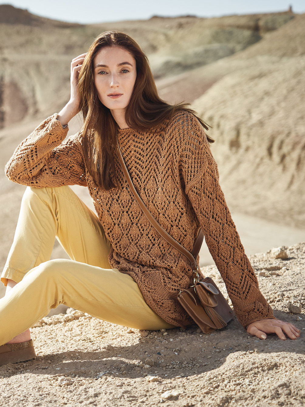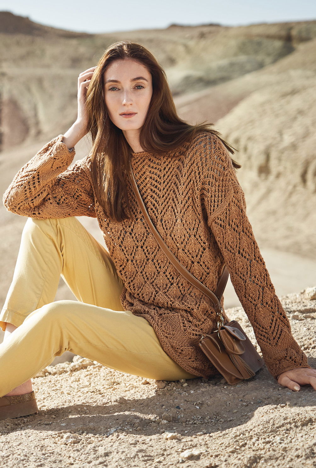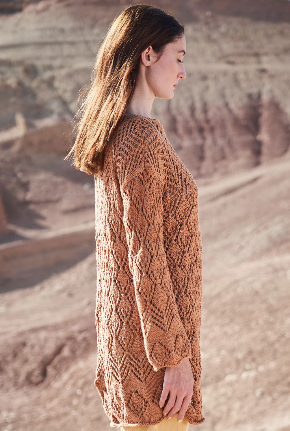 Lust auf Veränderung? Kein Problem mit diesem zimtbraunen Longpulli, der über ein außerordentlich fantasievolles Spiel mit Lochrauten und -zacken verfügt und uns bereits während des Strickens gedanklich auf orientalische Gewürzmärkte entführt…Gestrickt wird der leichte Pulli in Einzelteilen, wobei jedes mit einem kleinen Abschnitt glatt rechts gestrickter Reihen beginnt. Dann folgt das abwechslungsreiche Ajourmuster. Hier dürfen wir dann nicht mehr zu sehr vom Urlaub träumen, denn das benötigt unsere Aufmerksamkeit. Die übersichtliche Strickschrift unterstützt uns jedoch dabei, stets im Muster zu bleiben. Haben wir alle Teile fertig gestrickt, müssen nur noch die Nähte geschlossen werden und der Halsausschnitt bekommt noch eine Reihe Krebsmaschen. Am besten bekommt der Pullover vor den ersten tragen noch ein kleines Bad und wird liegend schön ausgestrichen getrocknet. Dadurch legt sich das schöne Lochmuster richtig und entfaltet seine ganze Schönheit.