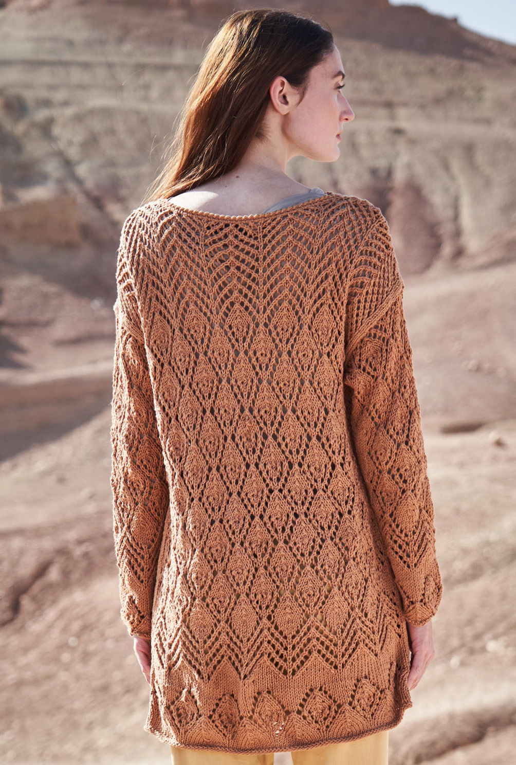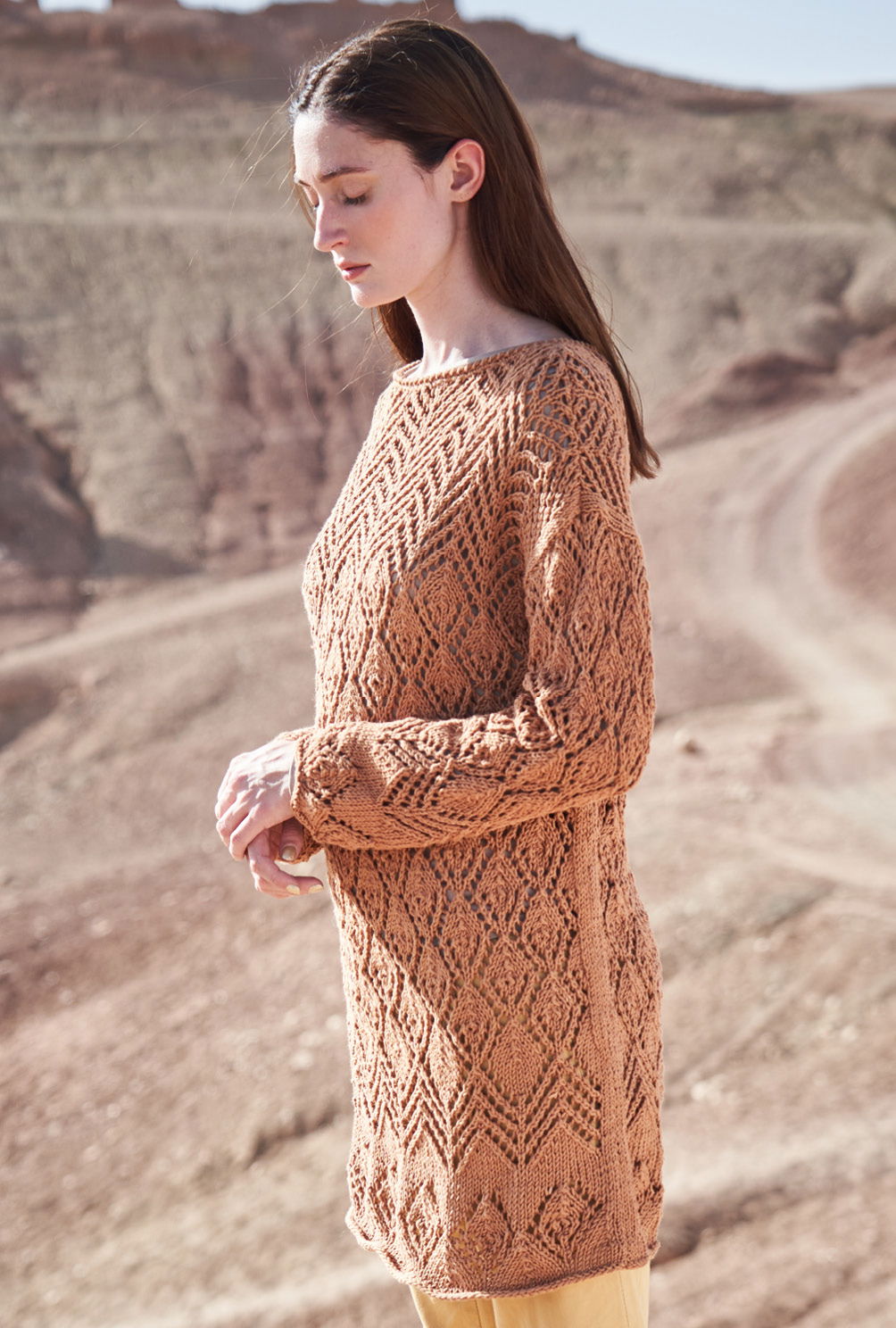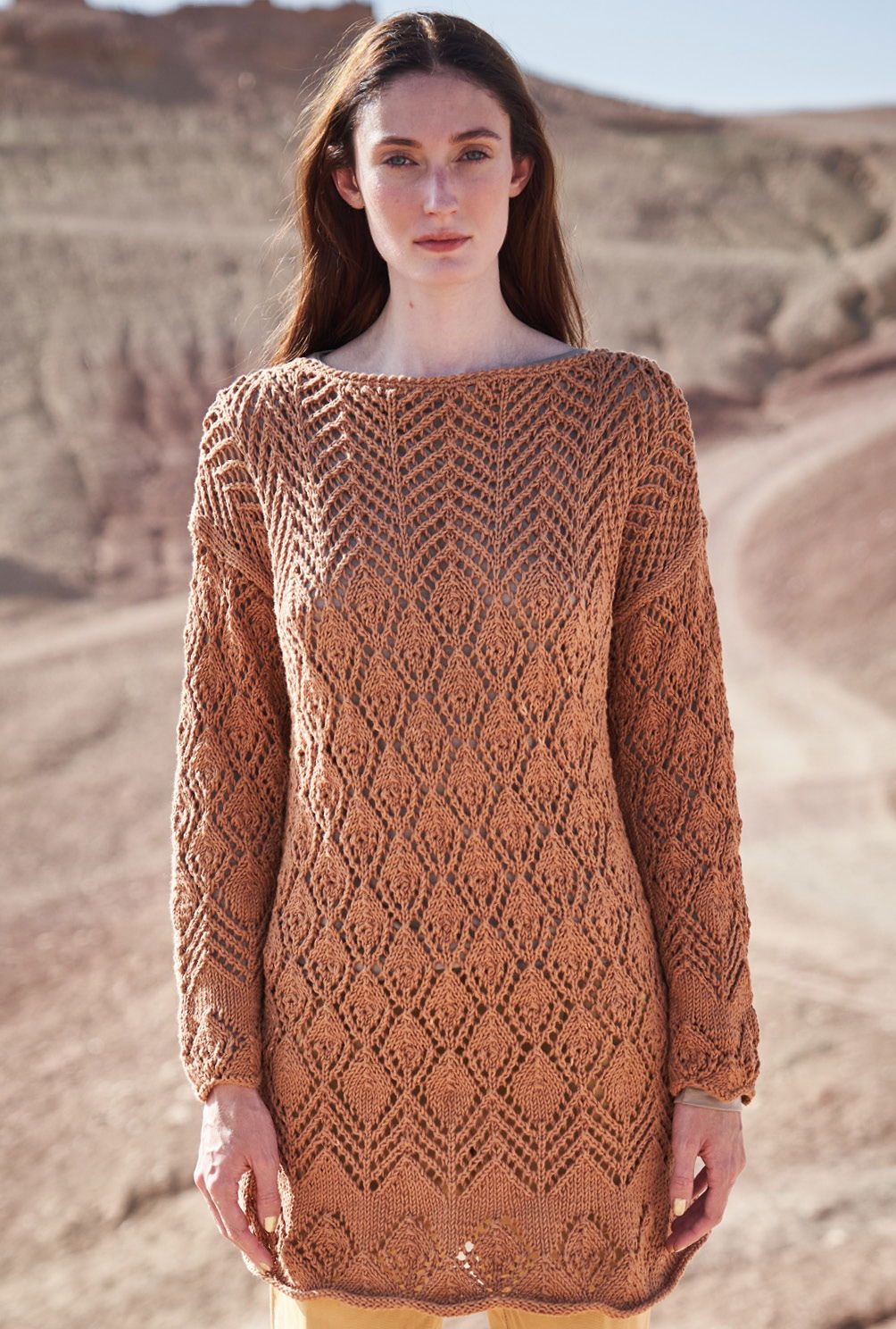 Lust auf Veränderung? Kein Problem mit diesem zimtbraunen Longpulli, der über ein außerordentlich fantasievolles Spiel mit Lochrauten und -zacken verfügt und uns bereits während des Strickens gedanklich auf orientalische Gewürzmärkte entführt…Gestrickt wird der leichte Pulli in Einzelteilen, wobei jedes mit einem kleinen Abschnitt glatt rechts gestrickter Reihen beginnt. Dann folgt das abwechslungsreiche Ajourmuster. Hier dürfen wir dann nicht mehr zu sehr vom Urlaub träumen, denn das benötigt unsere Aufmerksamkeit. Die übersichtliche Strickschrift unterstützt uns jedoch dabei, stets im Muster zu bleiben. Haben wir alle Teile fertig gestrickt, müssen nur noch die Nähte geschlossen werden und der Halsausschnitt bekommt noch eine Reihe Krebsmaschen. Am besten bekommt der Pullover vor den ersten tragen noch ein kleines Bad und wird liegend schön ausgestrichen getrocknet. Dadurch legt sich das schöne Lochmuster richtig und entfaltet seine ganze Schönheit.