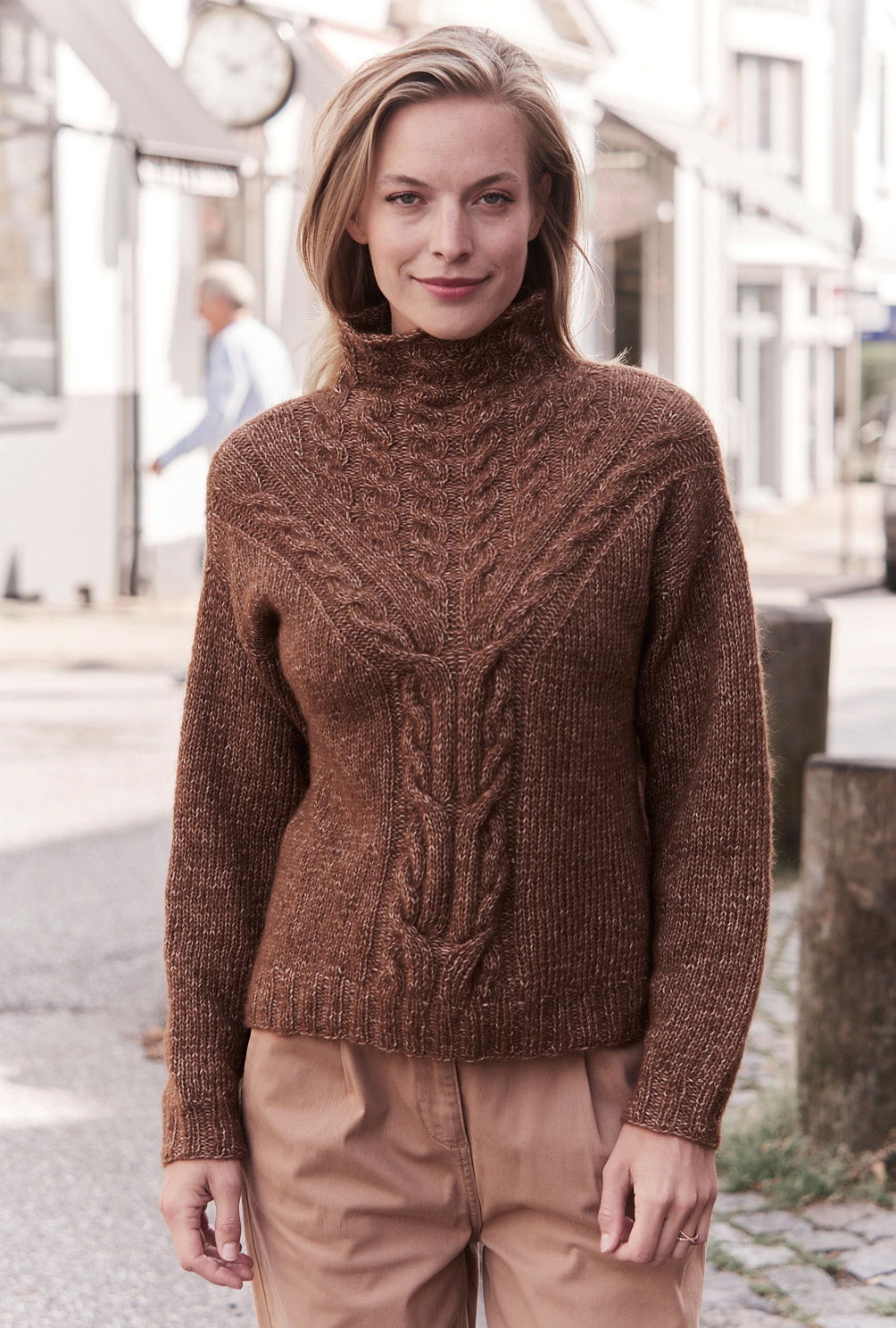 Dieser aus meliertem, haselnussbraunem Garn gestrickte Pulli ist ein Leichtgewicht. Er ist aus einem Alpaka-Baumwolle-Mischgarn gearbeitet. Im Vorderteil verzweigt sich der breite Zopf in Brusthöhe und bildet eine zunehmend breiter werdende v-förmige Passe bis zu den überschnittenen Schultern. Besonders schön ist die Halspartie, in der die Zöpfe kontinuierlich in einen Turtleneck-Kragen weiterlaufen. Ansonsten wird glatt rechts gestrickt, die Bündchen an Saum- und Ärmelrändern bestehen aus 2/2-Rippen. Eine Anleitung dazu kann für die Größen 36/38 und 40/42 sowie 44/46 downgeloadet werden.
