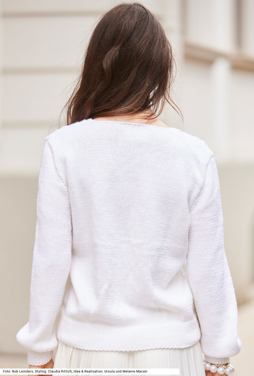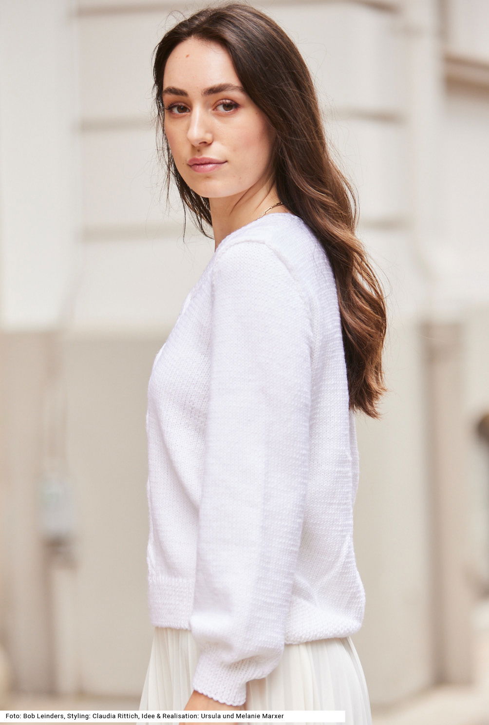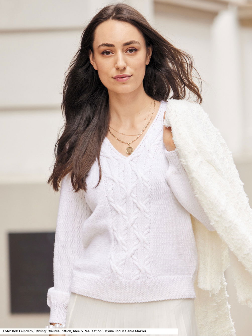 Sinnlicher Modetrend: Der tiefe V-Ausschnitt streckt die Silhouette durch die vertikale Blickführung und ist ein echter Dekolleté-Schmeichler. Ein weiteres Highlight bietet das plastische Zopfmuster. Das benötigt zwar ein wenig Aufmerksamkeit und Erfahrung, aber die klare Strickschrift in der Anleitung hilft dabei, stets den Überblick zu behalten. Gestrickt wird in einzelnen Teilen von unten nach oben, der Patentrand des V- Ausschnitts wird gleich mitgestrickt – praktisch und schön zugleich. Sind alle Teile fertig werden noch die Nähte geschlossen und der hintere Halsausschnitt mit einem I-Cord versehen