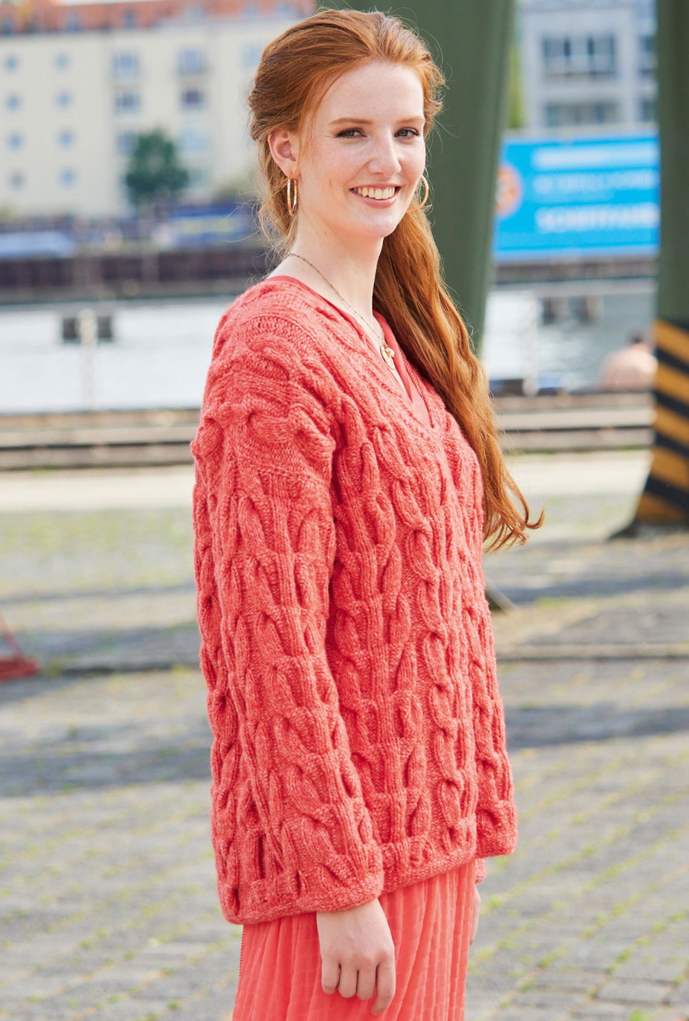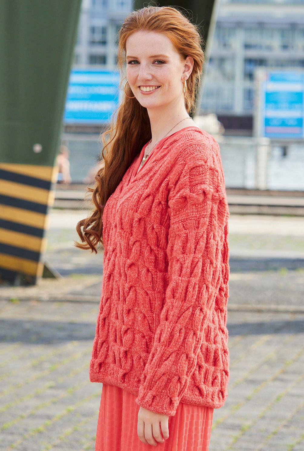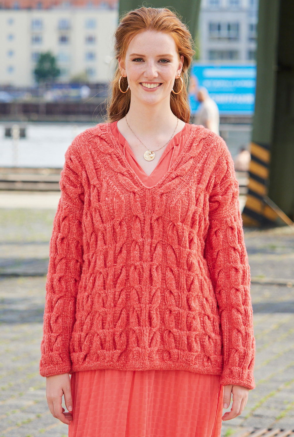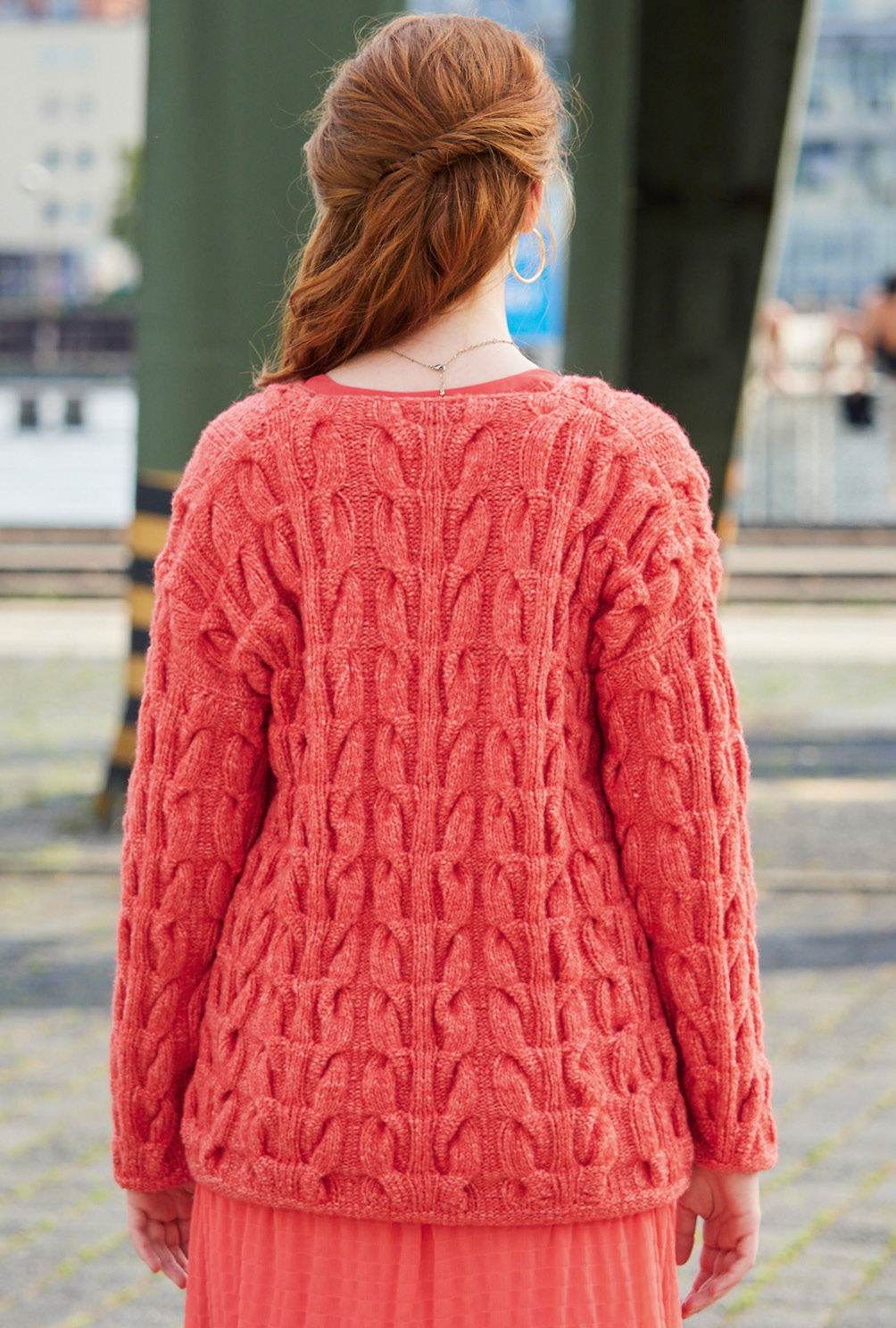 Die Masche dieses Pullovers überzeugt durch komfortables Volumen und schöne Details. Bei diesem V-Ausschnittpulli sind es die fantasievollen Zöpfe, die allover zum Einsatz kommen. Sanft meliertes Rosa und Rot lassen dem Muster Raum, um zur Geltung zu kommen, Alpaka, Schurwolle und Baumwolle sorgen gemeinsam für ebenso angenehmen Trage- wie Strickgenuss. Das Zopfmuster benötigt zwar etwas Aufmerksamkeit, ist aber nicht sehr kompliziert zu stricken und die übersichtliche Strickschrift hilft zusätzlich dabei, stets den Überblick zu behalten. Gestrickt wird in einzelnen Teilen von unten nach oben. Sind alle vier Teile fertig gestrickt, werden noch alle Nähte geschlossen und der Halsausschnitt mit Kettmaschen umhäkelt.
