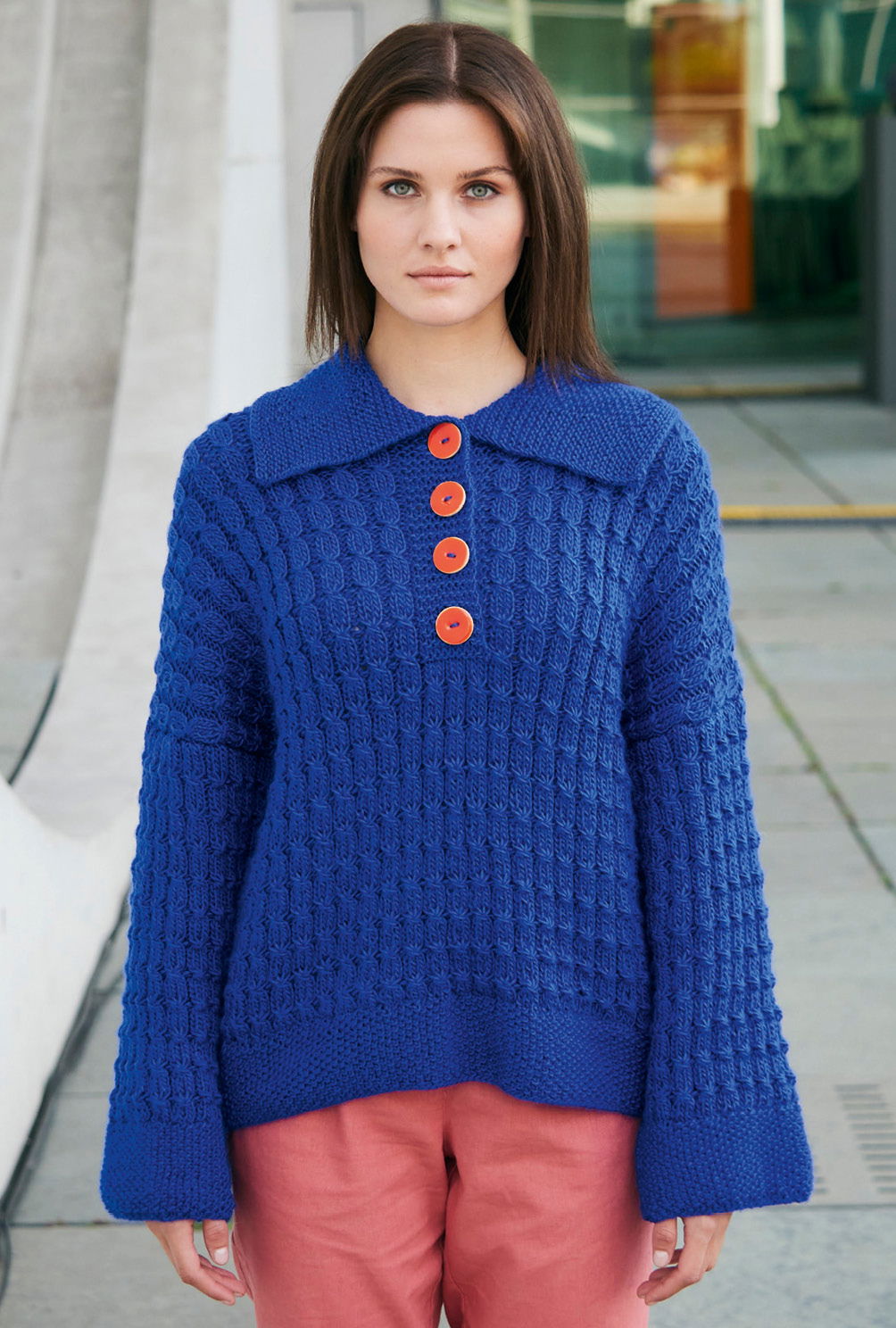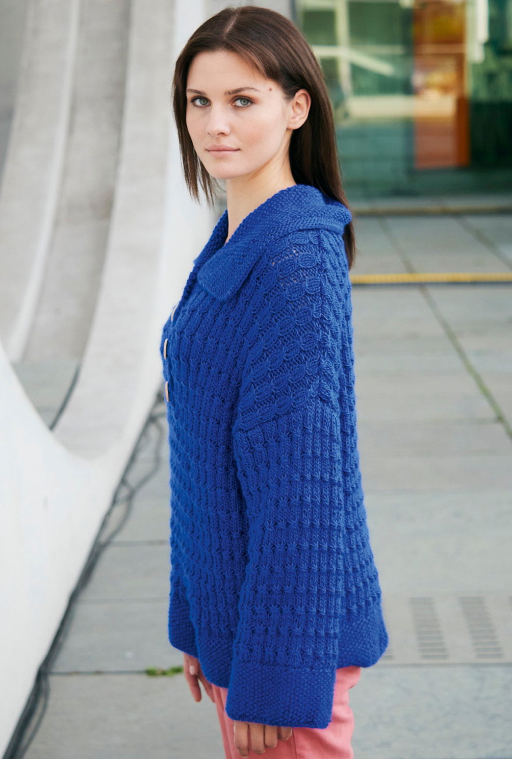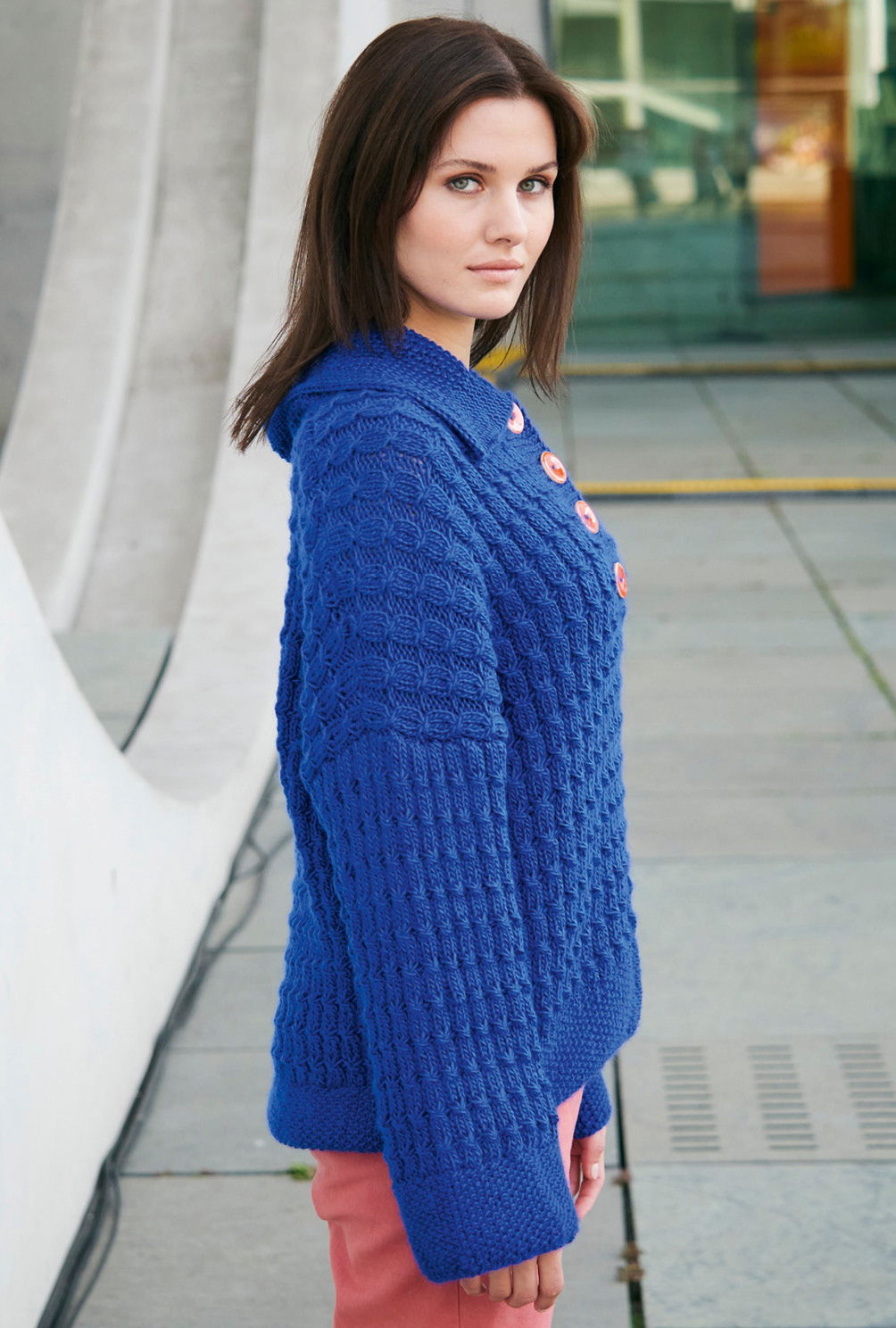 Während der Pulli aus Schurwolle-Mischgarn mit seinem strahlenden Royalblau punktet, bilden die Knöpfe in Koralle einen modischen Konterpart. Der Schnitt ist oversized, auch bei den Ärmeln, die ganz gerade enden. Ein schmales, einfach zu strickendes Zopfmuster sowie die gerade endenden Ärmel bewirken, dass die Schultern überfallen; dasselbe Zopfmuster wiederum zieht sich an den Ärmel leicht zusammen. Alle Bündchen und auch der Kragen werden im kleinen Perlmuster gearbeitet, der Kragen bekommt noch einen Rand in kraus rechts. Auch die Knopfleiste ist kraus rechts gestrickt. Die Anleitung dazu gibt es für die Größen 38/40, 42/44 und 46/48.