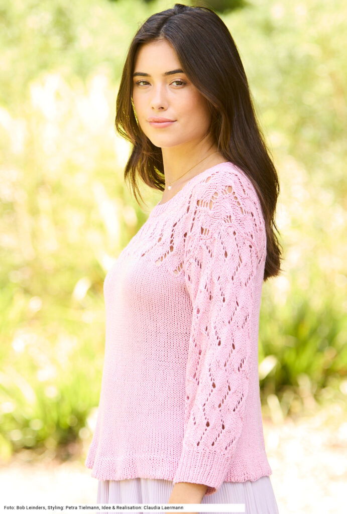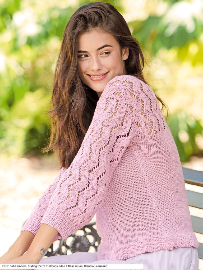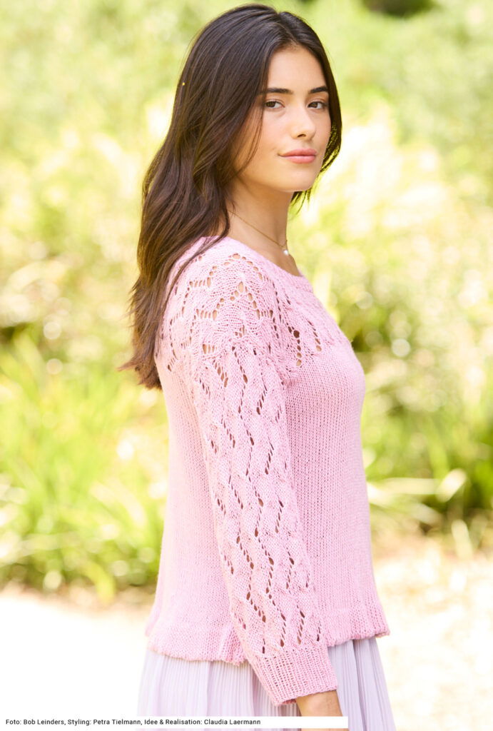 Das Ajourmuster dieser Pullis betont die Schulter- und Halspartie besonders, denn die Ärmel als auch die Passe sind aus diesem Muster gestrickt. Der Bund wird im Doppelstrick gearbeitet, danach geht es zunächst glatt rechts weiter. Ärmelbündchen und Ausschnittblende sind hingegen im 1/1-Rippenmuster gearbeitet. Die weiten Ärmel beginnen am Bund mit wenigen Maschen, danach werden viele Maschen zugenommen und gerade weitergestrickt. Das Garn besteht aus Viskose, die aus recyceltem Leinen gewonnen wird, und Leinen. Eine Anleitung gibts für die Größen 36/38, 40/42 und 44/46.