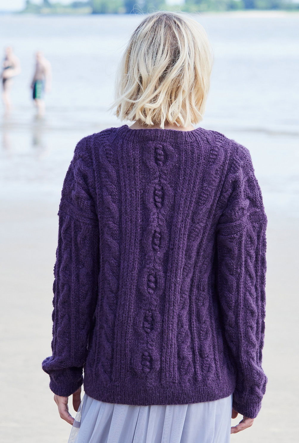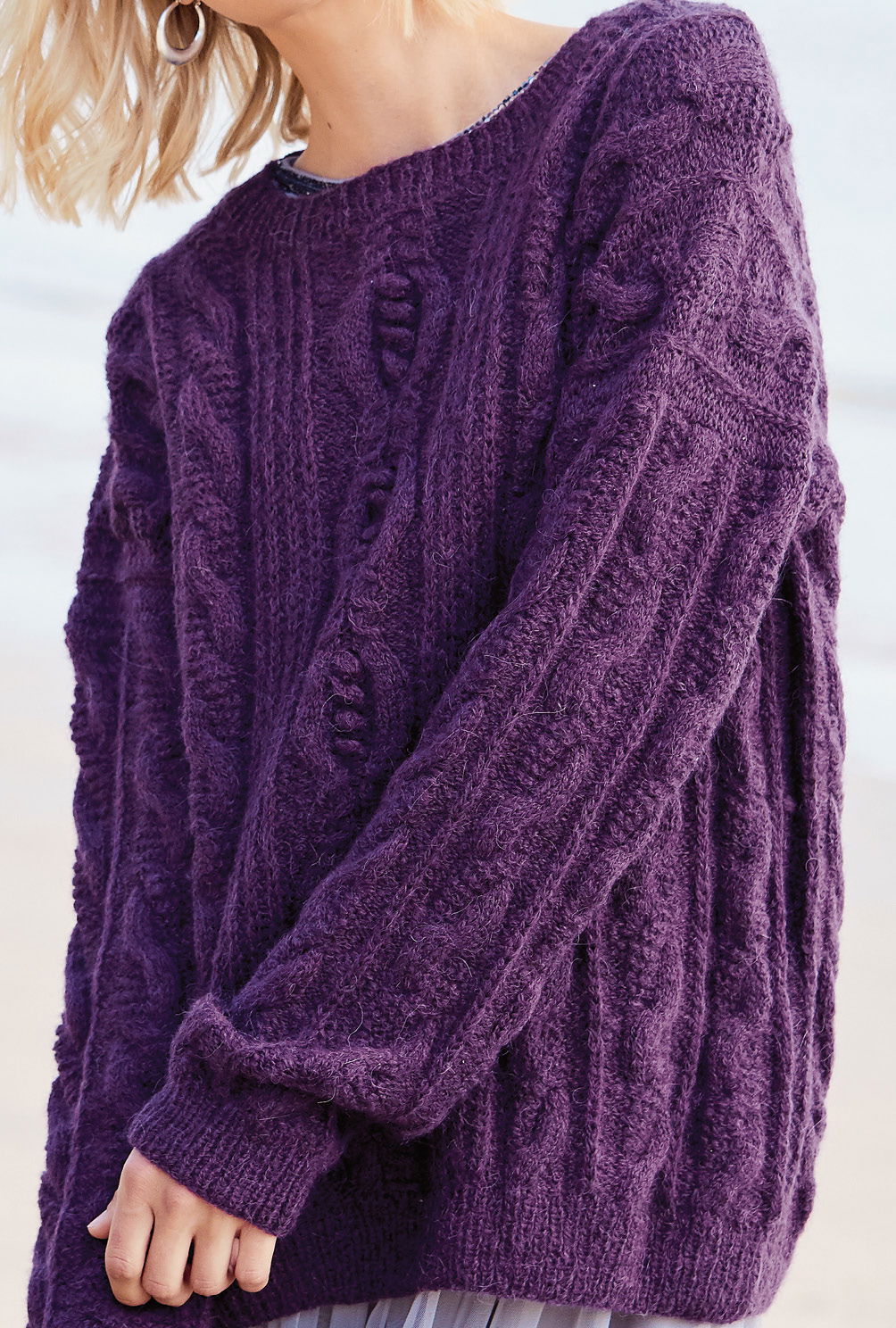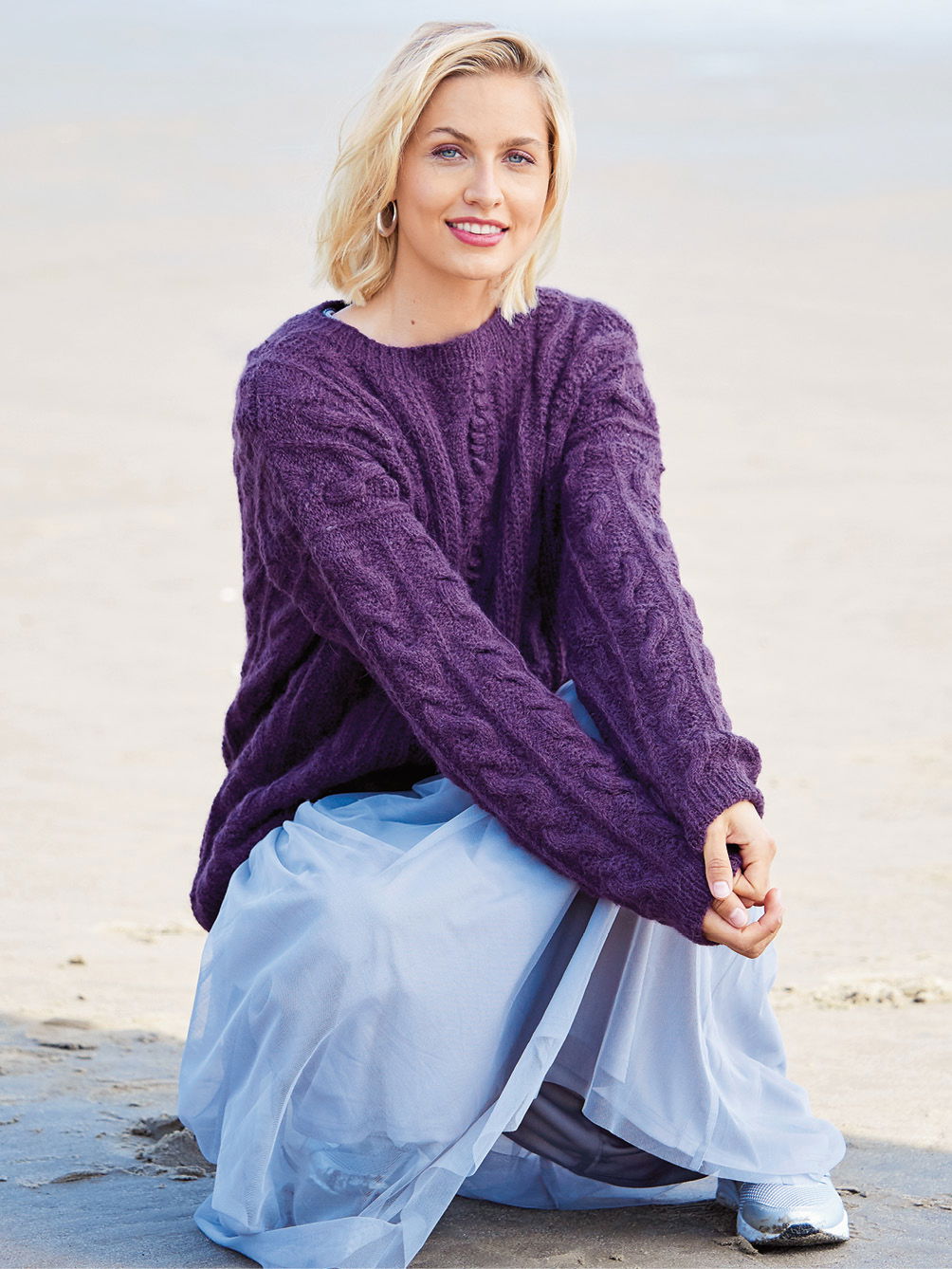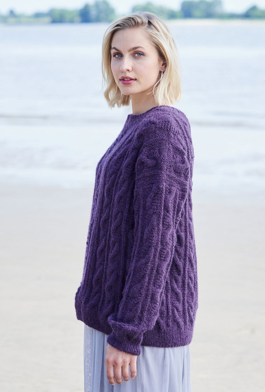 Der Mix aus Zöpfen und Halbpatentmuster lässt beim Stricken keine Langeweile aufkommen – was vor allem versierte Strickerinnen, denen einfache Muster zu simpel sind, freuen wird. Und das Ergebnis kann sich sehen lassen: Ein lässiger Allrounder, der durch leuchtendes Violett zusätzliche Faszination ausübt. Gestrickt mit einer Alpaka-Schurwoll-Mischung – was braucht es mehr für einen extraweiten Rundum-Wohlfühl-Pulli? Alle Bündchen sind im 1/1-Rippenmuster gearbeitet, der Schnitt ist gerade, was auch das Einnähen der Ärmel erleichtert. Die Anleitung ist zum Download bereit für die Größen 38/40 und 42/44.