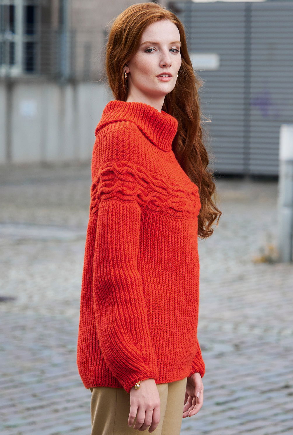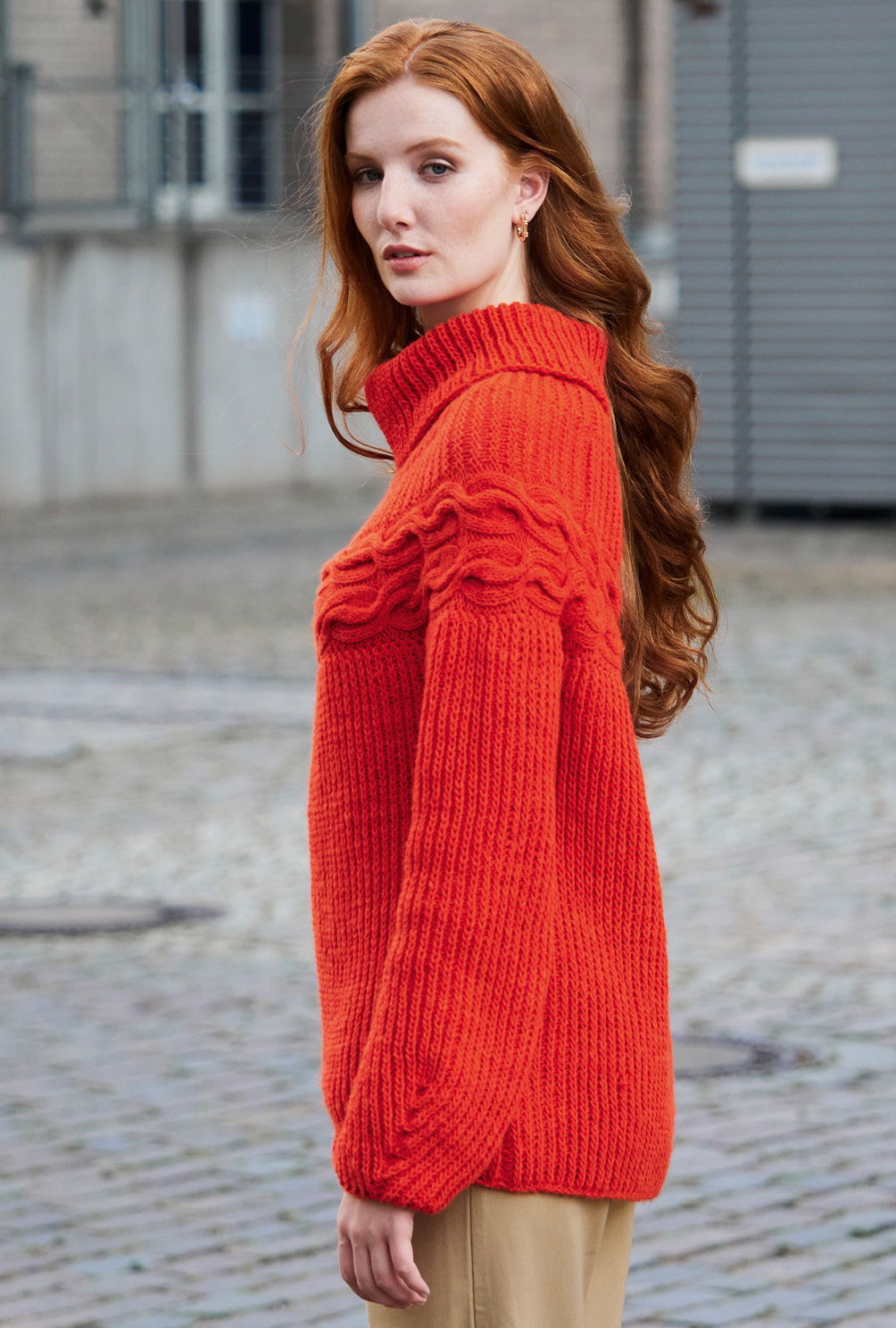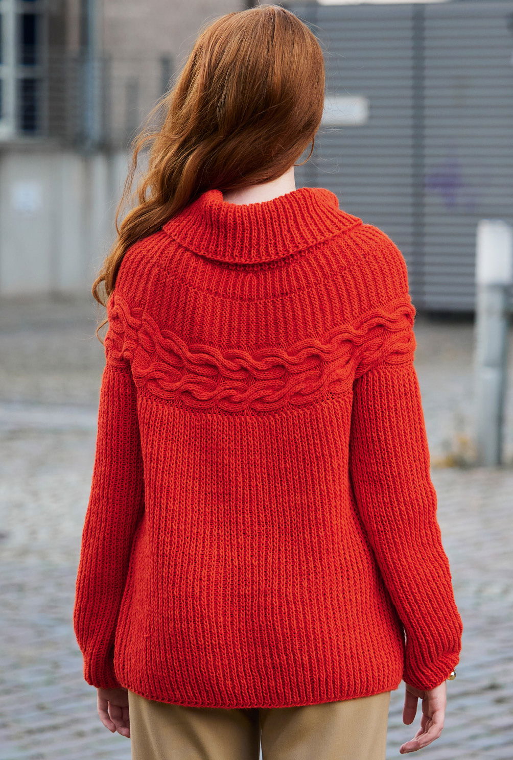 Das beste Rezept gegen kalte Wintertage: Knallrot! Hier als Pulli mit «patenten» Rippen und markanter Zopfpasse, die gekonnt den Schulterbereich betont. Und was für ein Strickspaß! Erst werden Rückenteil, Vorderteil und Ärmel bis zur Passenhöhe einzeln im Halbpatent gestrickt. Danach dann quer die Zopfpasse. Jetzt die Nähte schon einmal schließen, die Zopfpasse an den oberen Pulloverrand nähen, für die obere Passe die Maschen aus der Zopfpasse herausstricken und nun immer im Halbpatent in Runden stricken. Für die quer gestrickte Passe mit den Zöpfen beinhaltet die Anleitung eine klare und übersichtliche Strickschrift.