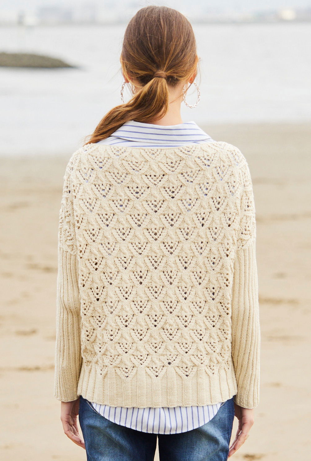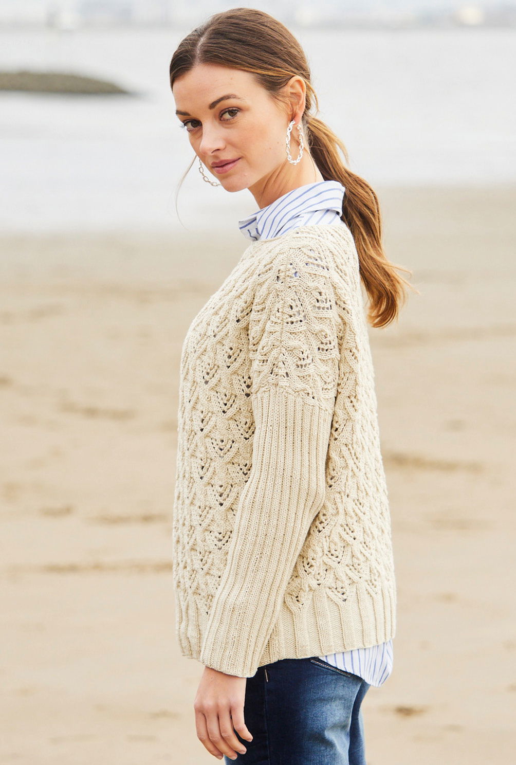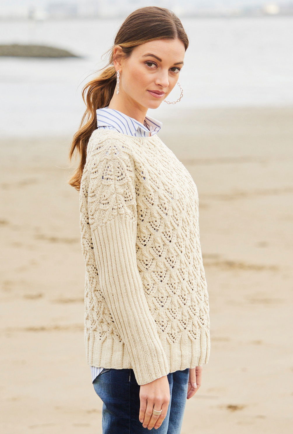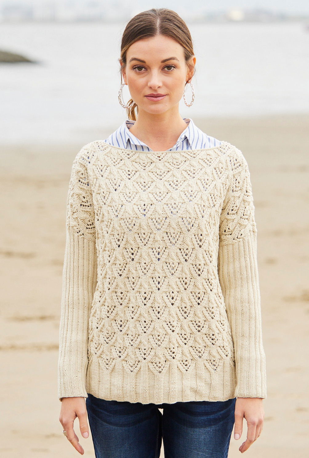 Sabrina Strickjournal Pullover mit U-Boot-Ausschnitt und Lochmuster in Wollweiß