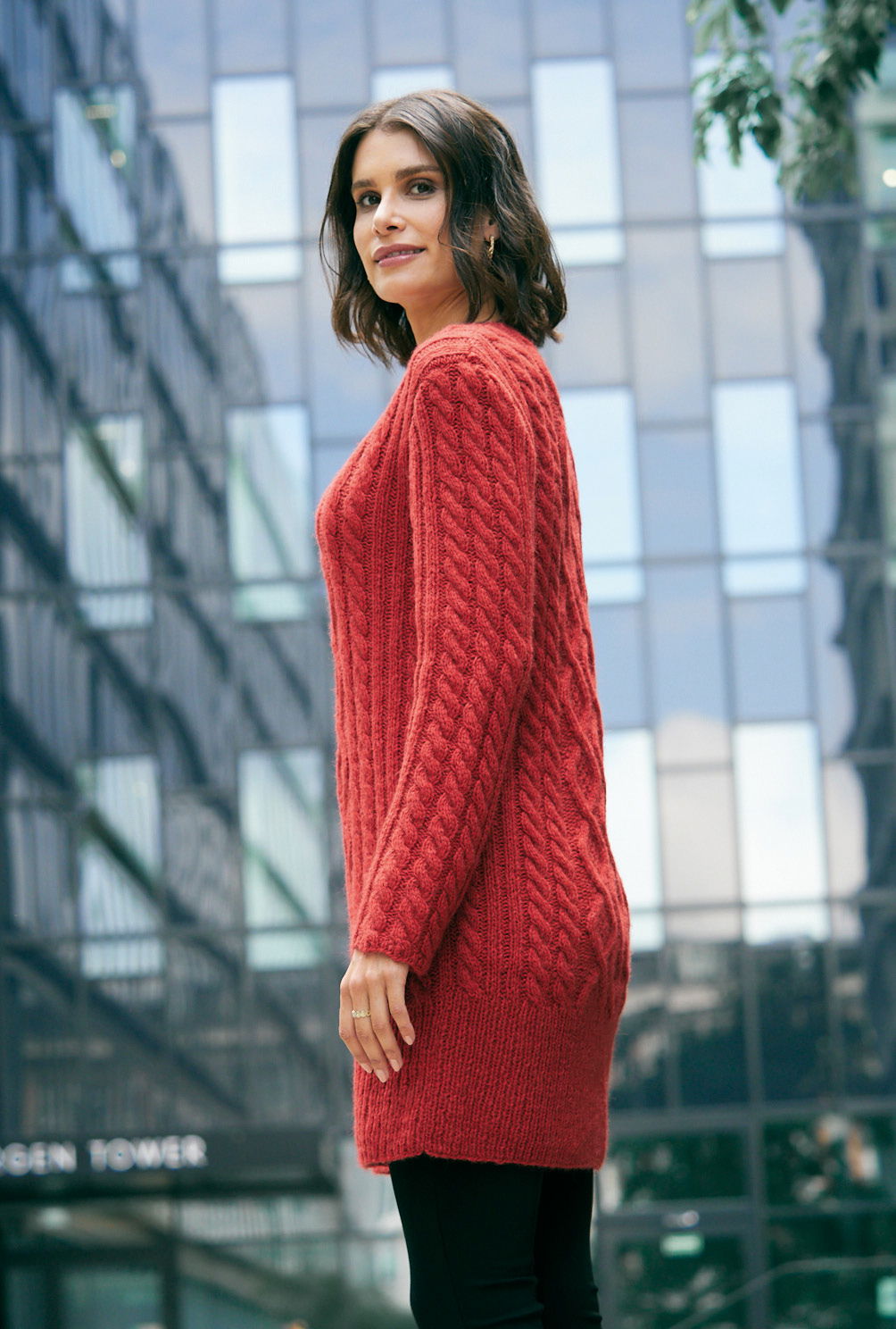 Der rote Longpulli aus besonders weichem Alpaka-Baumwolle-Schurwolle-Mischgarn lebt von seiner markanten Musterung aus Zöpfen, breiten Rippen und Aranrautenmuster mit Perlmusterfüllung in der Mitte von Vorder- und Rückenteil. Er ist besonders figurbetont geschnitten und sitzt perfekt sowohl am Rumpf als auch an den Schultern, dank der geformten Armkugel. Super dazu: ein Bleistiftrock oder Skinny Jeans. Ein extrahoher Bund, schmale Bündchen an den Ärmeln und eine kleine Blende am Halsausschnitt werden in 1/1-Rippen gearbeitet. Eine Anleitung steht zum Download bereit in den Größen 36/38, 40/42 und 44/46.