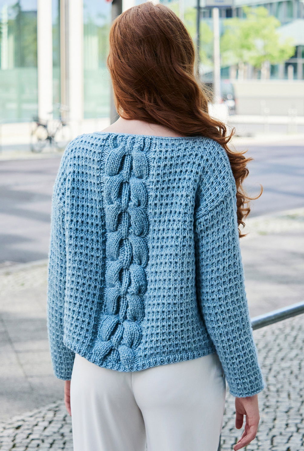 Das voluminöse Schurwoll-Baumwollgarn macht es Strickfans einfach. Denn mit dicken Nadeln geht die Arbeit flott von der Hand und der Sweater mit markantem Zopfstreifen entsteht im Nu. Der schlichte, gerade Schnitt erleichtert das Musterstricken zusätzlich – denn lediglich für die Ärmel müssen Zunahmen gearbeitet werden. Sowohl für das Strukturmuster als auch für den mittleren Zopf enthält die Anleitung eine übersichtliche und klare Strickschrift. Sind alle Teile fertig gestrickt, werden noch alle Nähte geschlossen und der Halsausschnitt mit einer Runde Kettmaschen sauber umhäkelt.