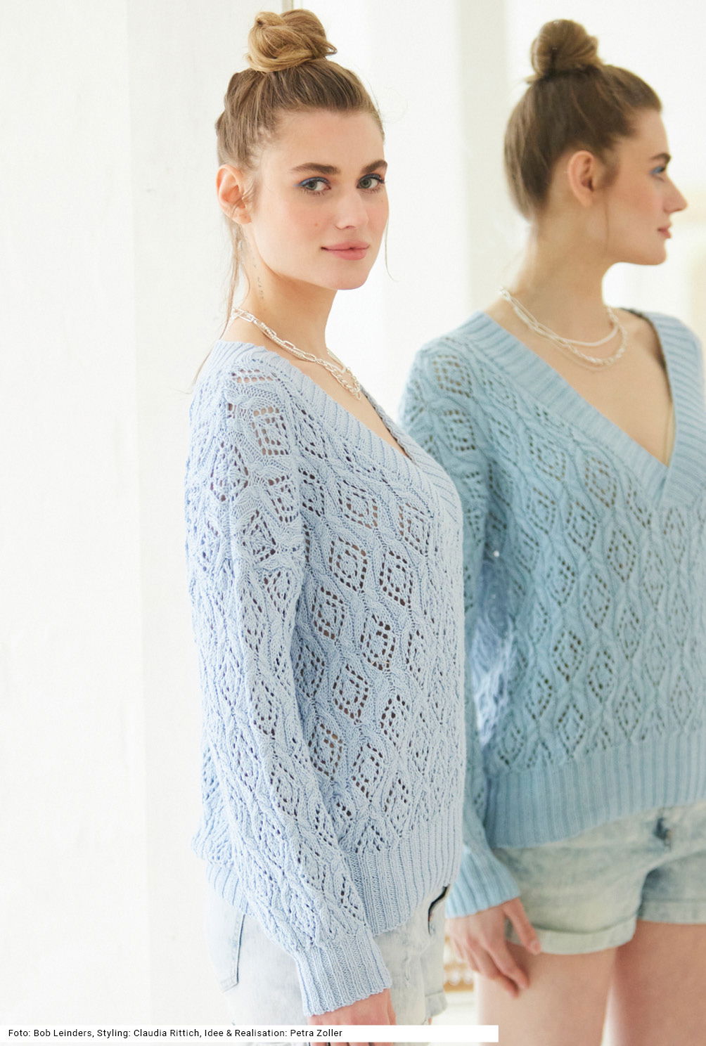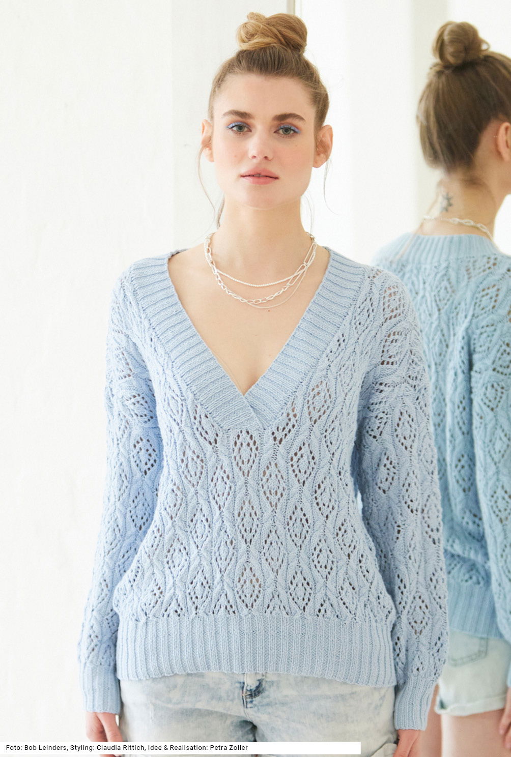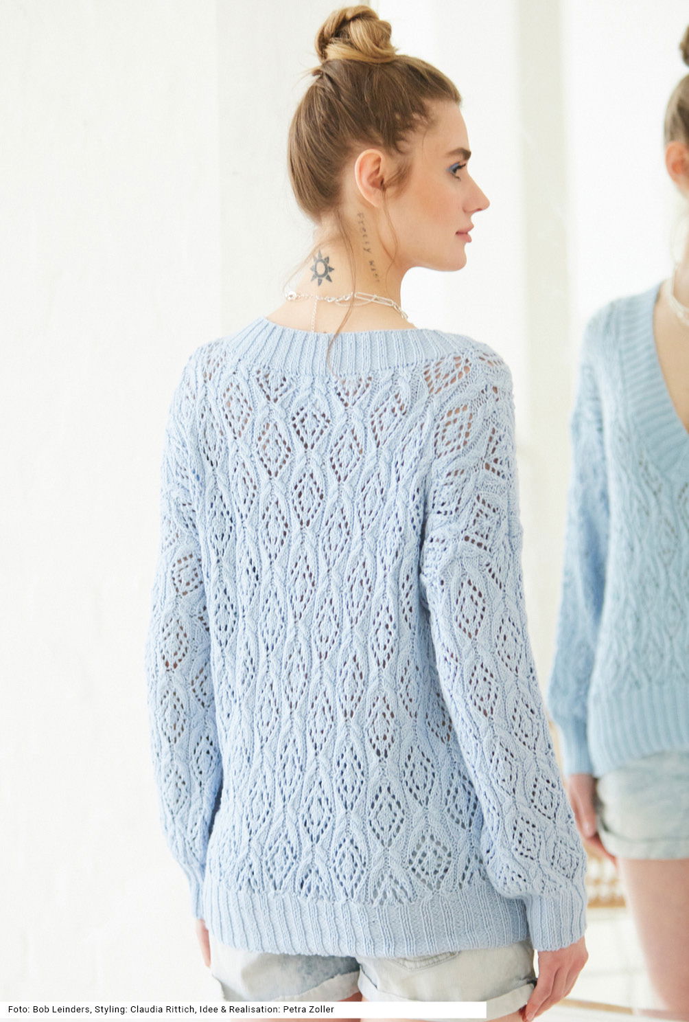 Ajourrauten, kombiniert mit kurzen Zöpfchen, prägen diesen Pullover aus Bio-Baumwolle mit Soja. Das weite, oversized geschnittene Modell wird zu einem deiner Lieblingsstücke avancieren – egal ob zur Jeans oder zum eleganten Rock. Vorder-Rückenteil und auch die Ärmel werden gerade gearbeitet und bekommen erst durch die breiten Rippenbündchen ihre anliegende Form. Neben dem hohen Rippenbund ist auch der tiefe V-Ausschnitt mit einer breiten Rippenblende umrahmt, die an der Spitze übereinanderläuft. Eine Anleitung kann für die Größen 38/40, 42/44 und 46/48 downgeloadet werden.