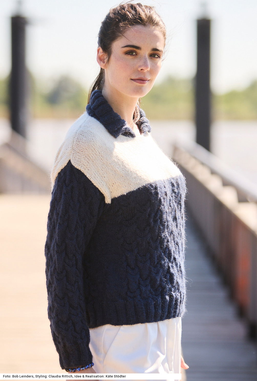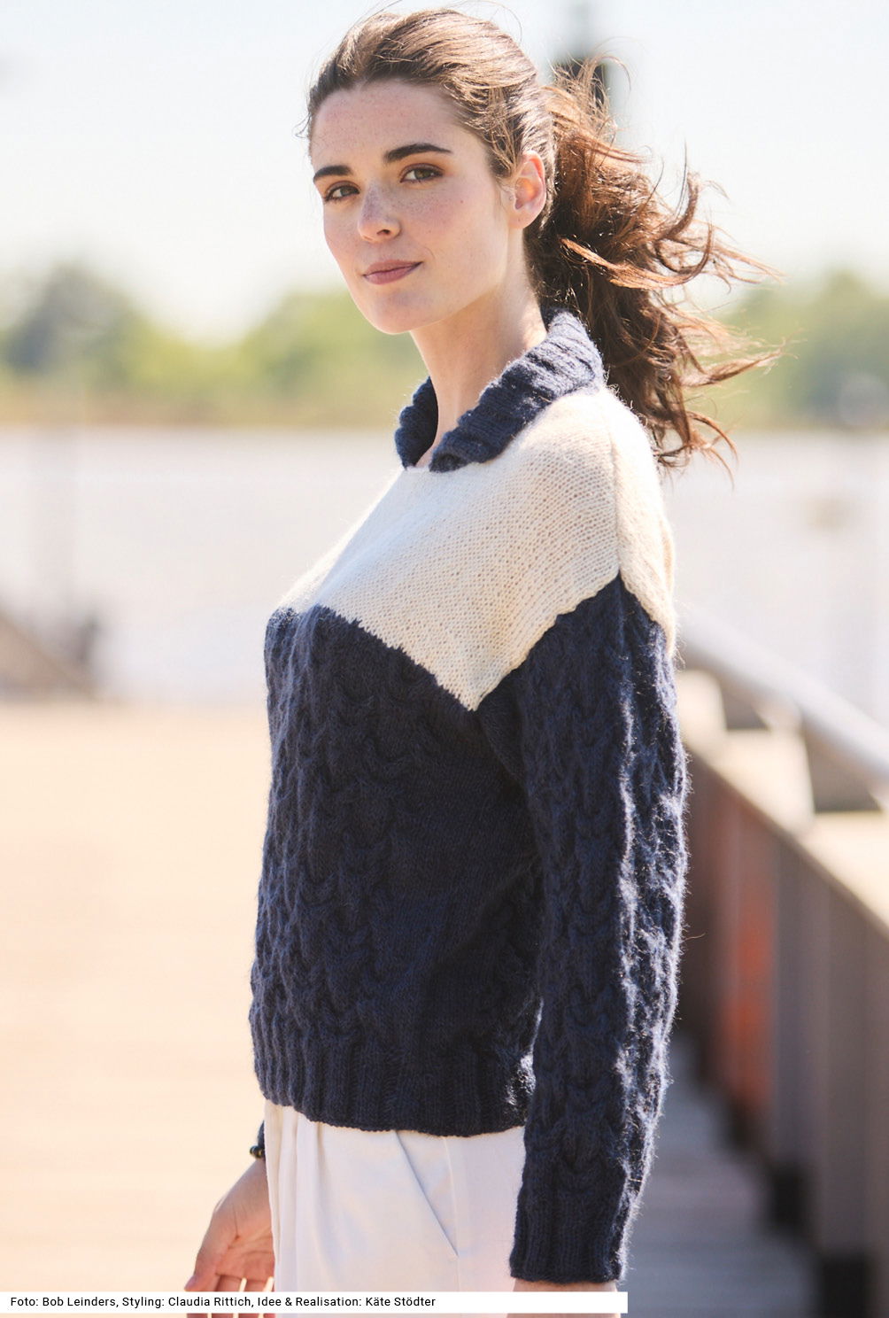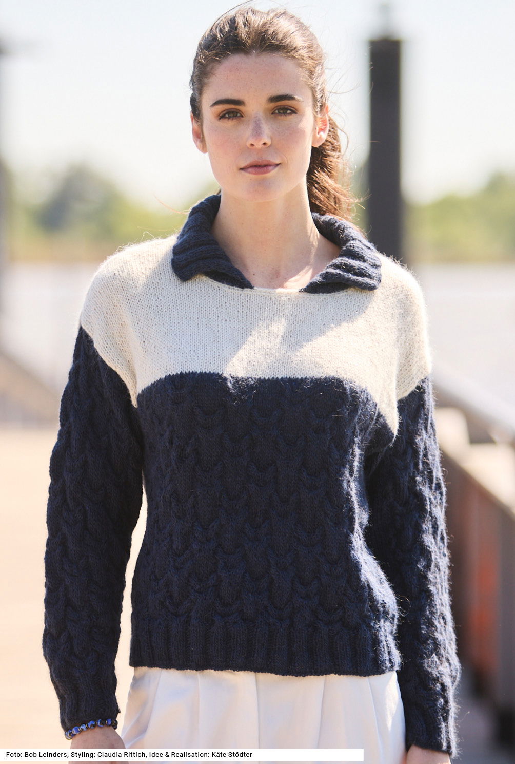 Bei diesem Pulli fällt besonders das dunkle Unterteil im Kontrast zur hellen Brustpartie auf. Noch dazu gibt es für beide Flächen sehr unterschiedliche Muster: unten reliefartig das Zopfmuster und oben schlicht glatt rechts. Bevor der Umschlagkragen angestrickt wird, bekommt der Halsausschnitt zwei Runden feste Maschen. Der Kragen hat beidseitig einen sauberen Abschluss als I-Cord und ist ansonsten im 3/3-Rippenmuster gearbeitet, so wie auch die Bündchen. Die Anleitung für ein Modell aus Alpaka-Polyamid-Mischgarn gibt es für die Größen 38/40, 42/44 und 46/48.