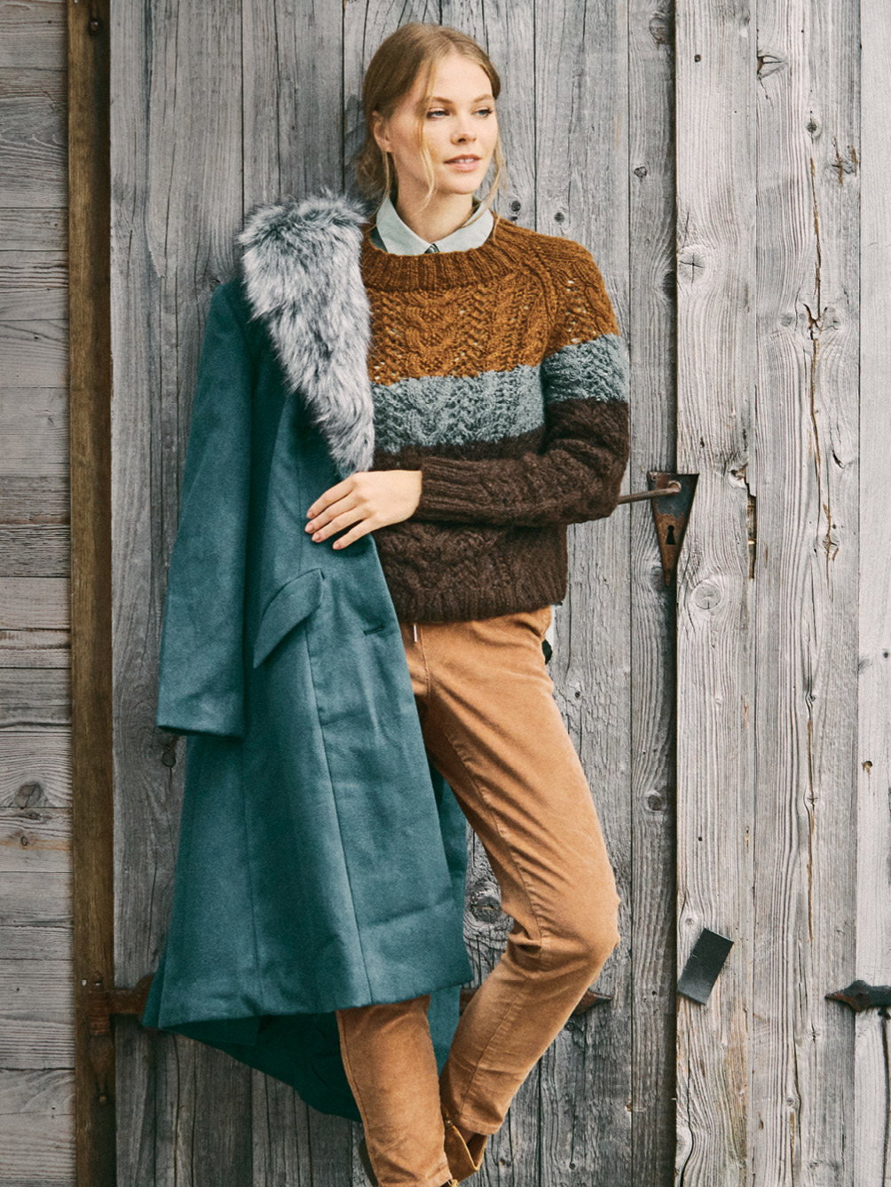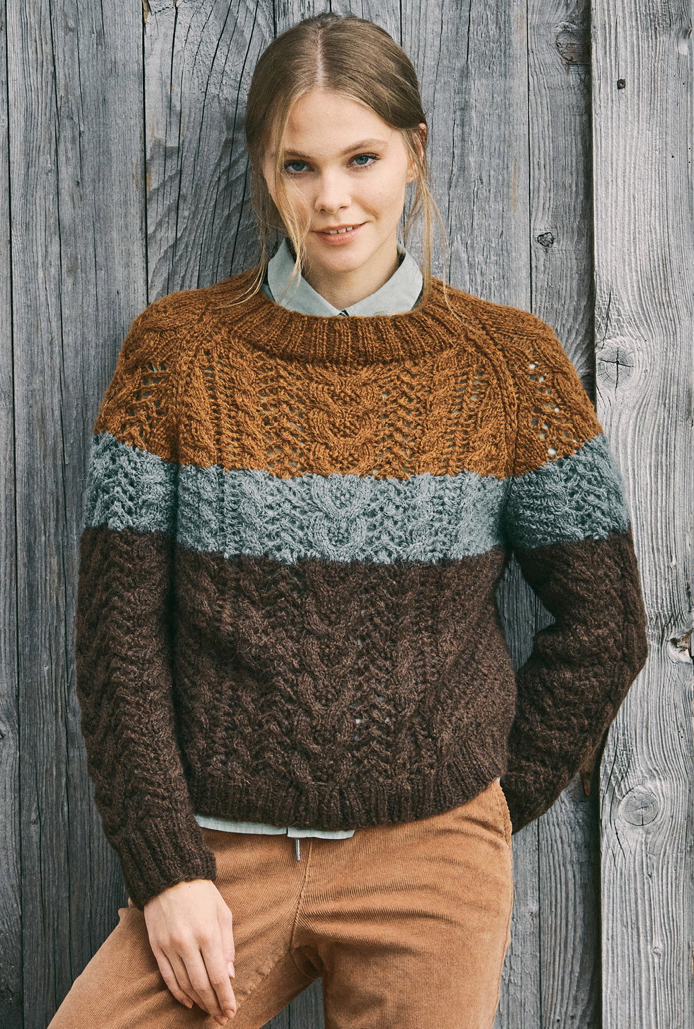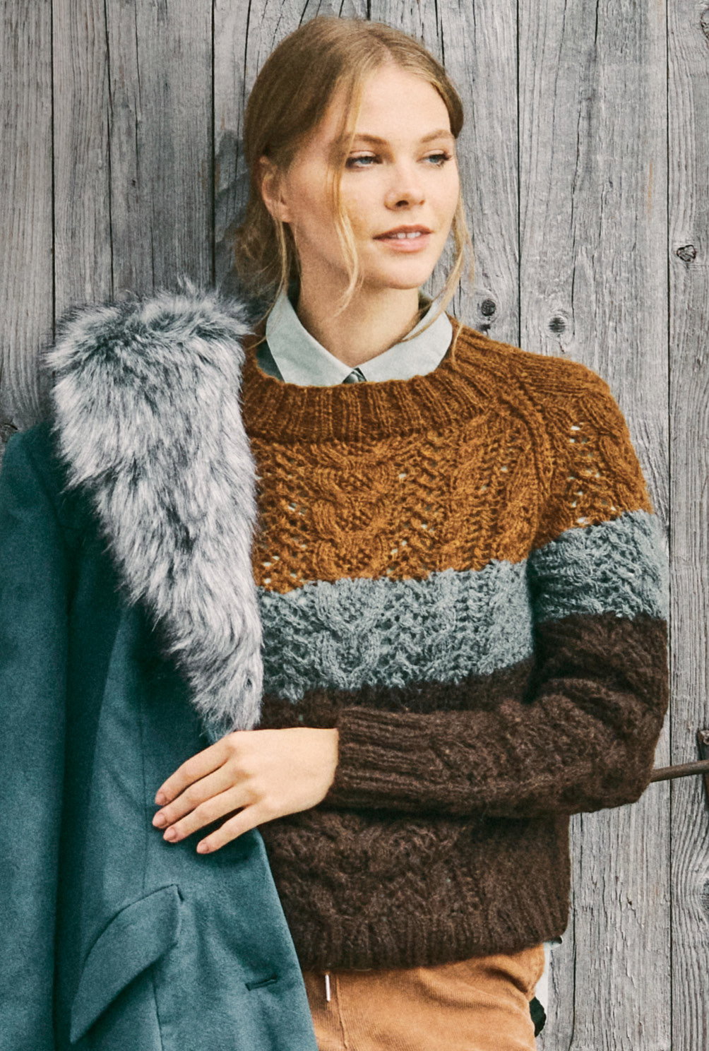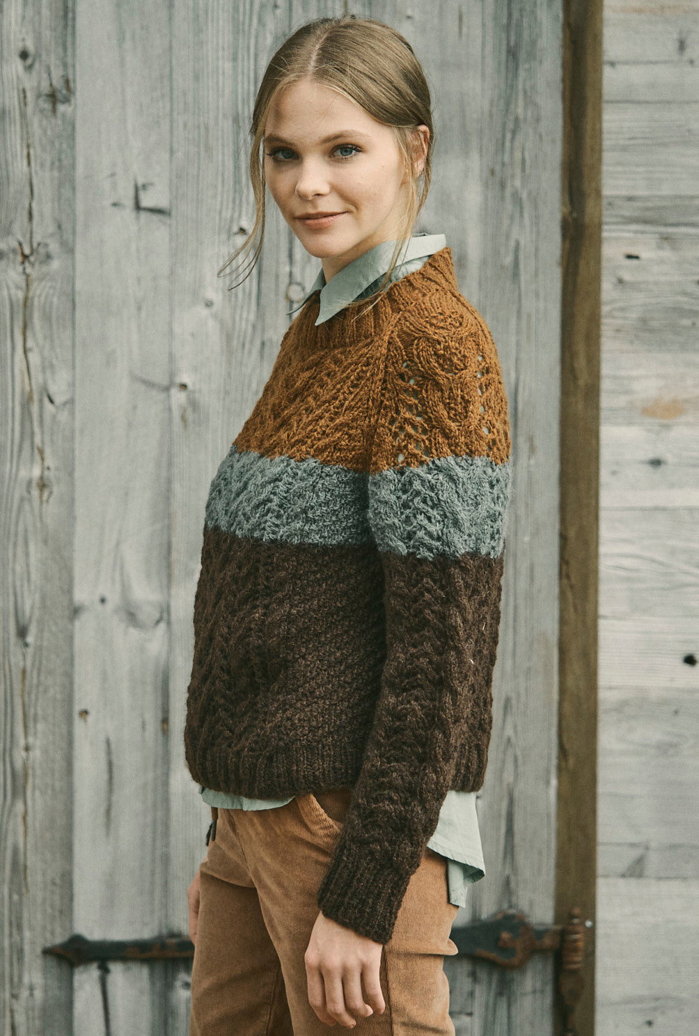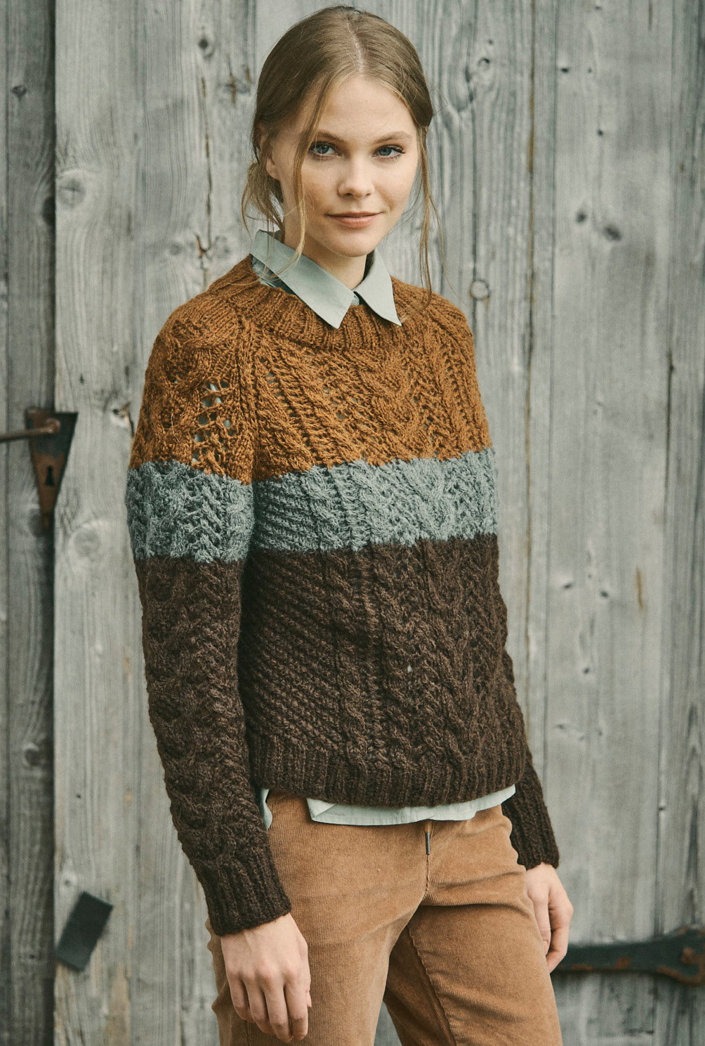 Sabrina Strickjournal Zopfmusterpullover in Waldtönen mit Raglanabnahmen